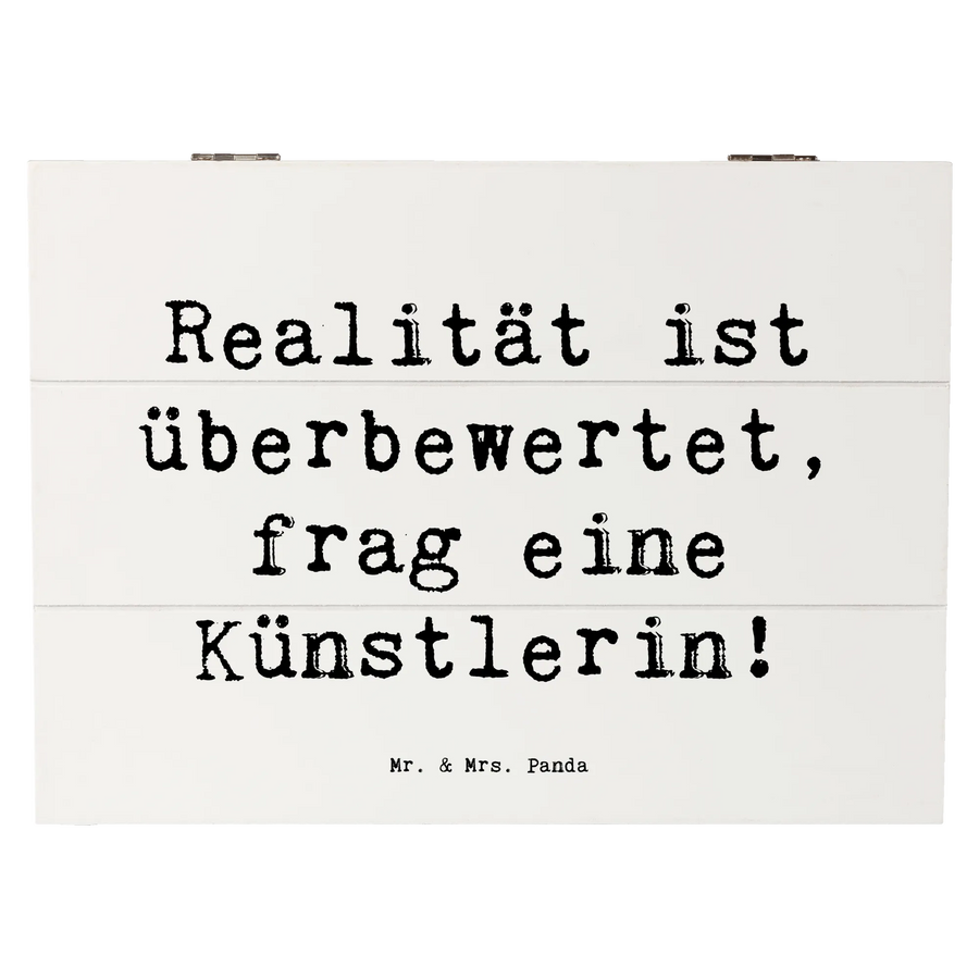 Die wunderschöne Holzkiste von Mr. & Mrs. Panda ist das perfekte Geschenk für kreative Seelen und Kunstliebhaber, besonders für all jene, die den kreativen Beruf der Künstlerin ausüben oder schätzen. Mit einem liebevoll gestaltetem Motiv, das die Aussage 'Realität ist überbewertet, frag eine Künstlerin!' zeigt, wird diese Kiste zu einem wunderbaren Accessoire in jedem Atelier oder Wohnraum.