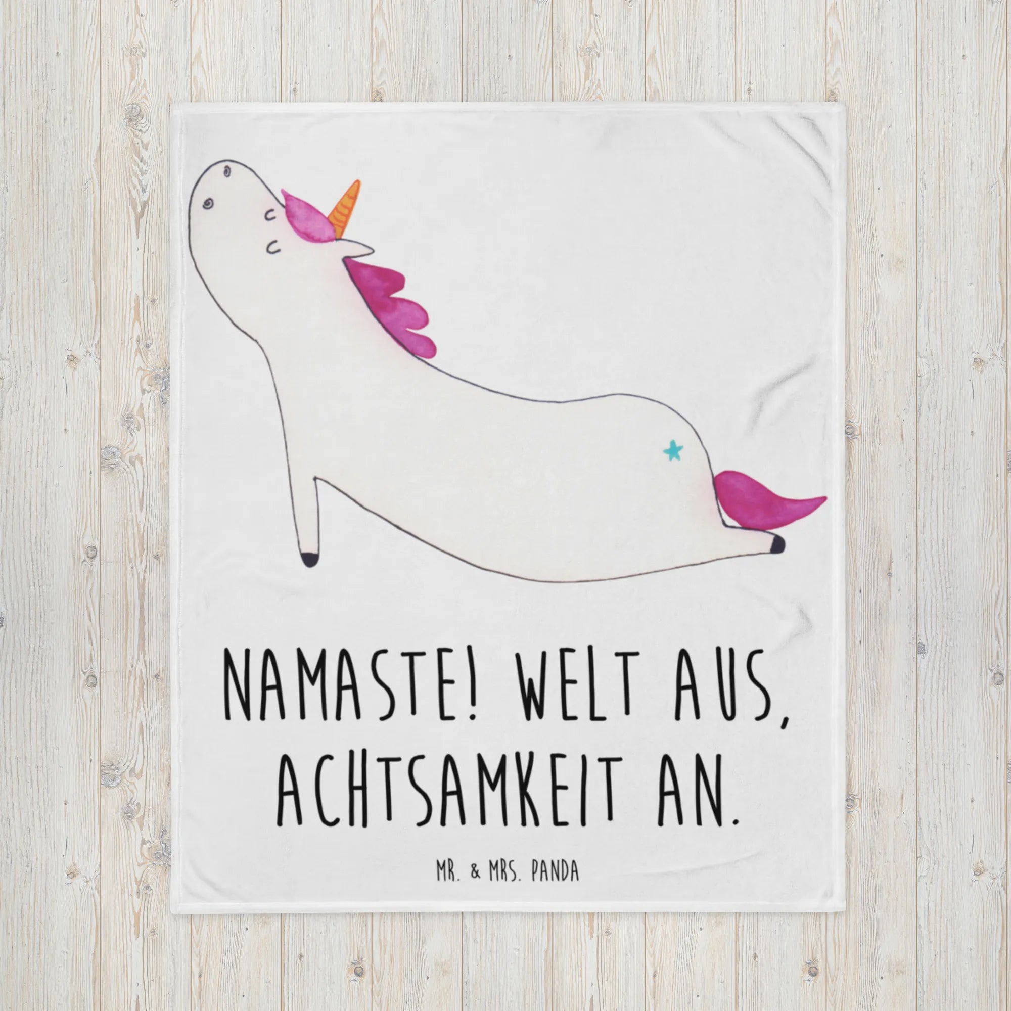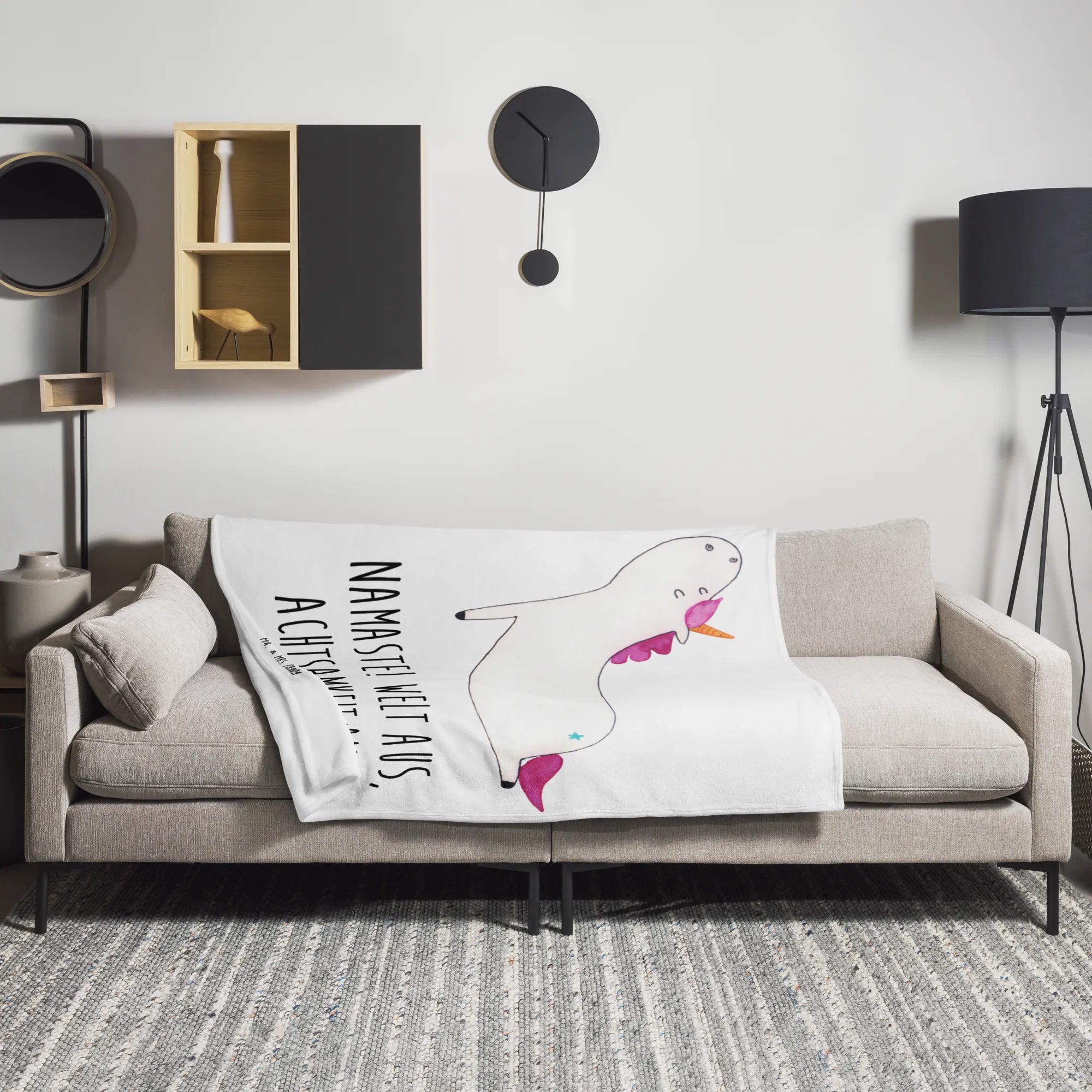 Wenn Du auf der Suche nach einer besonderen Wohndecke bist, die nicht nur warm, sondern auch mit einem zuckersüßen Design daherkommt, dann ist diese Kuscheldecke genau das Richtige! Mit einem entzückenden Motiv von einem Einhorn, das Yoga macht, und dem inspirierenden Slogan 'Namaste! Welt aus, Achtsamkeit an.' sorgt sie sofort für gute Laune und Entspannung.