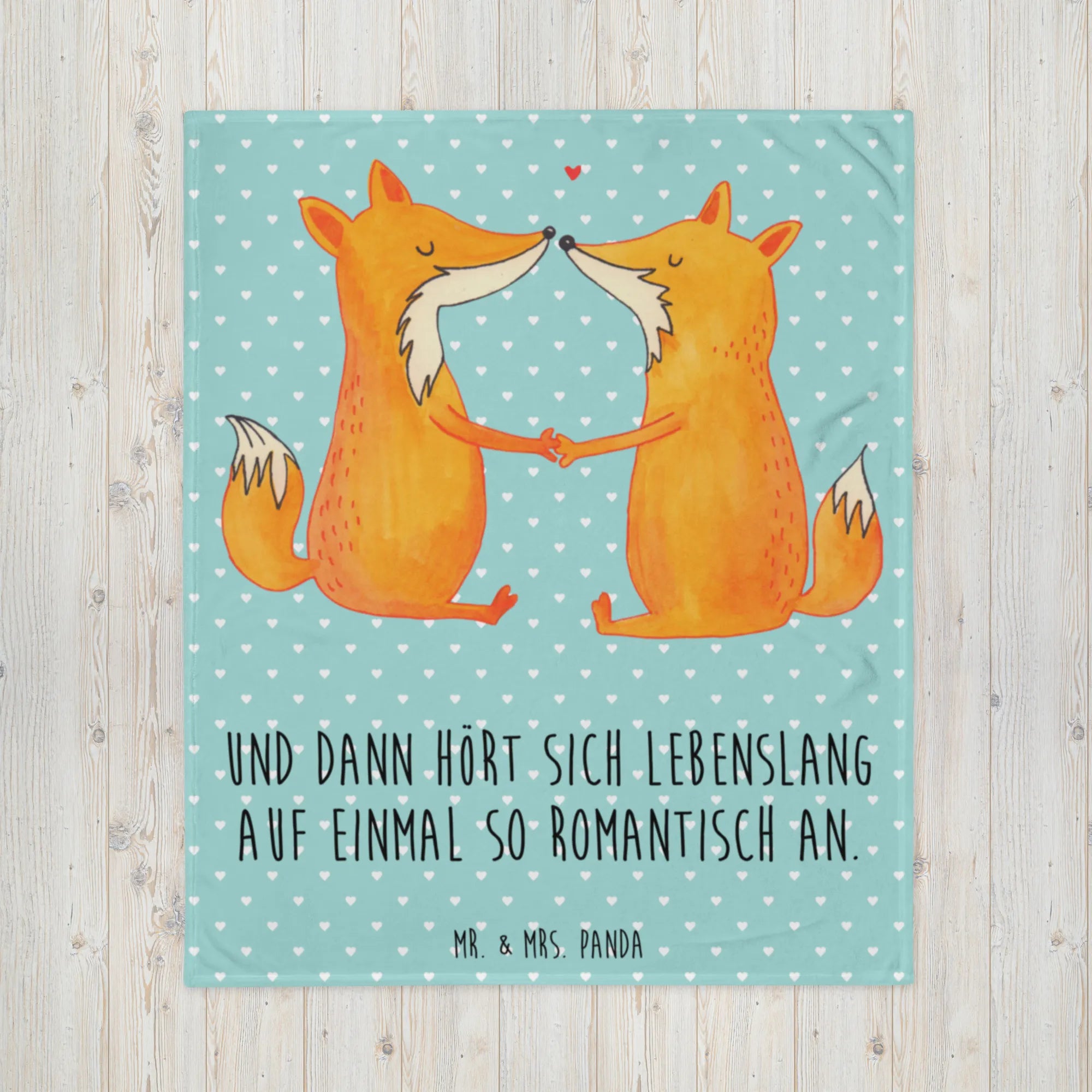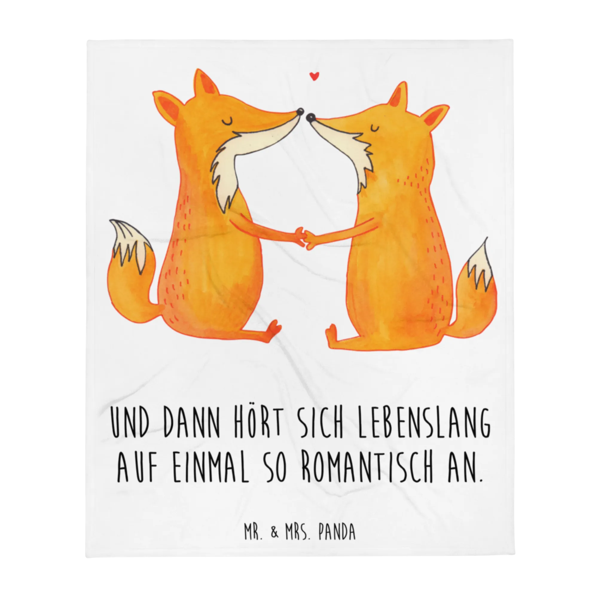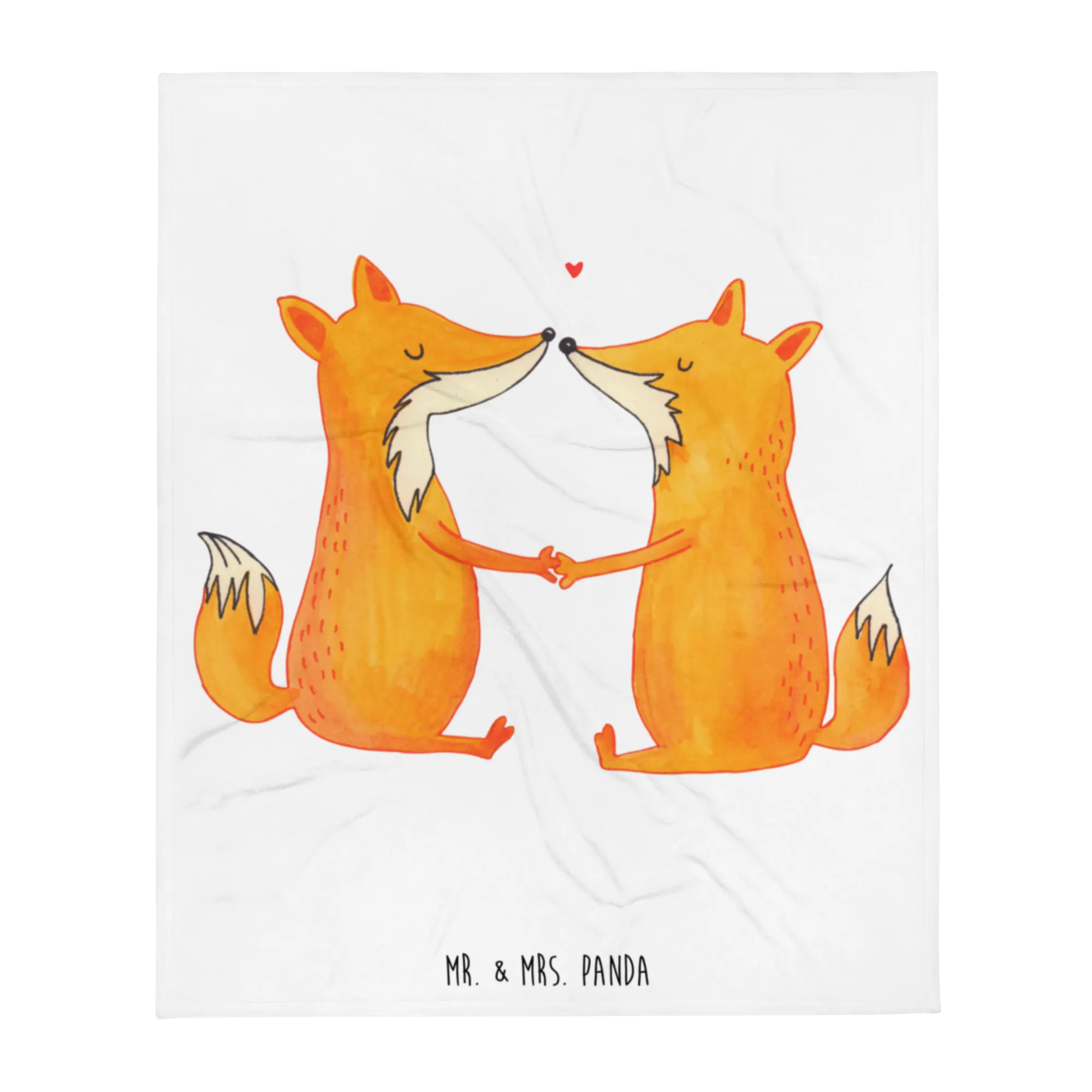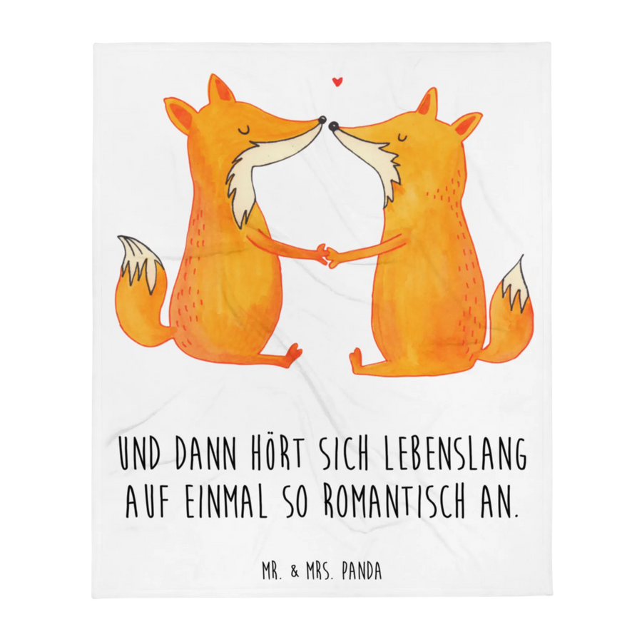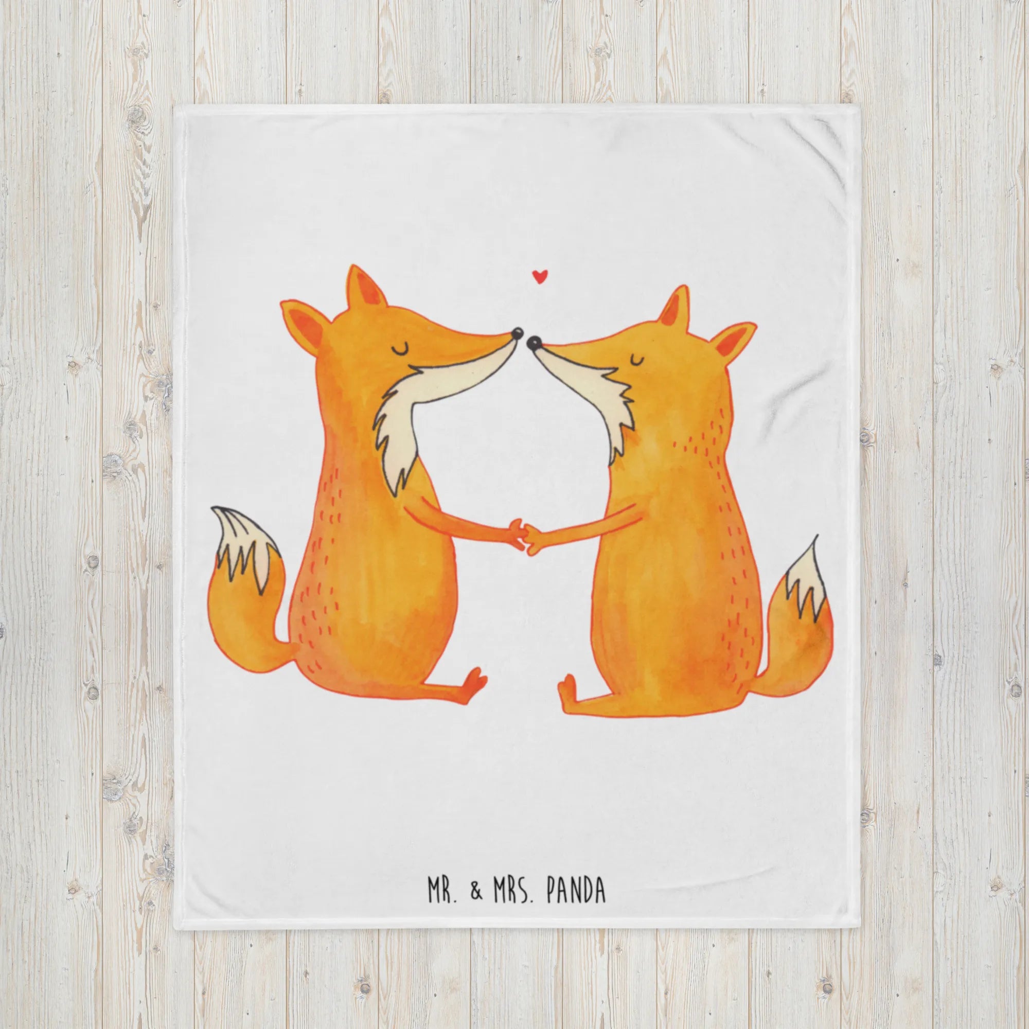 Die Kuscheldecke Füchse Liebe von Mr. & Mrs. Panda ist das ideale Geschenk für verliebte Paare, die das Besondere im Alltag suchen. Diese hochwertige und wunderschöne Kuscheldecke strahlt Romantik und Wärme aus und ist perfekt für jede Couch oder das Bett. Mit dem niedlichen Motiv von zwei Füchsen, die Hand in Hand sitzen, zaubert sie ein Lächeln auf jedes Gesicht.