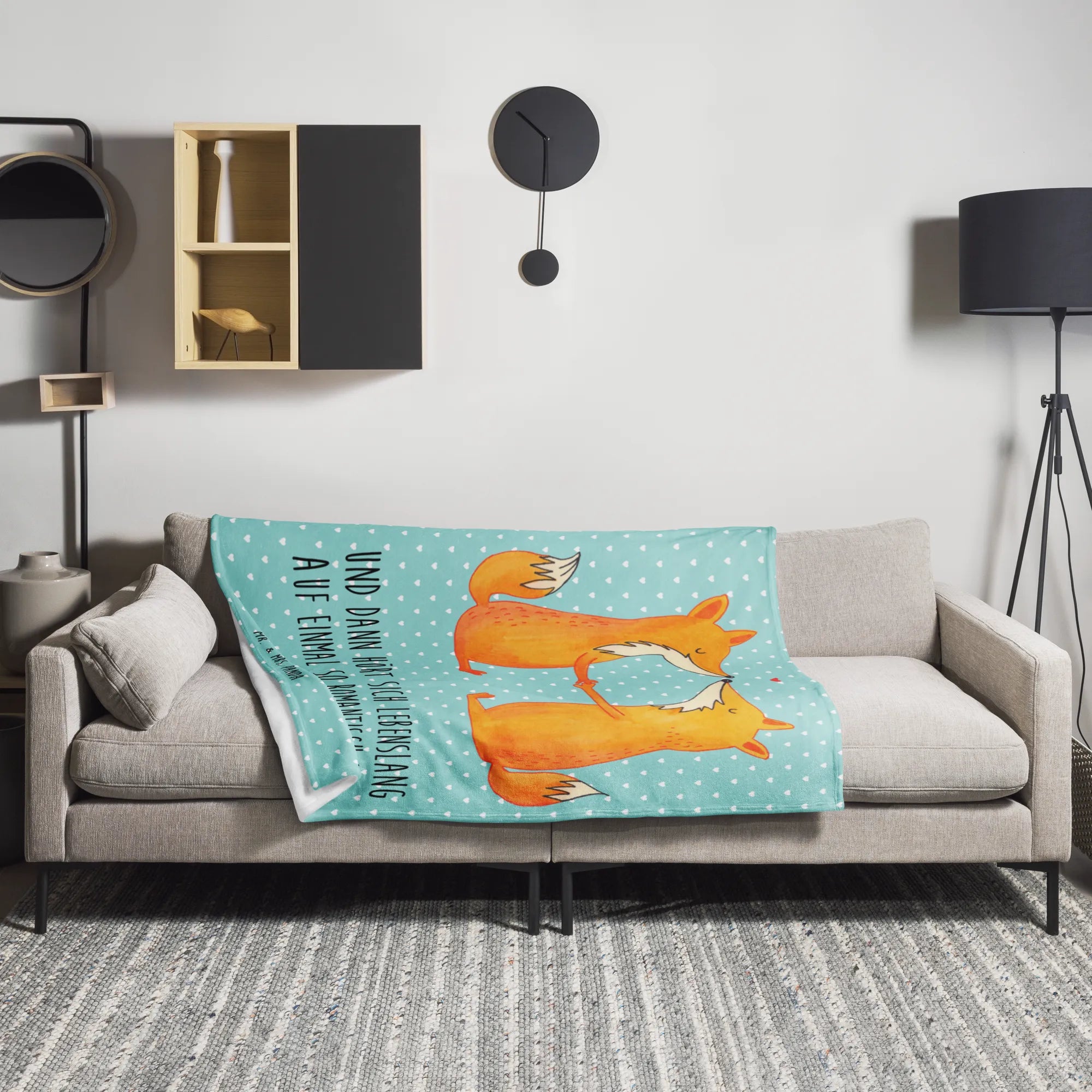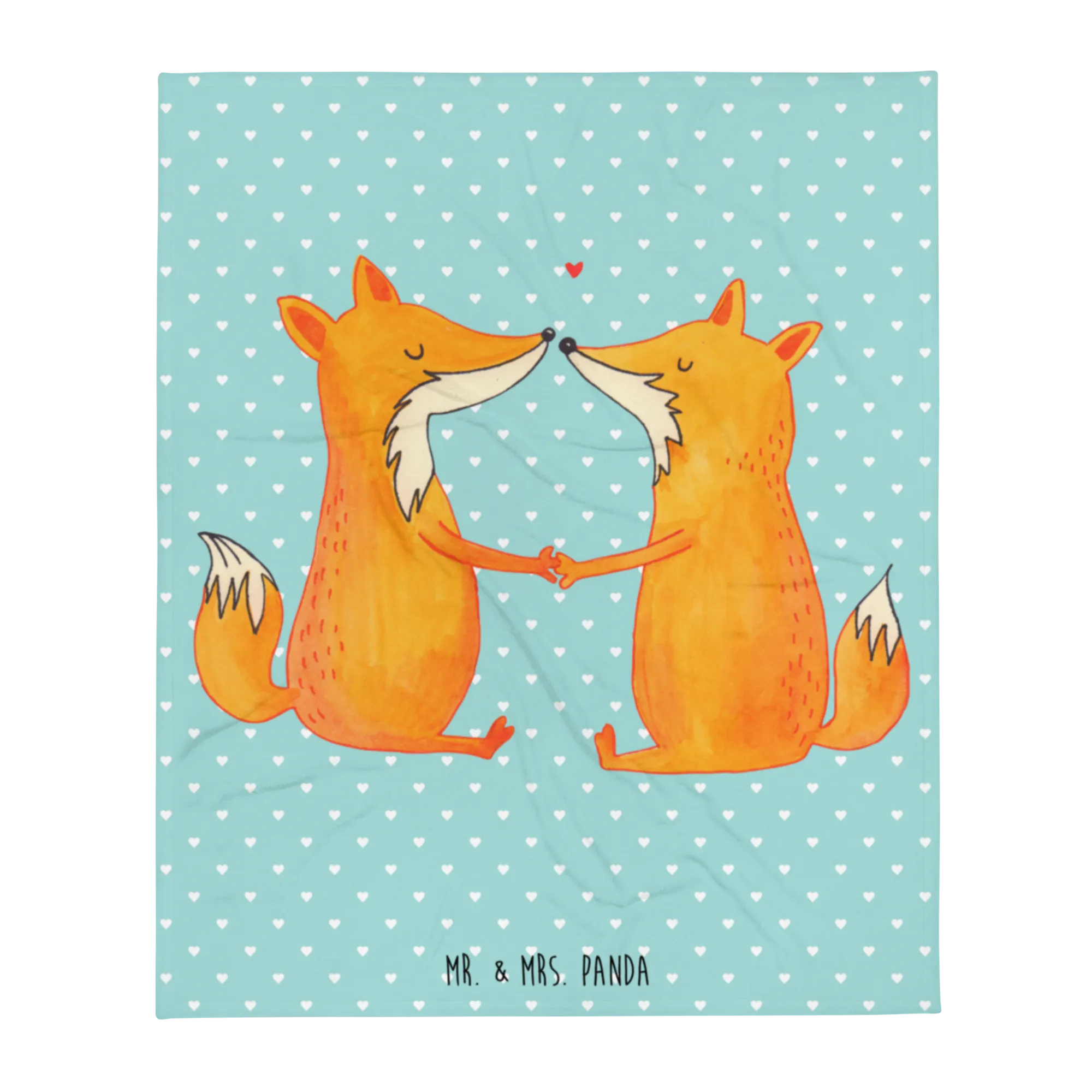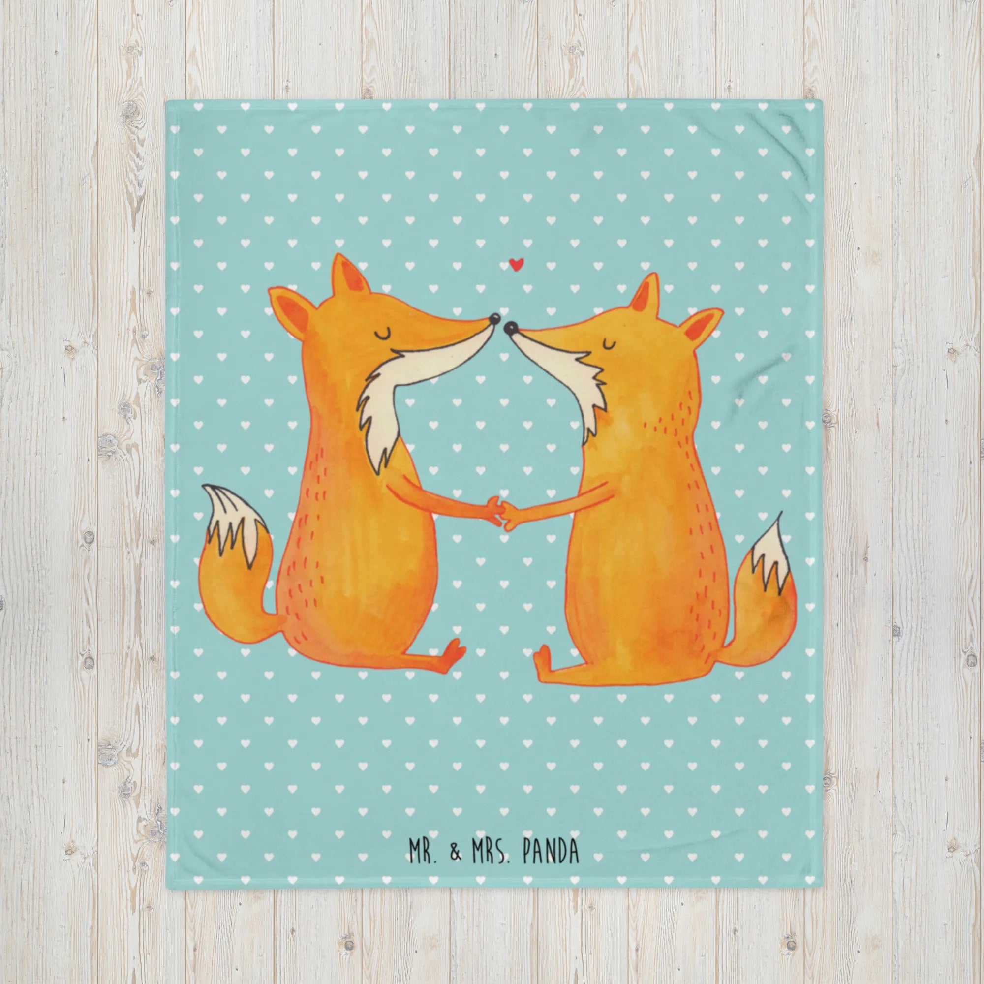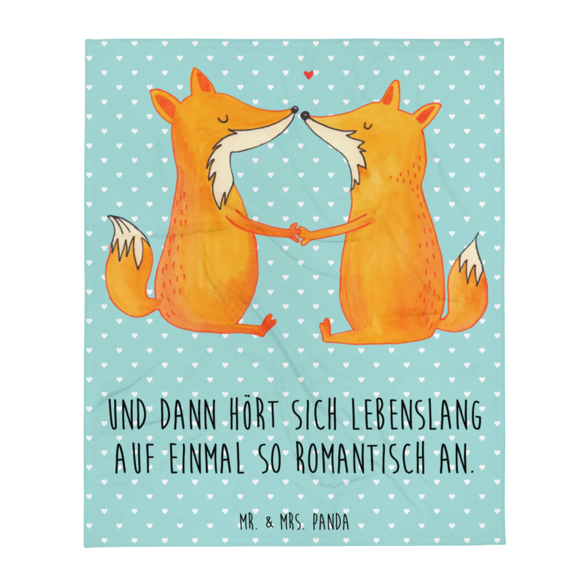 Die Kuscheldecke Füchse Liebe von Mr. & Mrs. Panda ist das ideale Geschenk für verliebte Paare, die das Besondere im Alltag suchen. Diese hochwertige und wunderschöne Kuscheldecke strahlt Romantik und Wärme aus und ist perfekt für jede Couch oder das Bett. Mit dem niedlichen Motiv von zwei Füchsen, die Hand in Hand sitzen, zaubert sie ein Lächeln auf jedes Gesicht.