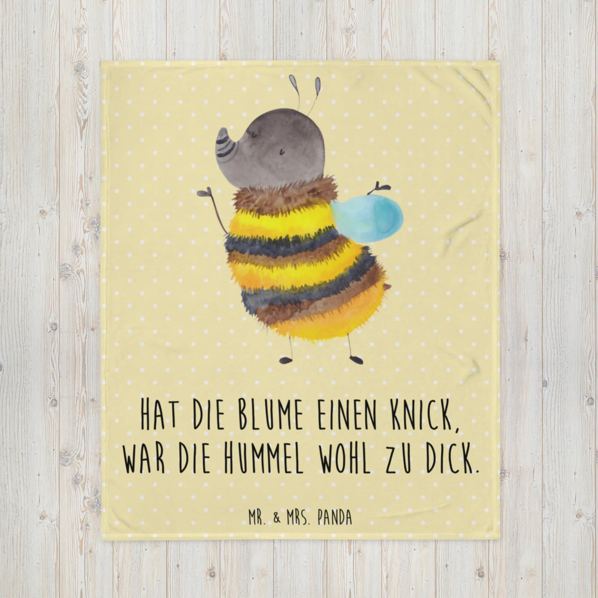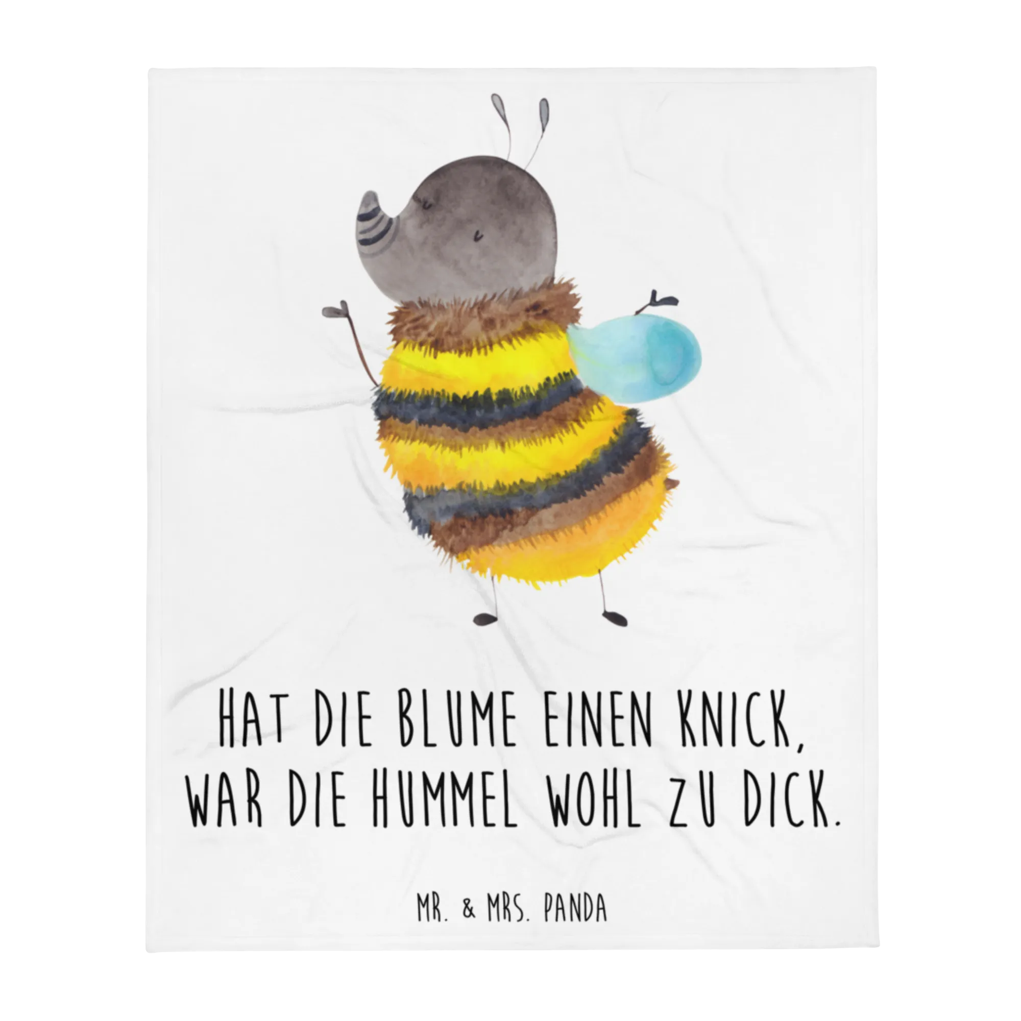 Kuscheldecke Hummel flauschig von Mr. & Mrs. Panda – der perfekte Begleiter für gemütliche Abende auf dem Sofa oder für eine behagliche Nachtruhe im Bett! Diese hochwertige und wunderschöne Kuscheldecke ist nicht nur schön anzusehen, sondern sorgt auch für jede Menge gute Laune mit ihrem fröhlichen Hummel-Motiv und dem witzigen Spruch: "Hat die Blume einen Knick, war die Hummel wohl zu dick."