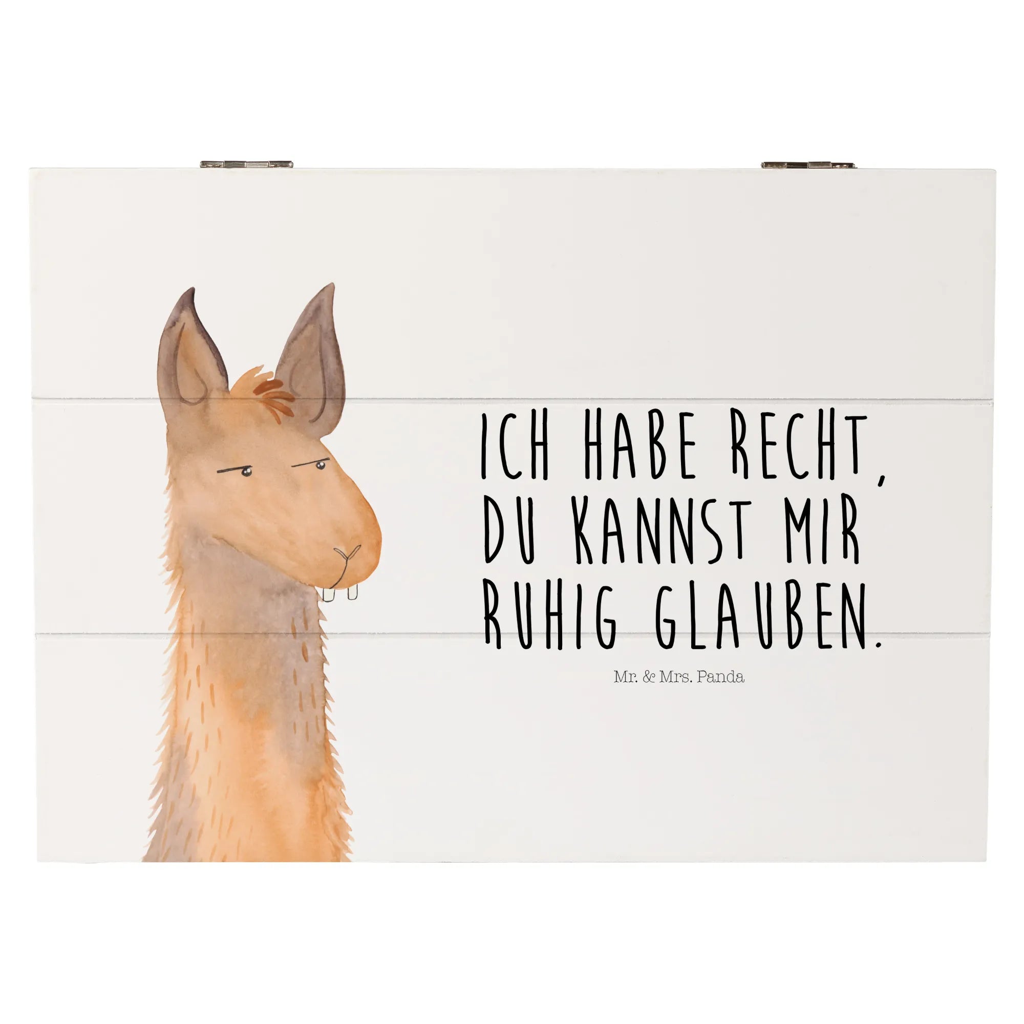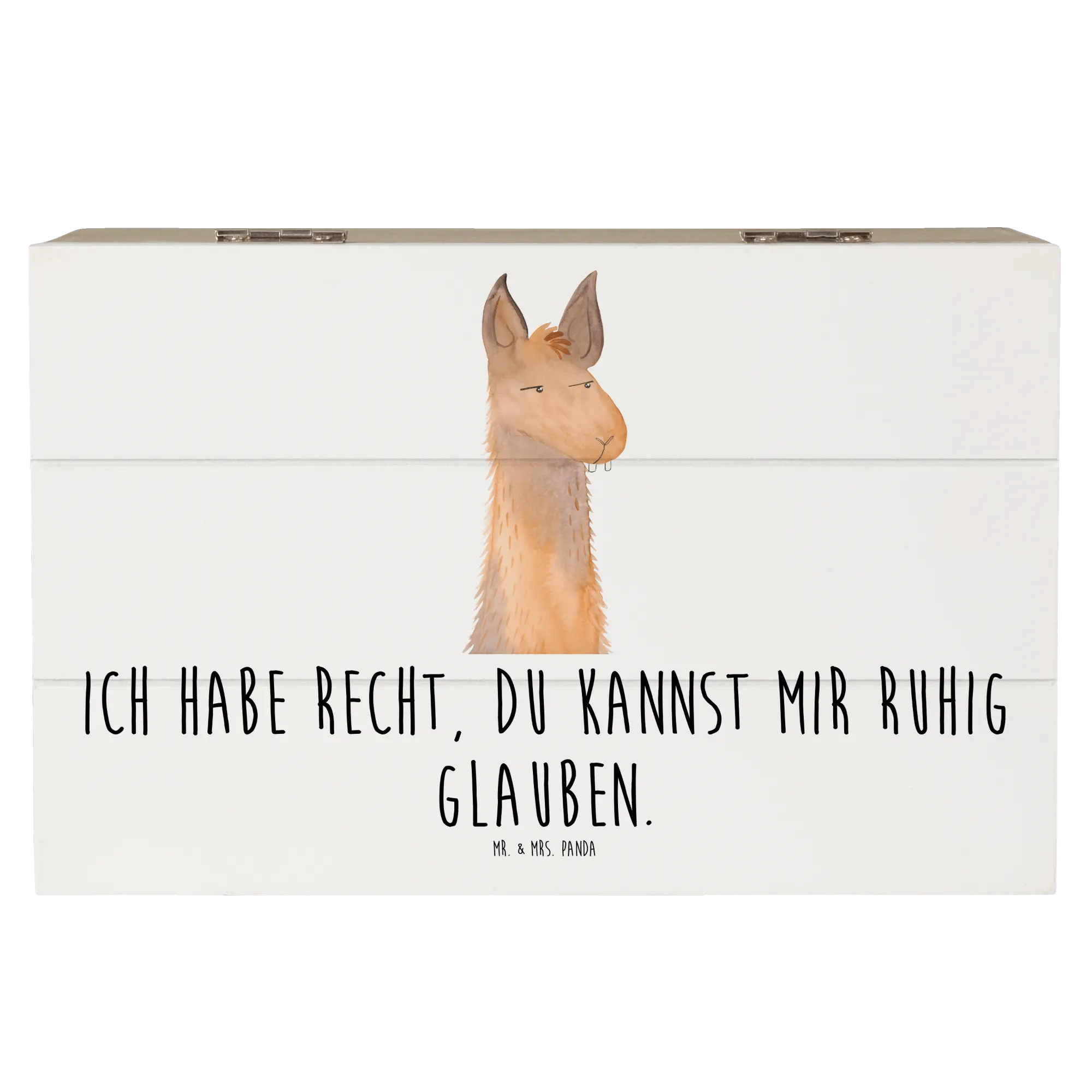 Die wunderschöne Holzkiste mit dem genervten Lamakopf aus der exklusiven Lama-Kollektion von Mr. & Mrs. Panda ist das perfekte Geschenk für alle Lamas-Fans und dazu noch ein absolutes Must-Have für jeden Schreibtisch! Du bist auf der Suche nach einer besonderen Aufforderung zum Schenken? Diese Erinnerungsbox ist nicht nur praktisch, sondern bringt auch jede Menge Freude ins Büro oder in den Alltag. Mit dem lustigen Spruch "Ich habe Recht, du kannst mir ruhig glauben." ist sie auch ein echter Hingucker in jeder Einrichtung.