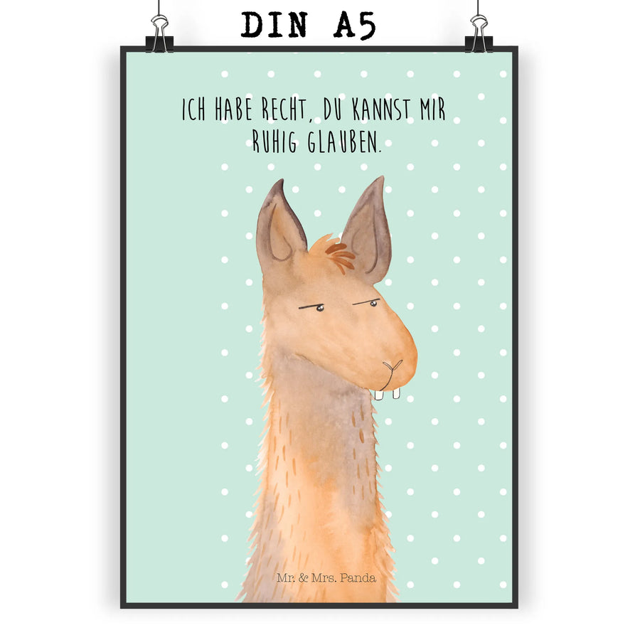 Entdecke das wunderschöne handgemalte Poster "Lamakopf genervt" aus der Lama Kollektion von Mr. & Mrs. Panda! Mit diesem einzigartigen Wandposter bringst du einen Hauch von Coolness in dein Zuhause oder Büro. Das genervte Lama schaut dich charmant an und hat mit seinem Slogan "Ich habe Recht, du kannst mir ruhig glauben" einen spritzigen und humorvollen Charakter.