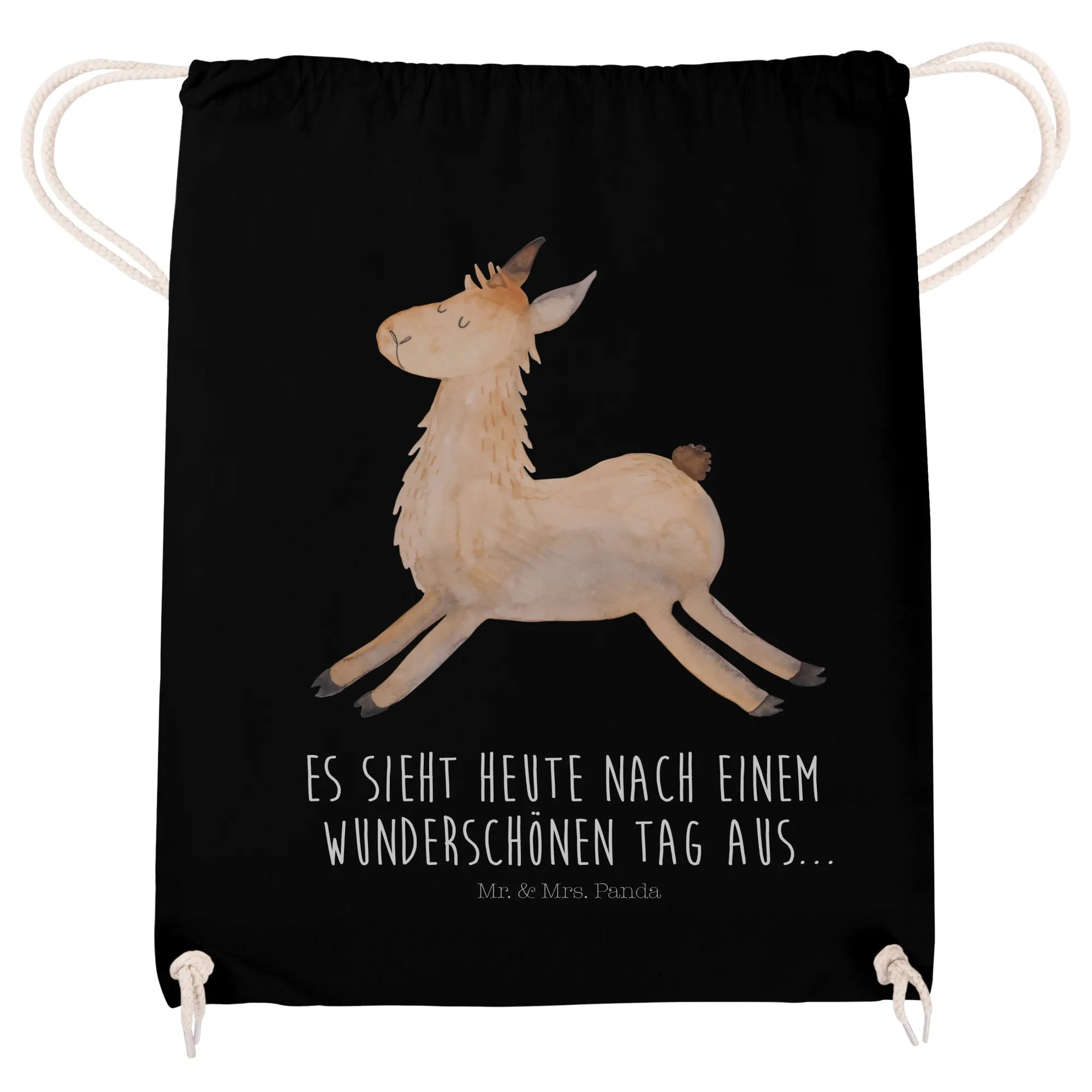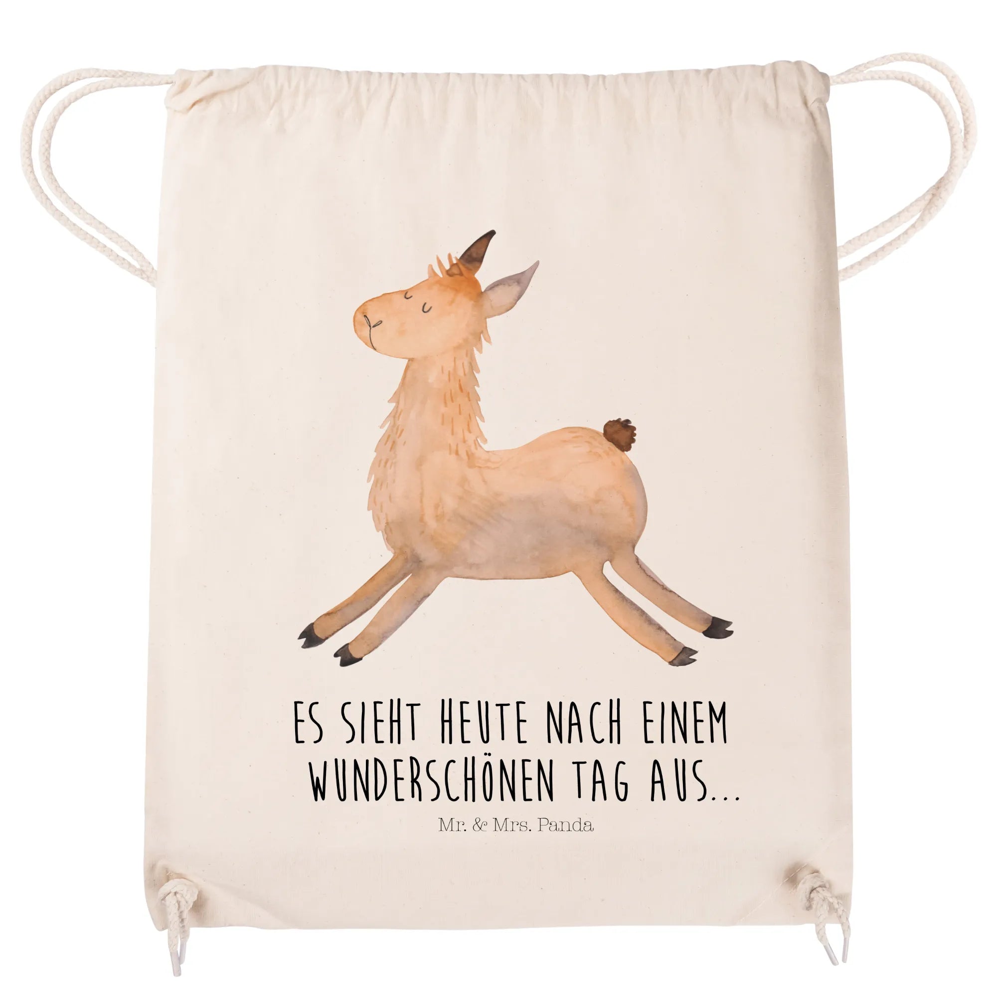 Mr. & Mrs. Panda Sportbeutel „Lama springend“ – dein fröhlicher Alltagsbegleiter! Dieses süße Lama hüpft förmlich vor Freude und begleitet dich zuverlässig zur Schule, zum Sport, ins Fitnessstudio oder zum Festival. Der positive Spruch „Es sieht heute nach einem wunderschönen Tag aus...“ sorgt schon beim Aufstehen für gute Laune und macht den Turnbeutel zum idealen Geschenk für Freunde und Familie.
