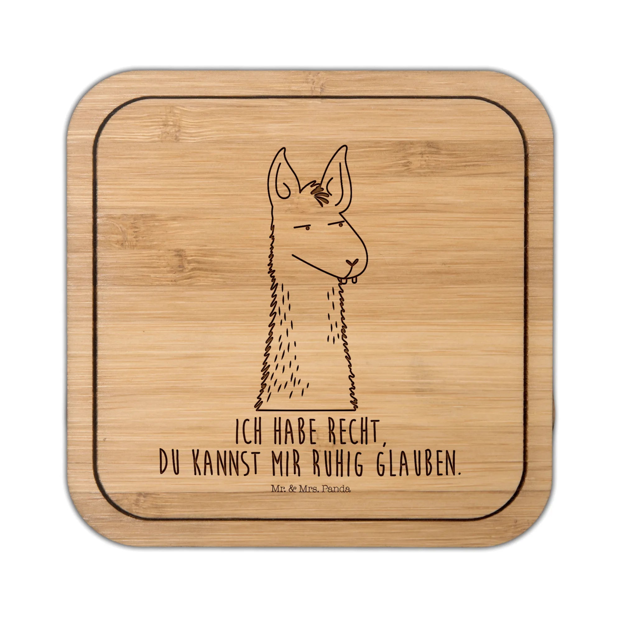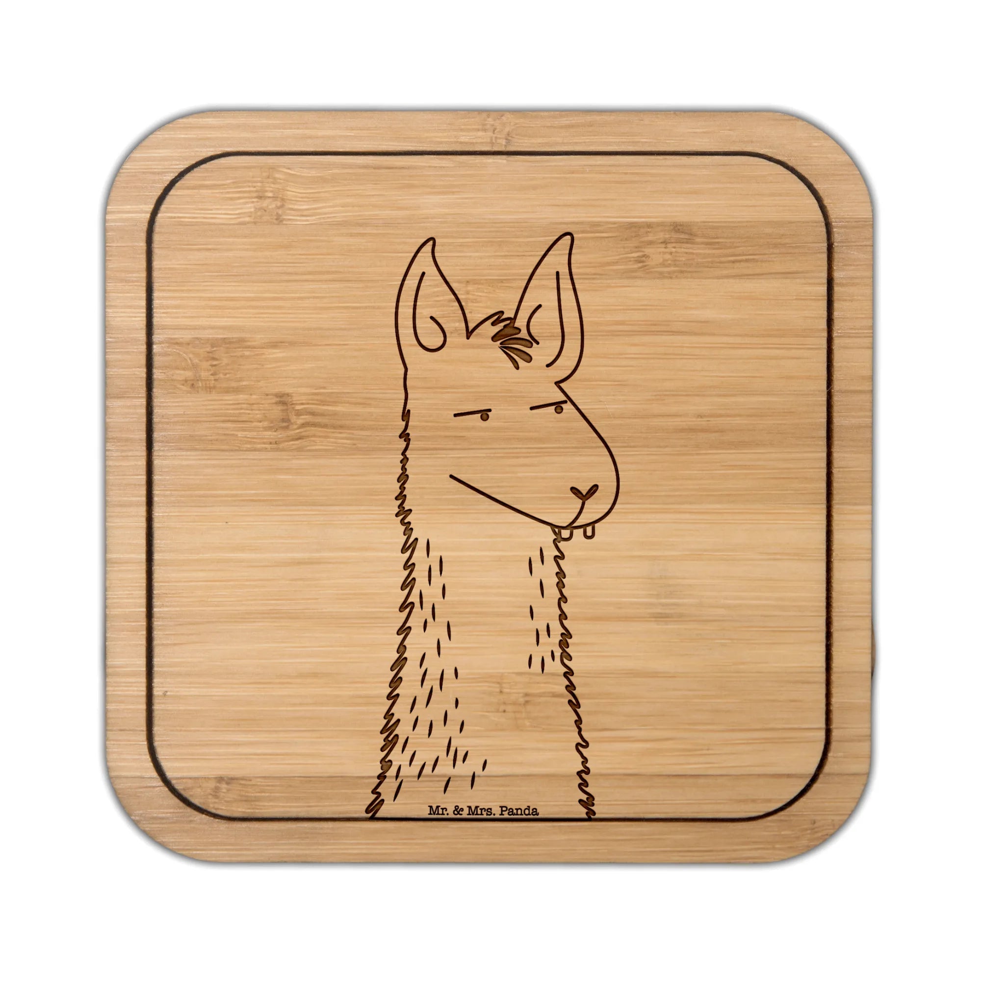 Der quadratische Untersetzer mit dem genervten Lamakopf aus der Lama-Kollektion von Mr. & Mrs. Panda ist das perfekte Geschenk für alle Lama-Fans!