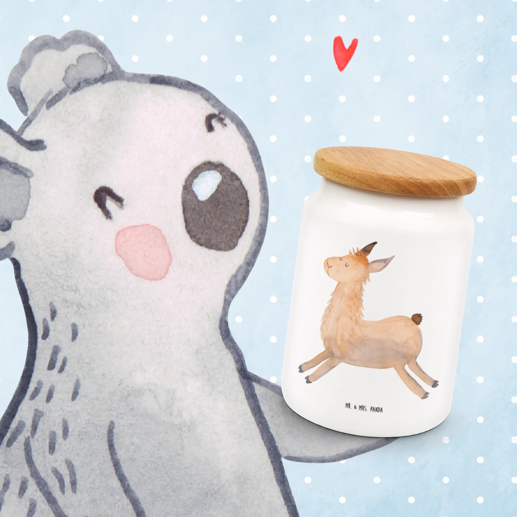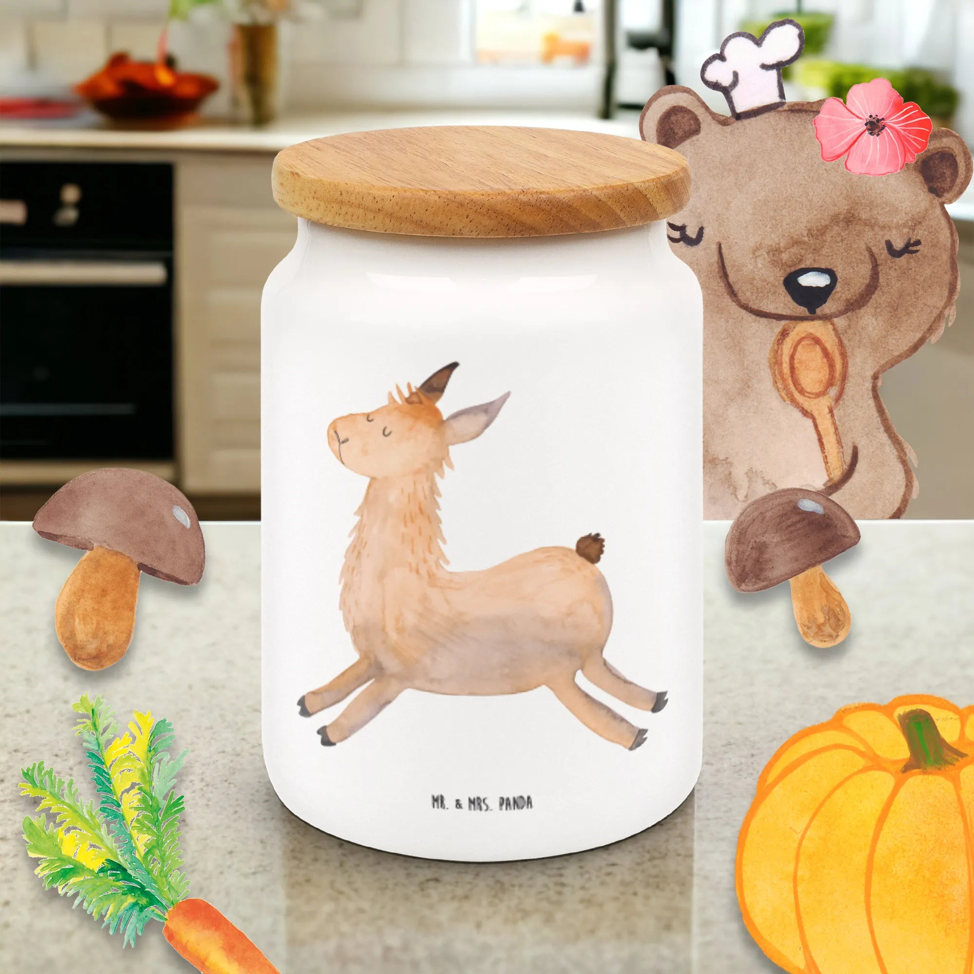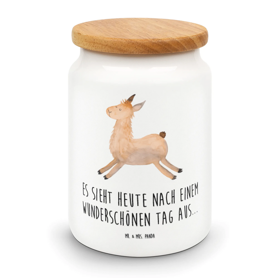 Entdecke die zauberhafte Vorratsdose ‚Lama springend‘ aus der berühmten Lama-Kollektion von Mr. & Mrs. Panda! Diese liebevoll gestaltete Keramikdose ist nicht nur ein praktischer Aufbewahrungsbehälter, sondern auch ein richtig cooler Hingucker in Deiner Küche.
