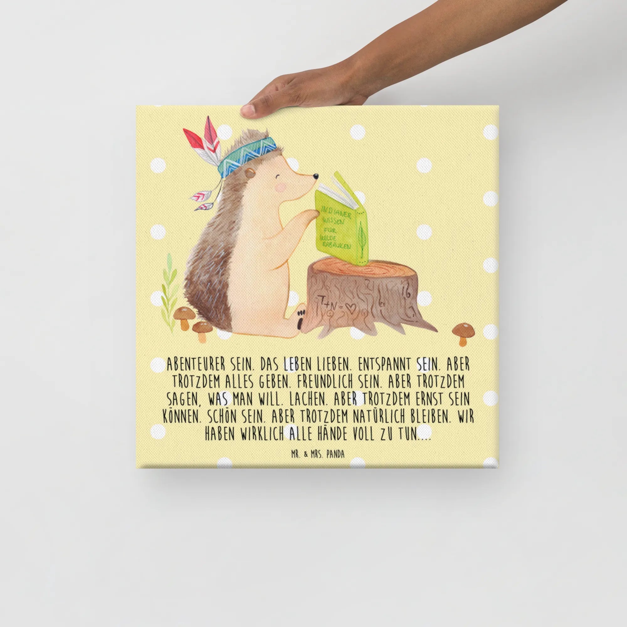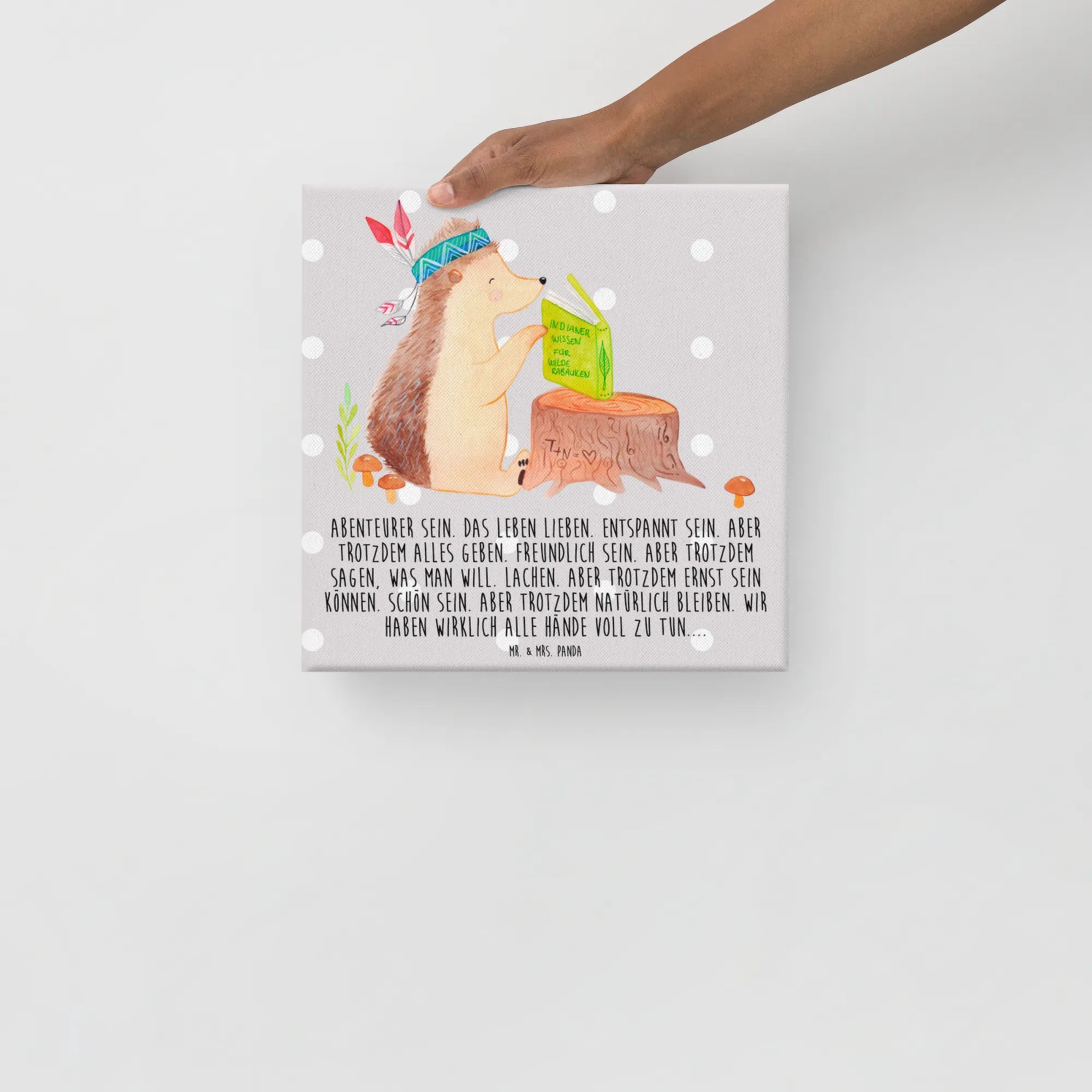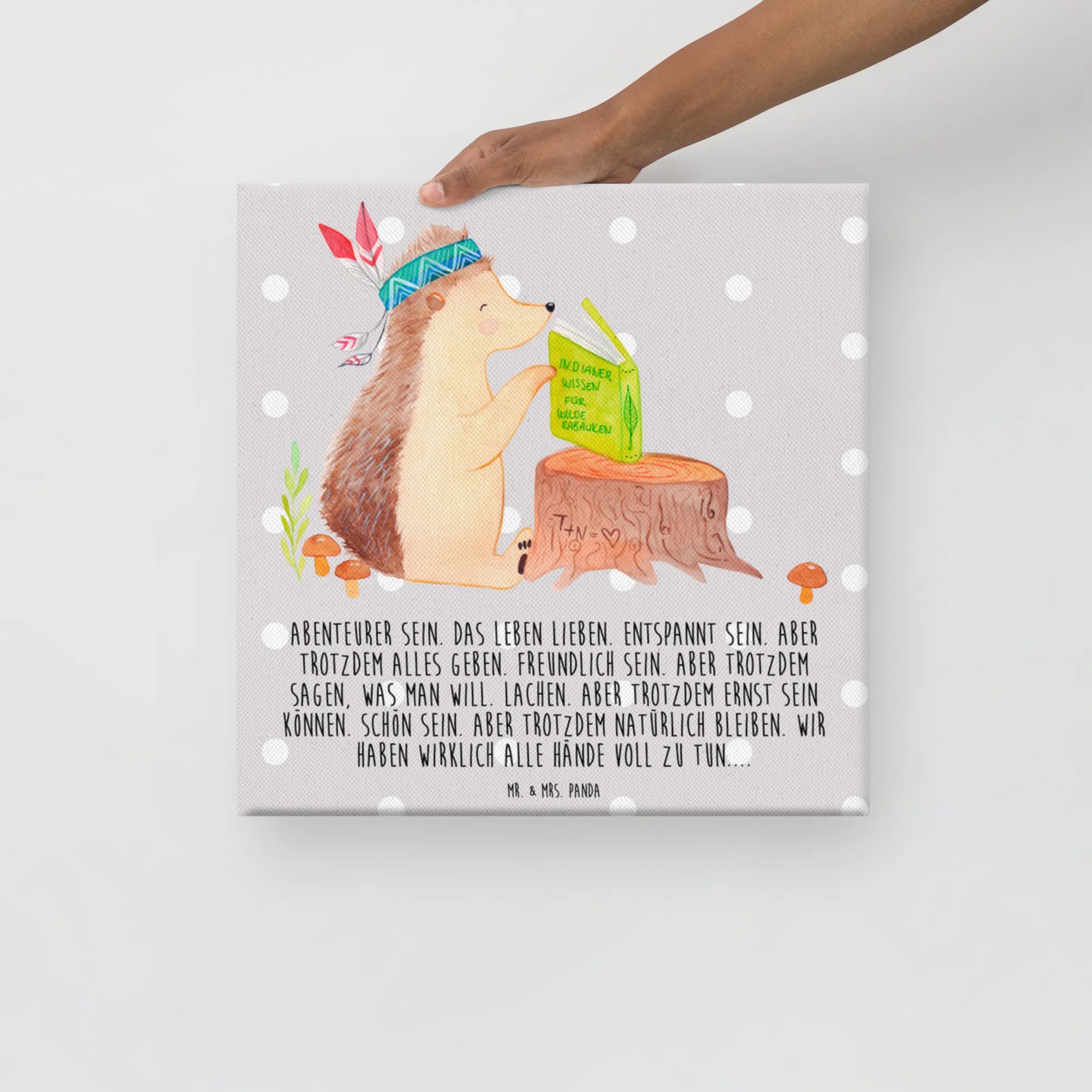 Bring ein Stück Waldmagie in Dein Zuhause: Unser entzückendes Leinwand Bild zeigt einen kleinen Igel mit Federschmuck, der auf einem Baumstumpf sitzt und ein Buch über Abenteuer liest. Die sanfte, grau-pastellige Hintergrundfarbe und die liebevoll handgezeichnete Aquarell-Illustration von Mrs. Panda schaffen eine warme, beruhigende Stimmung.