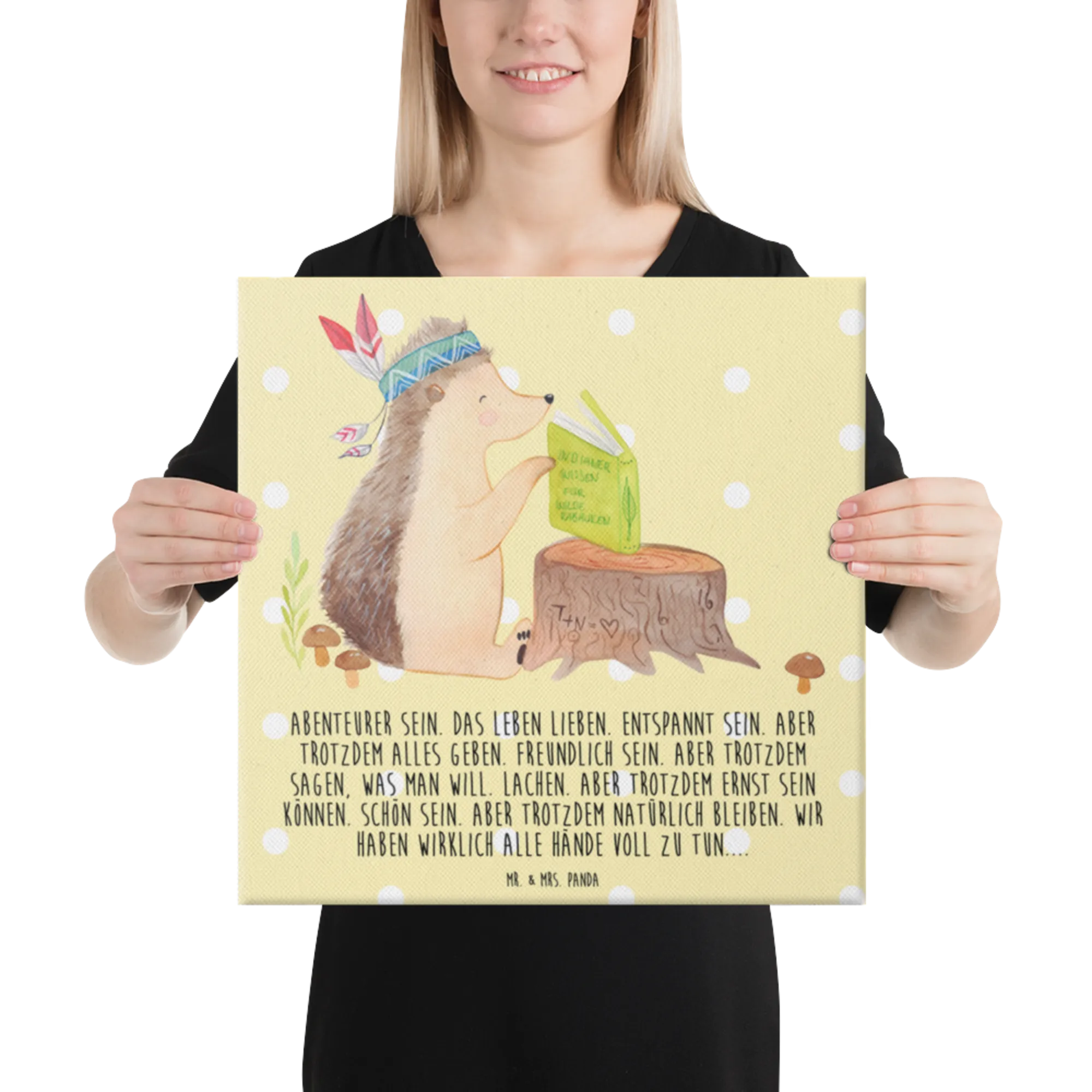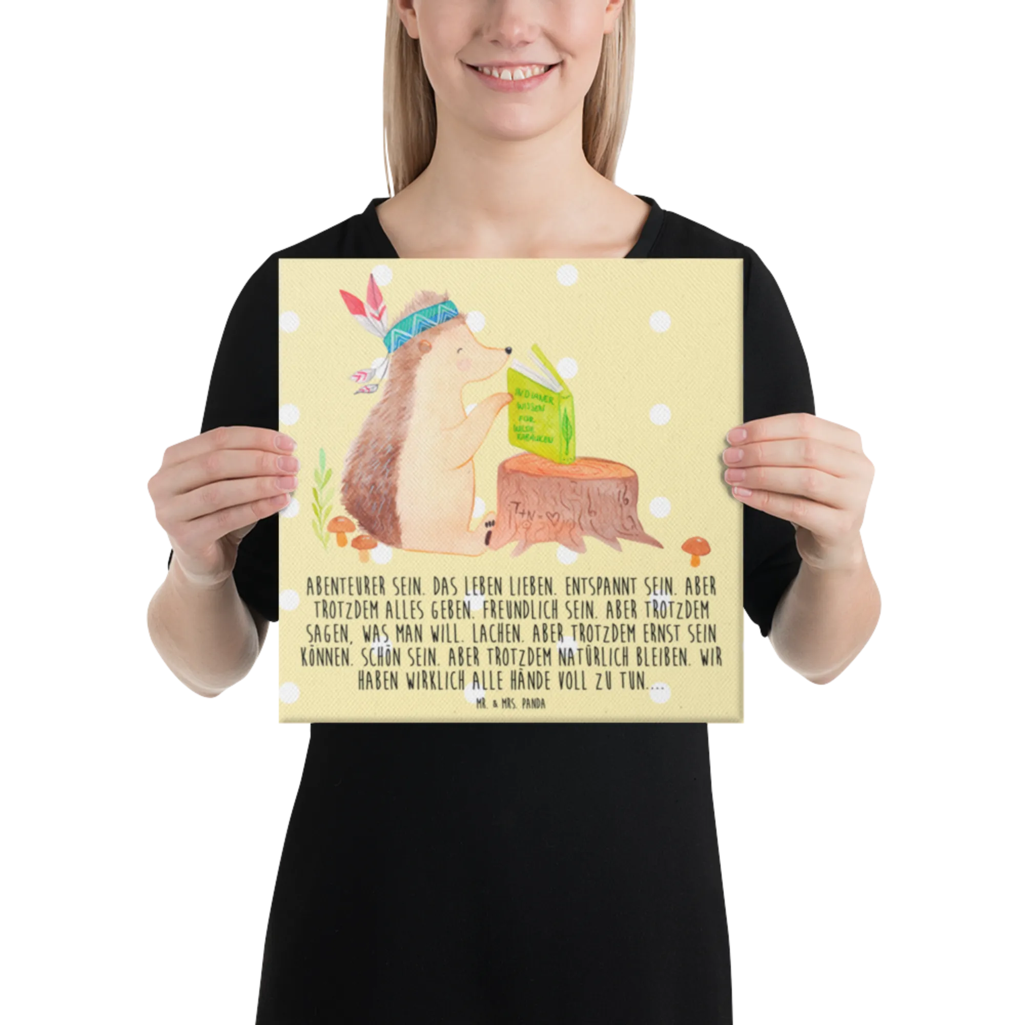 Mit inspirierendem Spruch: „Abenteurer sein. Das Leben lieben. Entspannt sein. Aber trotzdem alles geben. Freundlich sein. Aber trotzdem sagen, was man will. Lachen. Aber trotzdem ernst sein können. Schön sein. Aber trotzdem natürlich bleiben. Wir haben wirklich alle Hände voll zu tun....“ Dieser Text macht das Bild zu mehr als Dekoration – zu einer kleinen Erinnerung an Mut, Herzlichkeit und Natürlichkeit.