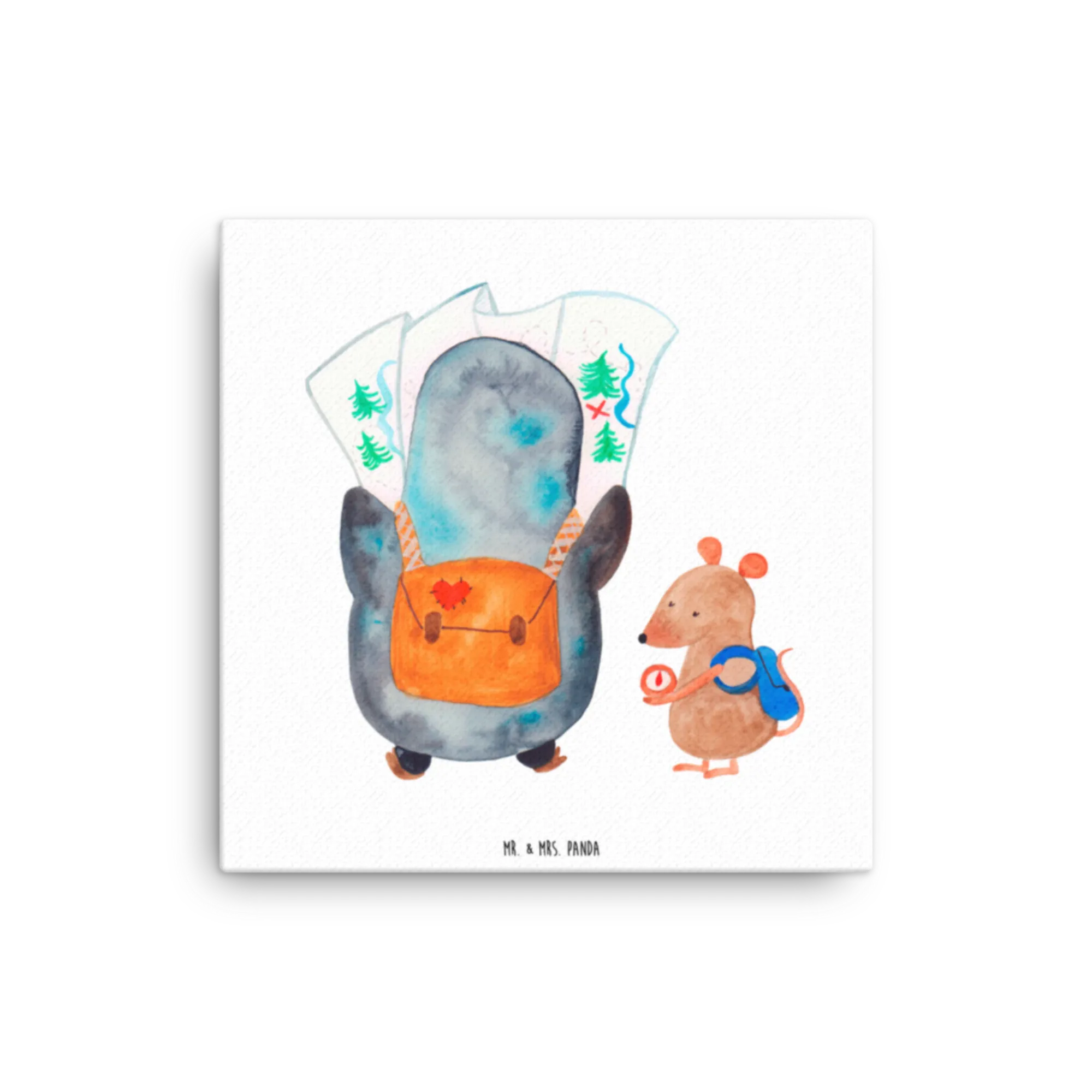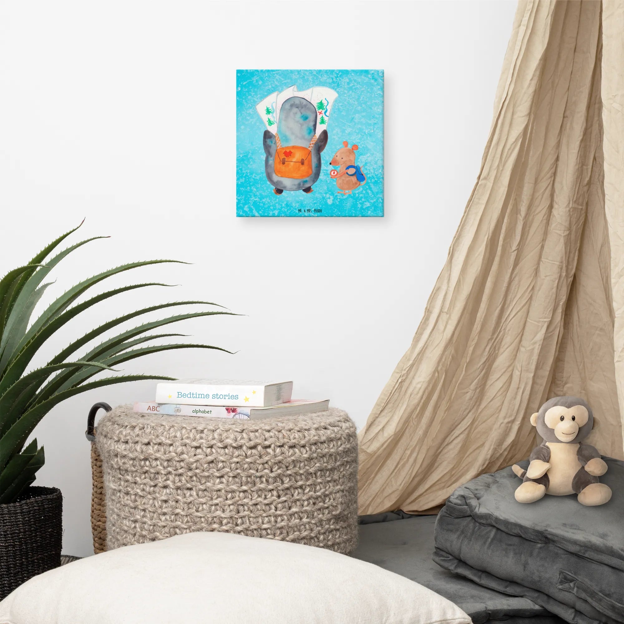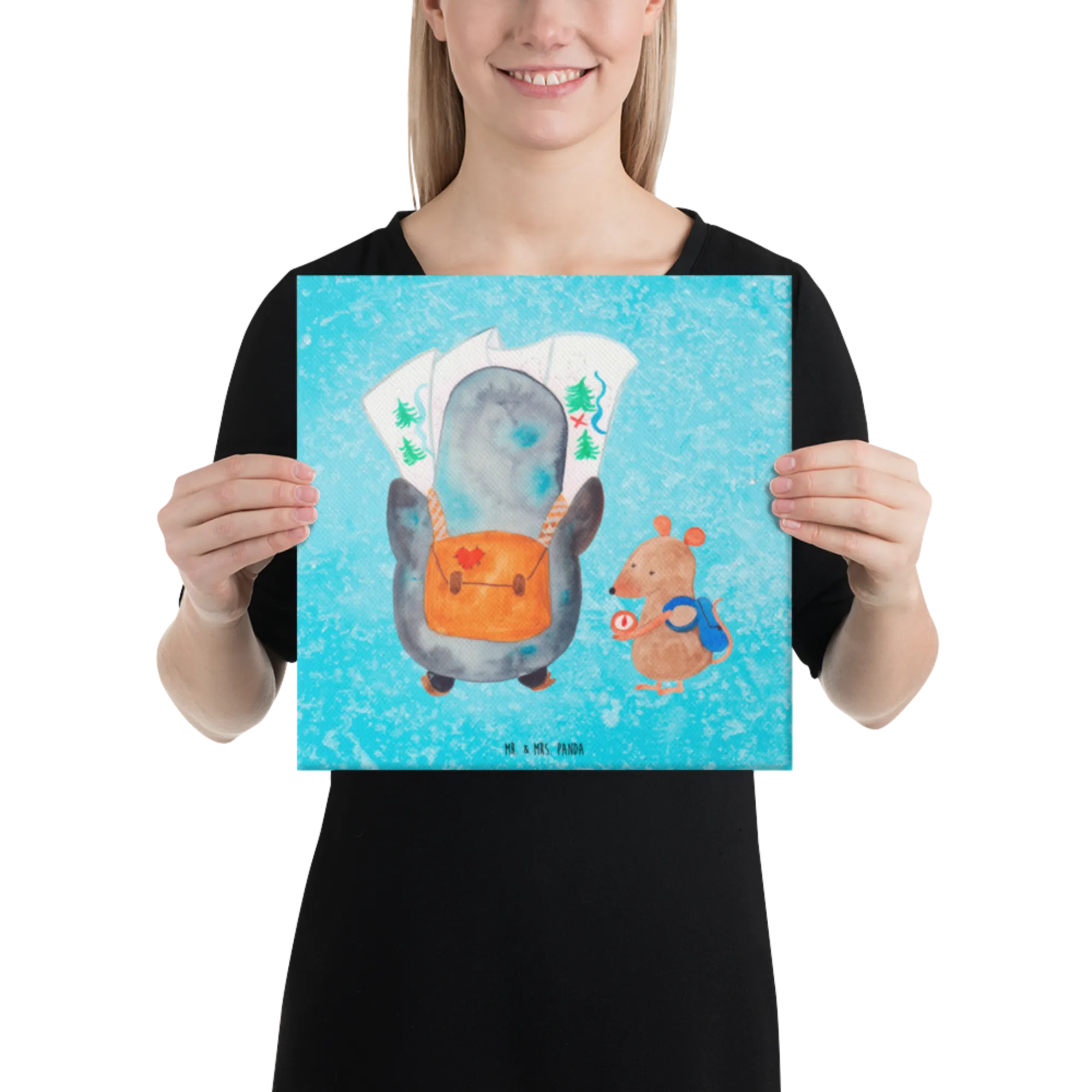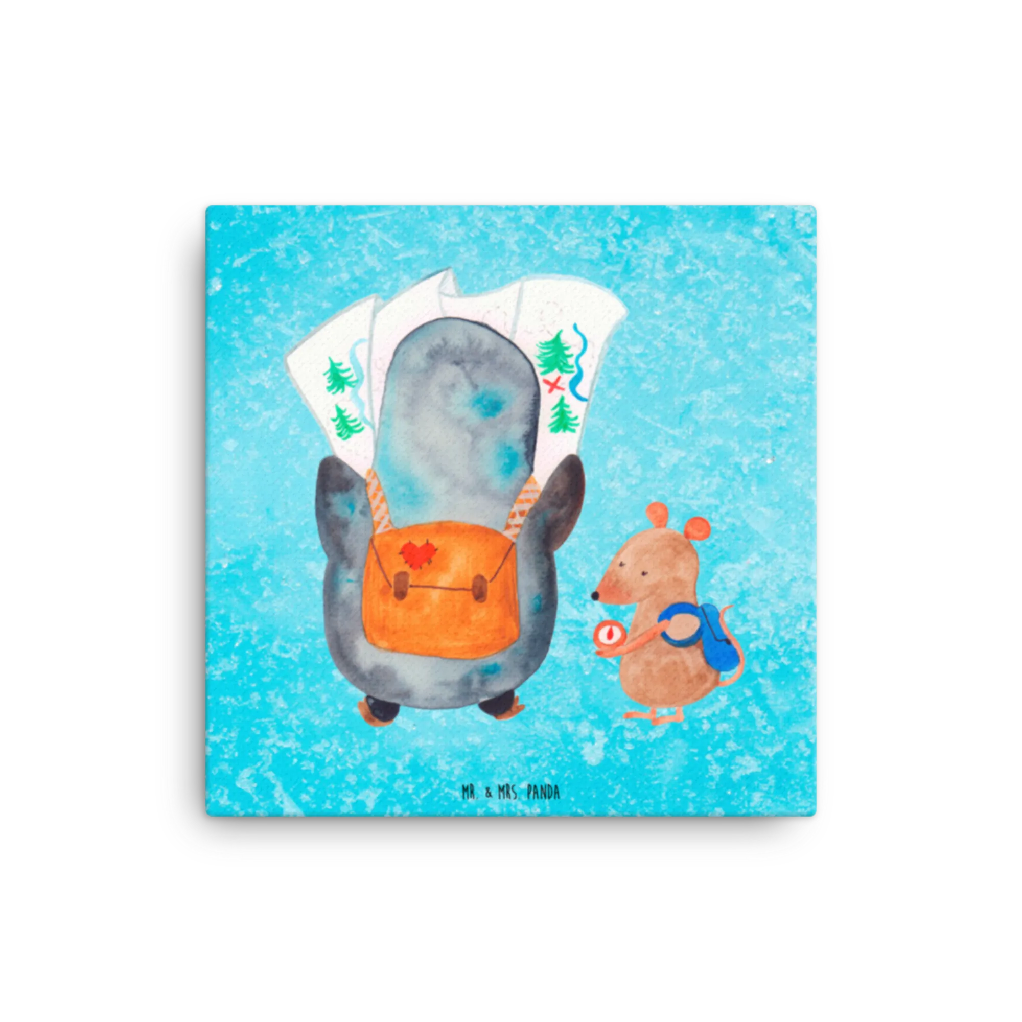 Leinwand Bild Pinguin & Maus Wanderer - 40 x 40 cm - mit Spruch - Eisblau