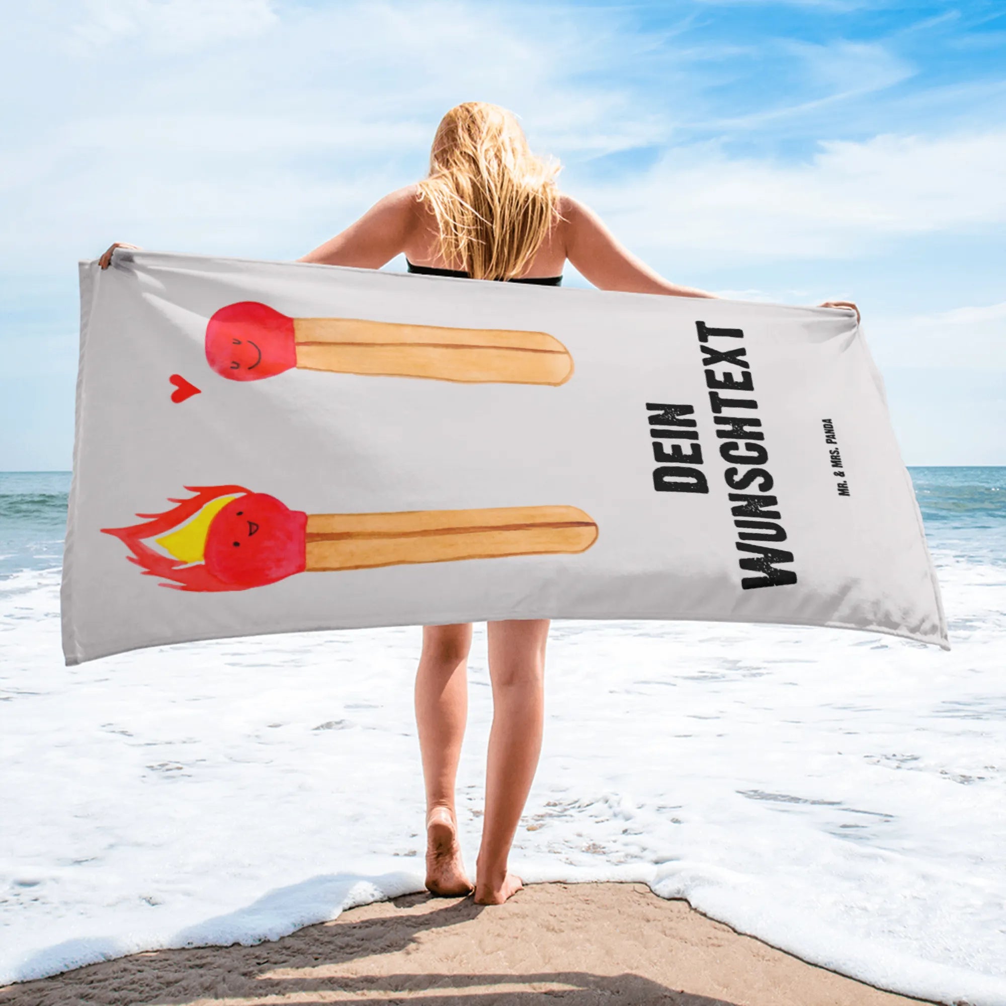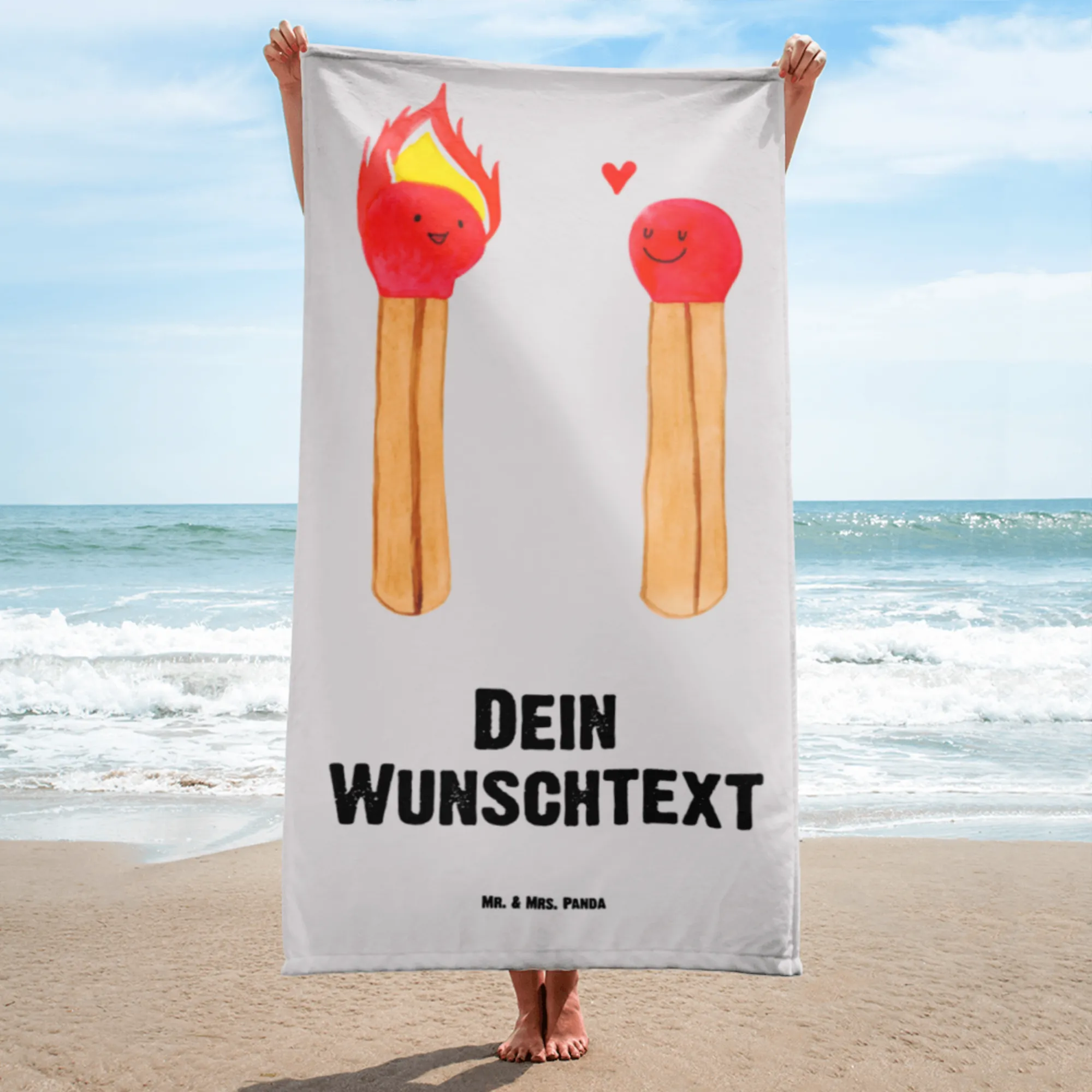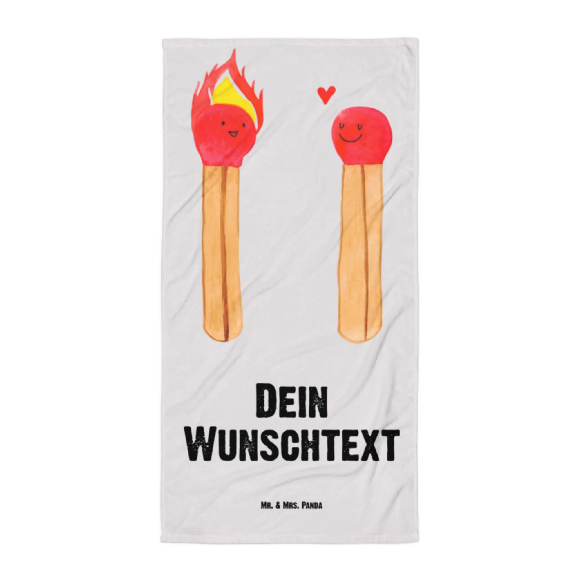 Entdecke das personalisierte Handtuch mit dem zauberhaften Motiv der Streichhölzer aus der Liebe Kollektion von Mr. & Mrs. Panda. Dieses Handtuch ist nicht nur super praktisch, sondern auch ein ganz besonderes Liebesgeschenk für deinen Partner oder deine Partnerin!