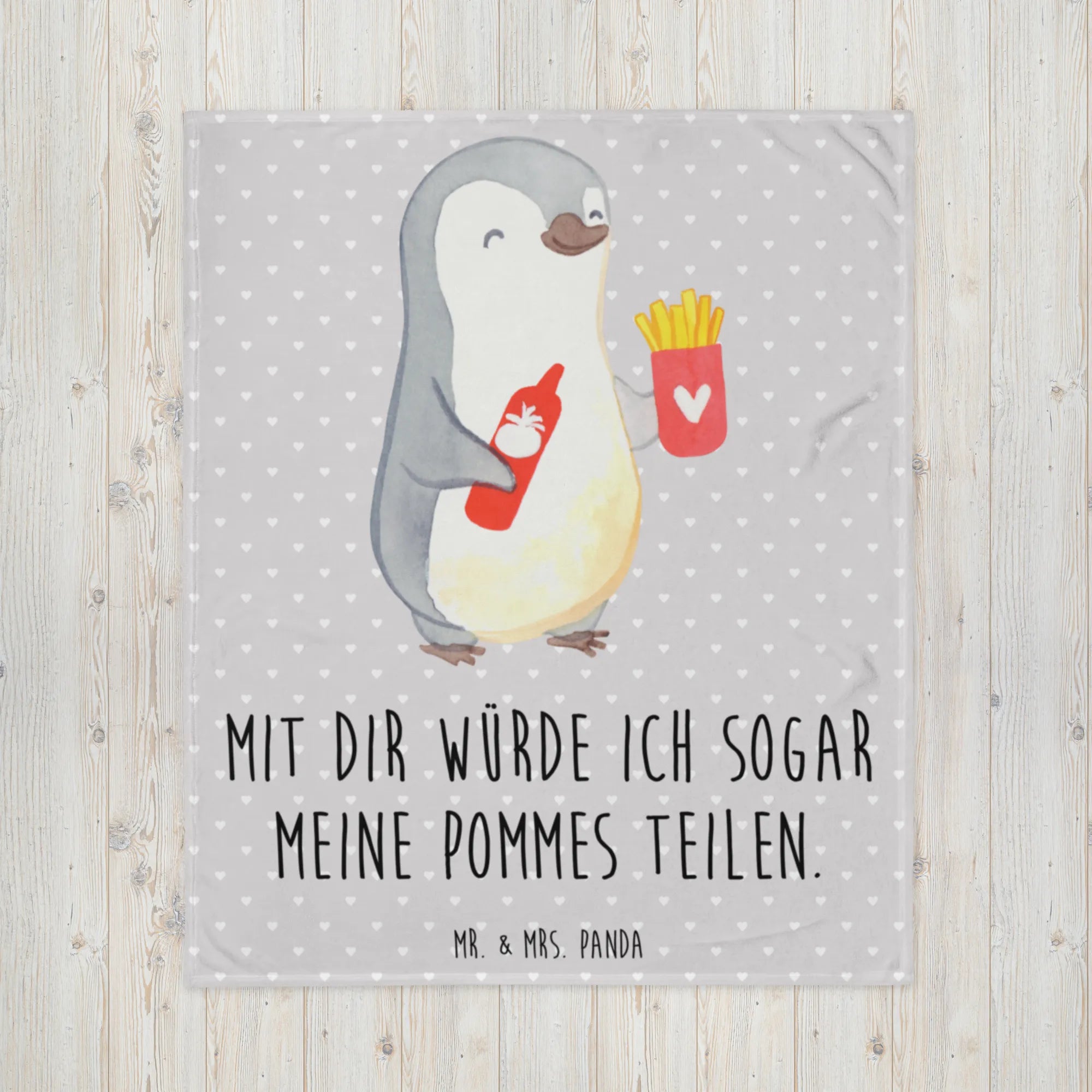 Die Kuscheldecke "Pinguin Pommes" aus der Liebe Kollektion von Mr. & Mrs. Panda ist das perfekte Geschenk für jeden Anlass, der das Herz höher schlagen lässt! Diese hochwertige und wunderschöne Decke mit dem niedlichen Pinguin, der voller Freude Pommes Frites genießt, sorgt sofort für gute Laune und воспроизводит моменты, которые вы разделяете с любимым человеком. Wenn Du auf der Suche nach einem einzigartigen Geschenk für den Valentinstag, einen Jahrestag oder den Hochzeitstag bist, dann ist diese Kuscheldecke genau das Richtige. Mit dem liebevollen Spruch "Mit dir würde ich sogar meine Pommes teilen" ist sie nicht nur ein dekoratives Element für Dein Zuhause, sondern auch ein Liebesbeweis, der über warme Worte hinausgeht.