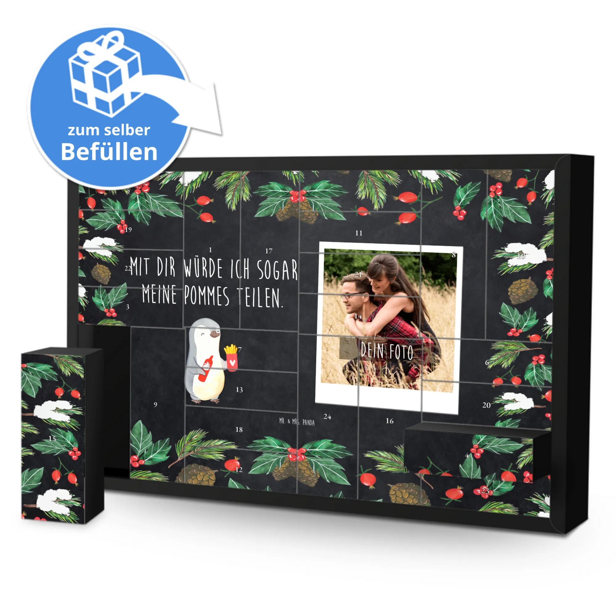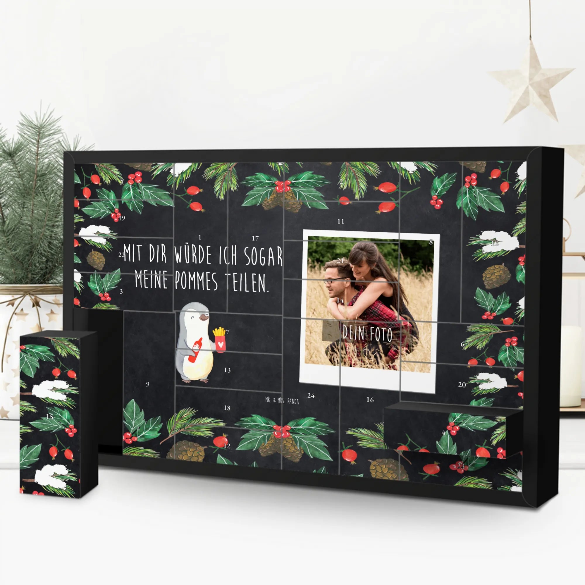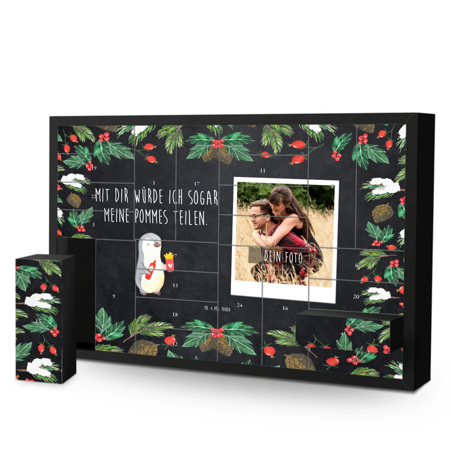 Der personalisierbare Foto Adventskalender von Mr. & Mrs. Panda ist das perfekte Geschenk für alle, die ihren Liebsten eine besondere Freude bereiten möchten. Mit dem liebevollen Pinguin-Pommes-Motiv und dem herzlichen Spruch „Mit dir würde ich sogar meine Pommes teilen“ zaubert dieser Kalender ein Lächeln auf jedes Gesicht. Ob zum Valentinstag, Jahrestag oder Hochzeitstag, dieser Adventskalender ist mehr als nur ein einfacher Kalender; er ist ein liebevolles Zeichen der Zuneigung.
