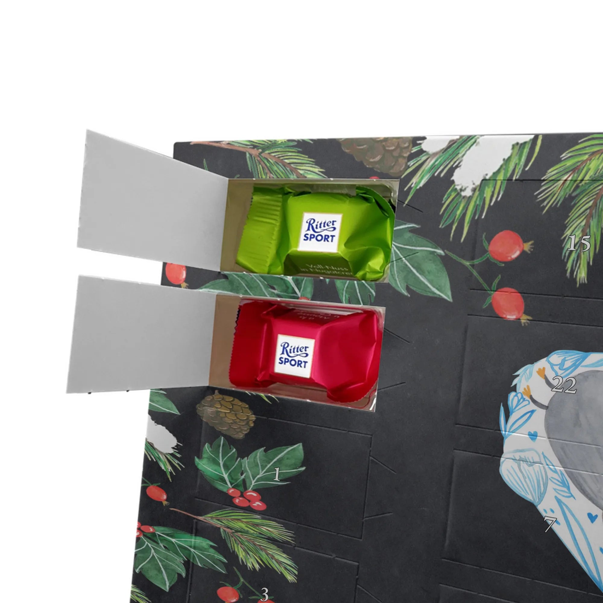 Suchst du einen besonderen Adventskalender, der persönlich und hochwertig ist? Unser Adventskalender mit Namen von Mr. & Mrs. Panda ist genau das – individualisierbar mit dem Namen deiner Liebsten oder einem kurzen Spruch und bedruckt mit unseren beliebten, charmanten Motiven. Die Druckqualität ist brillant, die seidenmatte Oberflächenveredelung verleiht dem Kalender eine elegante Haptik. Auch die Seitenflächen sind liebevoll bedruckt, sodass das Design rundum überzeugt. Du kannst den Kalender aufstellen oder an einer Stelle aufhängen, die du magst – die besondere Form macht beides möglich. Gefüllt ist der Kalender mit Ritter Sport Schokowürfeln in sechs beliebten Sorten: Mousse au Chocolat, Schoko Crisp, Voll-Nuss in Nougatcreme, Karamell Duo, Joghurt und Erdbeer-Joghurt. So gibt es hinter jedem Türchen eine kleine, leckere Überraschung. Maße: 325 mm x 225 mm x 27 mm – kompakt genug, um überall Platz zu finden, groß genug für 24 sorgfältig verpackte Schokowürfel.