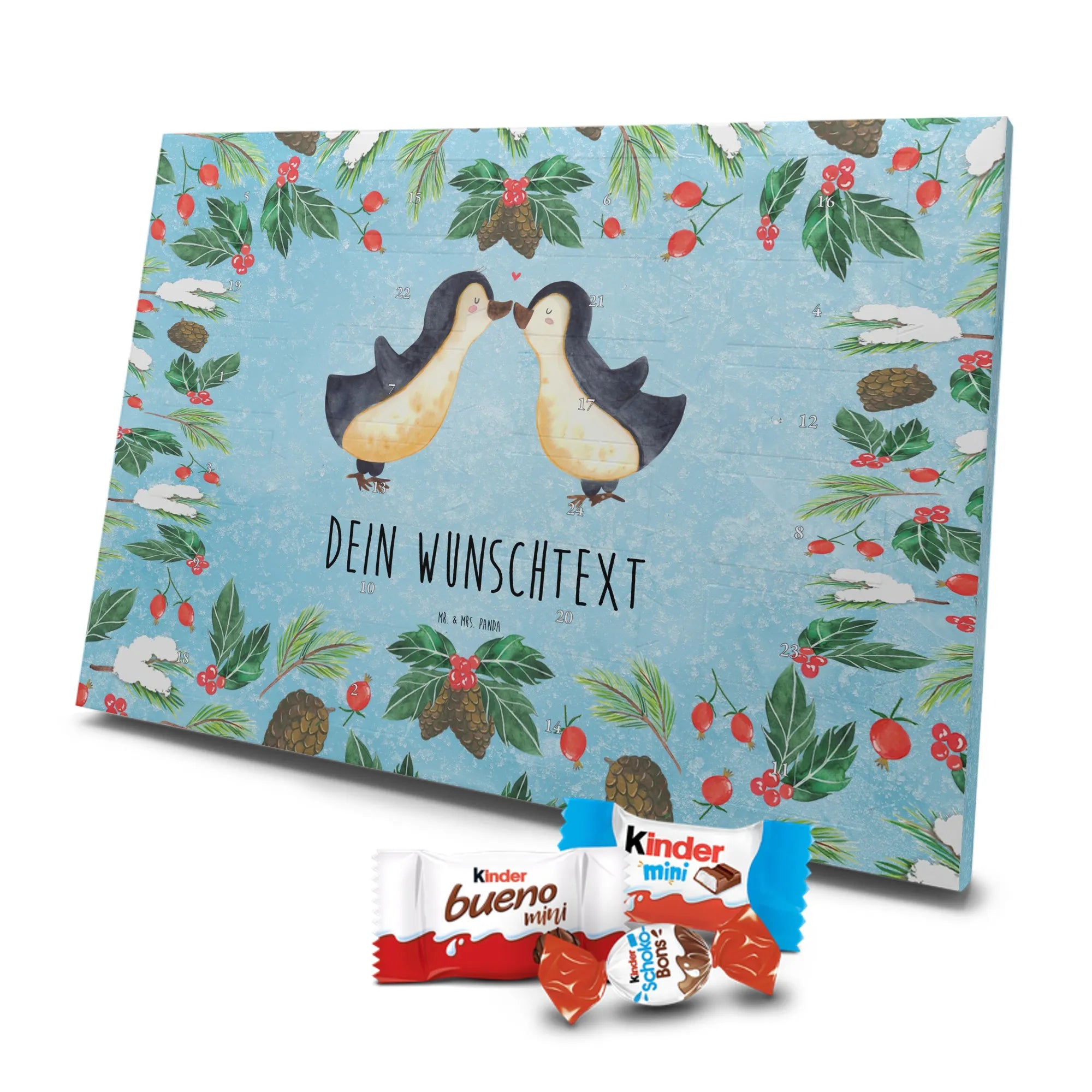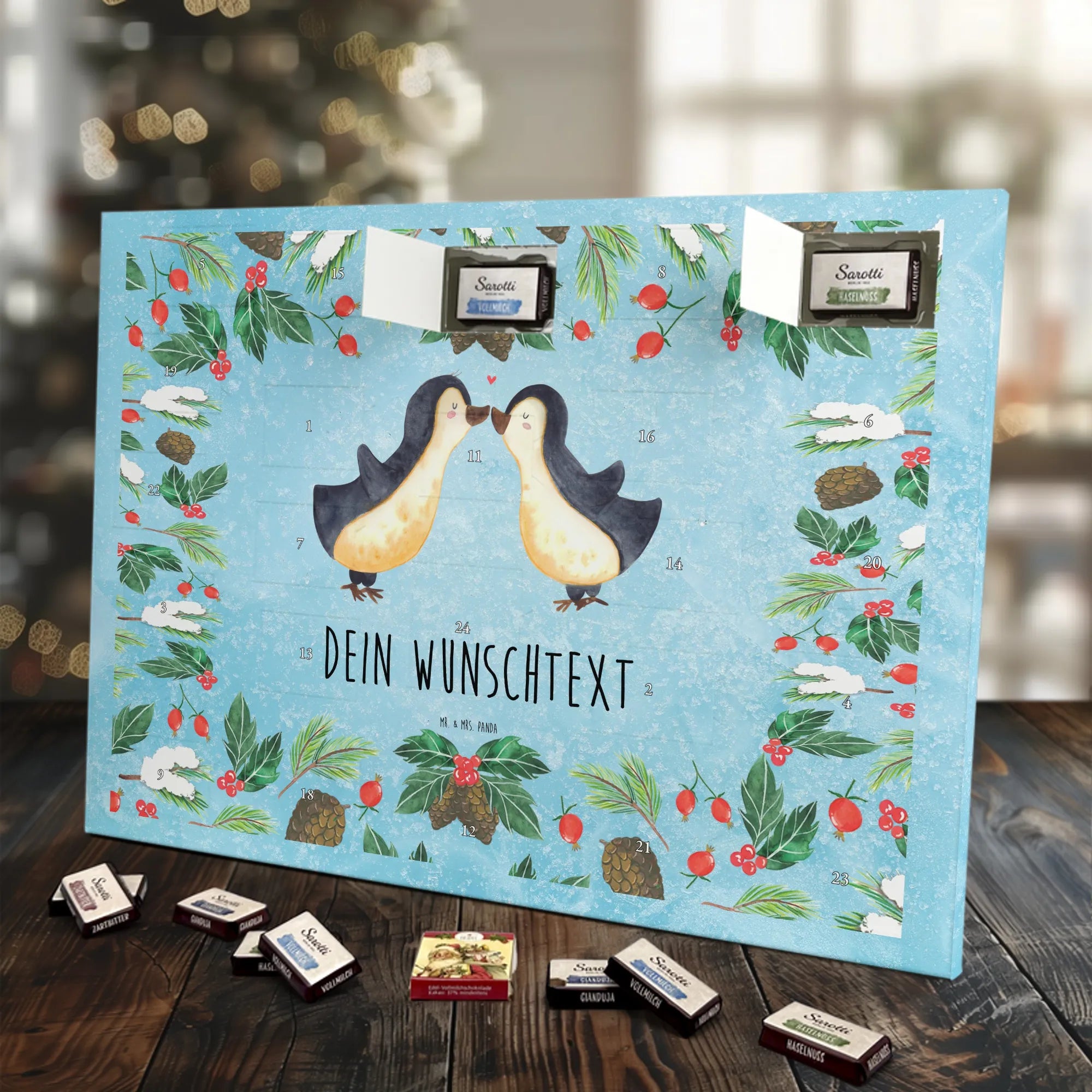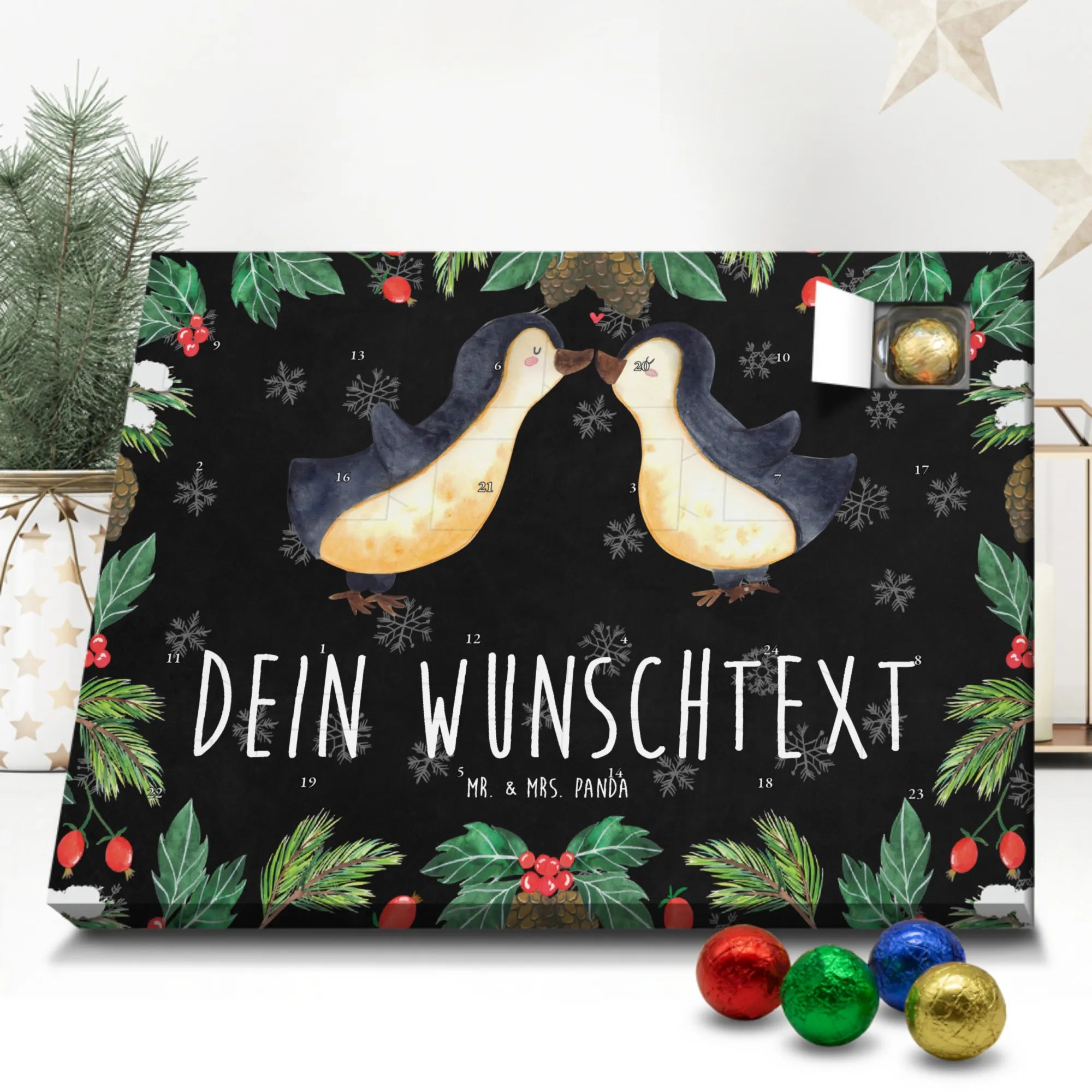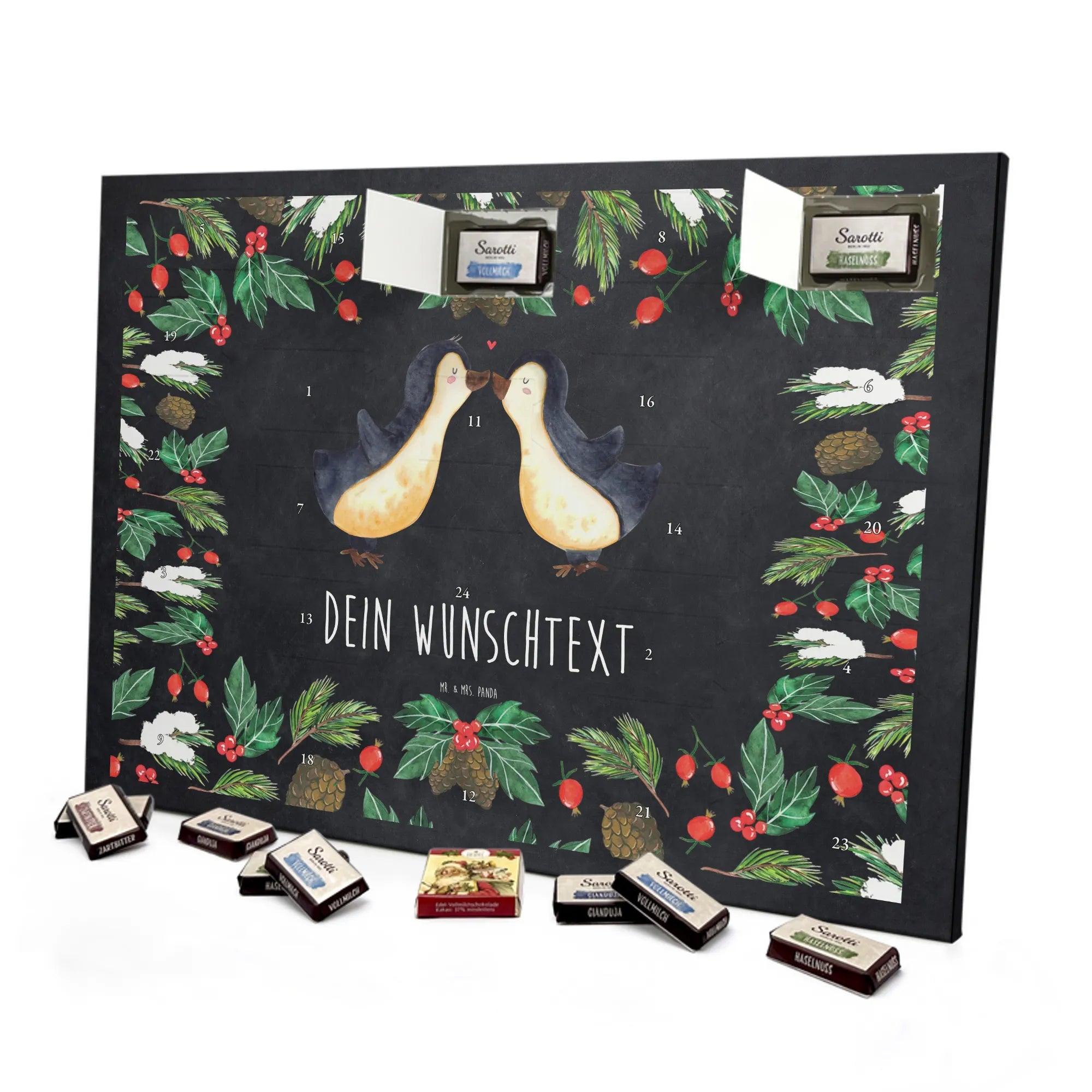 Personalisierter Schoko Adventskalender „Pinguine Kuss“ – das liebevolle Geschenk aus der Mr. & Mrs. Panda Liebe-Kollektion. Auf dem Motiv kuscheln zwei handgezeichnete Pinguine und schenken sich einen zarten Kuss. Der dazugehörige Spruch „Wenn ich an dich denke, kribbelt es in meinem Bauch und ich muss grundlos lächeln.“ macht den Kalender zum täglichen Liebesgruß für deinen Schatz. ❤️