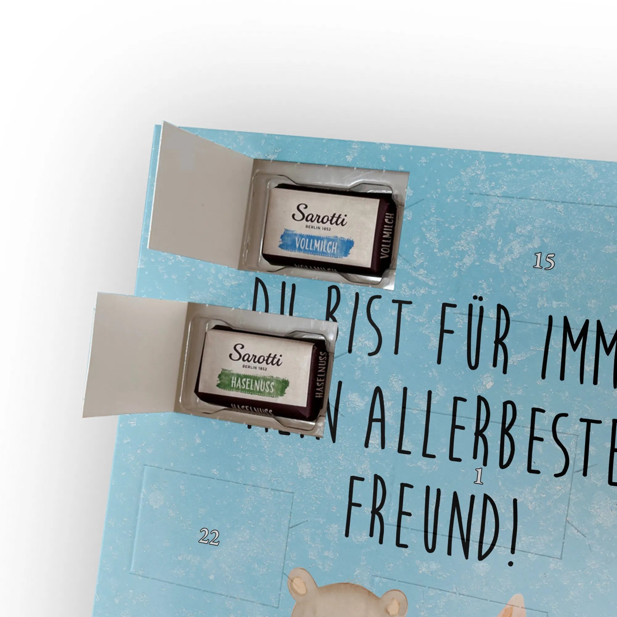 Personalisierter Schoko Foto Adventskalender – ein liebevoll gestaltetes Geschenk von Mr. & Mrs. Panda, perfekt für kuschelige Vorweihnachtszeiten! Dieser Adventskalender ist bedruckt mit wunderschönen Motiven und herzlichen Sprüchen von Mr. & Mrs. Panda und lässt sich ganz einfach mit deinem Lieblingsfoto personalisieren. Achte darauf, dass dein hochgeladenes Bild eine hohe Auflösung hat und der Bildausschnitt passt, damit das Druckergebnis klar und schön wird. Lade nur Fotos hoch, bei denen du die Rechte besitzt oder die Erlaubnis zur Nutzung hast, besonders bei Personenbildern. Der Kalender besticht durch brillante Druckqualität mit seidenmatter Oberflächenveredelung und bedruckten Seitenflächen. Maße: 355 mm x 245 mm x 11 mm – ideal zum Aufhängen oder Aufstellen. Besonderheit: Kann aufgehängt oder aufgestellt werden. Bitte beachte: Die Fotos werden weder aufbereitet noch zugeschnitten. Rücknahme bei personalisierten Foto Artikeln ist ausgeschlossen. Gefüllt mit hochwertiger Füllung aus 24 einzeln verpackten Schokoladentäfelchen in vier Geschmacksrichtungen (Sarotti® und Confiserie Heidel®). Insgesamt 107 g Markenschokolade von Sarotti® und Confiserie Heidel® in den Sorten Vollmilch, Nougat, Zartbitter und Haselnuss. Ein persönliches, süßes Highlight für Familie, Freunde oder deinen Schatz – mit viel Herz und den typischen Mr. & Mrs. Panda Motiven.