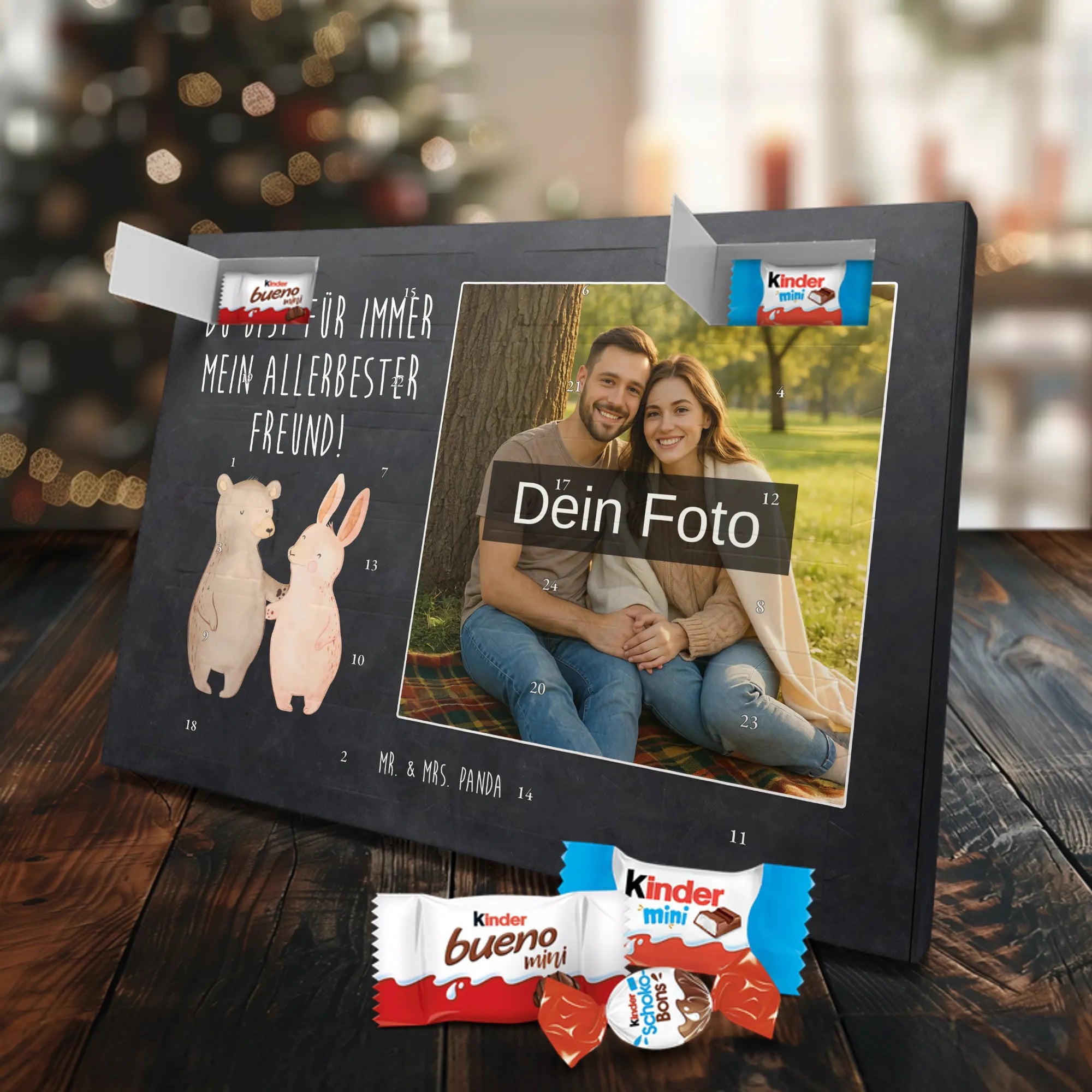 🐼 Personalisierter Schoko-Foto-Adventskalender mit deinem Bild, Mr. & Mrs. Panda Motiven und gefüllt mit kinder® Schokolade.