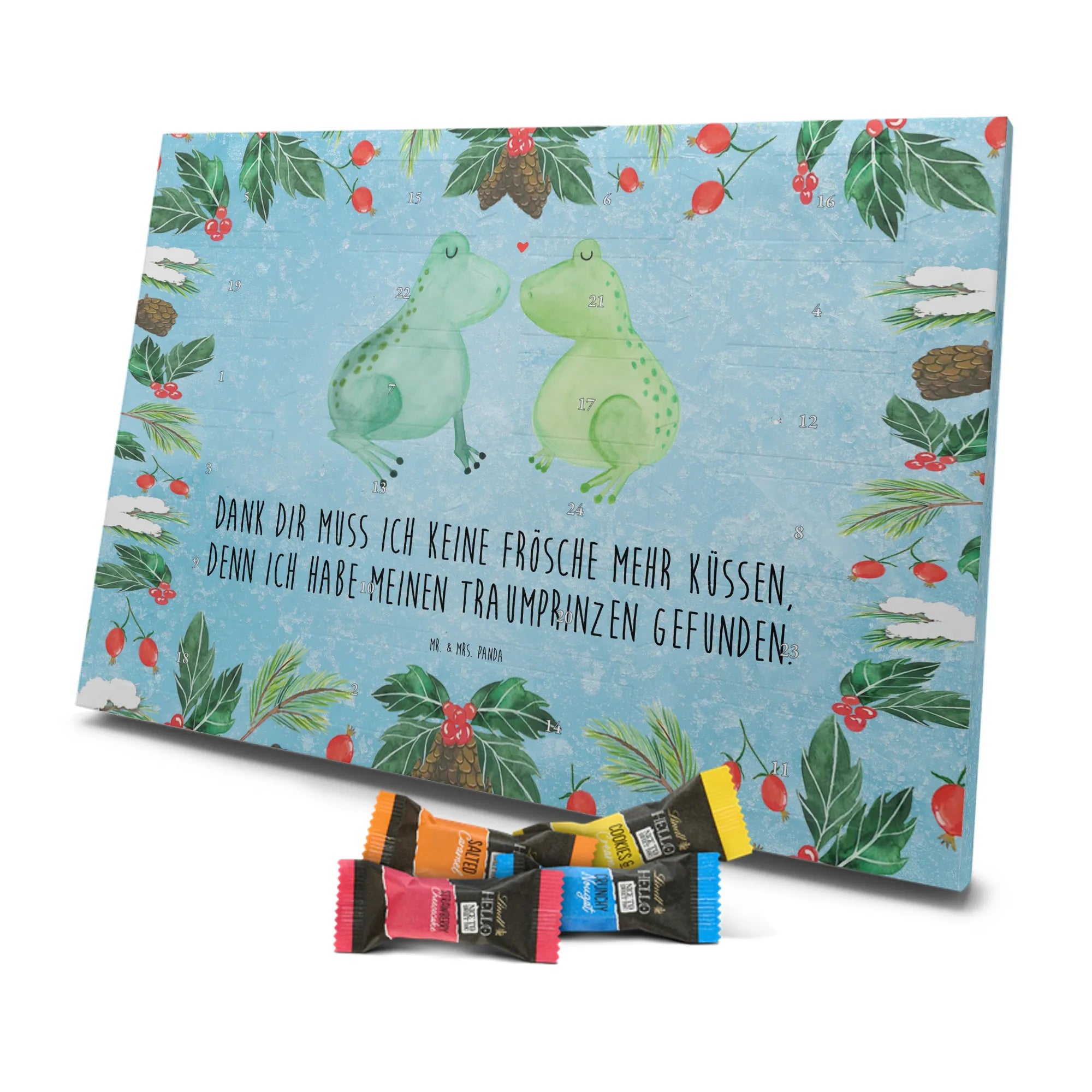 Entdecke den charmanten Schokoladen Adventskalender von Mr. & Mrs. Panda – ein kleines Kunstwerk für alle Schoko-Liebhaber. Der Schoko-Adventskalender ist mit liebevollen Illustrationen und kurzen Sprüchen bedruckt und verbreitet gemütliche Vorfreude auf Weihnachten. Er ist nicht personalisierbar, aber durch die brillante Druckqualität und die seidenmatte Oberflächenveredelung ein echtes Hingucker-Produkt. Auch die Seitenflächen sind bedruckt, was dem Kalender ein rundum schönes Erscheinungsbild verleiht. Maße: 325 mm x 225 mm x 27 mm. Das praktische Design erlaubt es, den Kalender aufzuhängen oder aufzustellen. Gefüllt mit Lindt Hello Schokolade: 24 einzeln verpackte Mini Sticks in vier leckeren Sorten – Karamell-Schokoladenkuchen, Kekse, Knuspriger Nougat und Erdbeer-Cheesecake. Zutaten sind u. a. Zucker, Kakaobutter, Vollmilchpulver, Haselnüsse und weitere Zutaten; Allergene: Milcheiweiß, Milchzucker, Soja, Weizen, Haselnüsse; kann Spuren von Mandeln und anderen Schalenfrüchten enthalten. Ideal als Geschenk oder zum Selbernaschen – einfach jeden Tag ein Türchen öffnen und genießen.