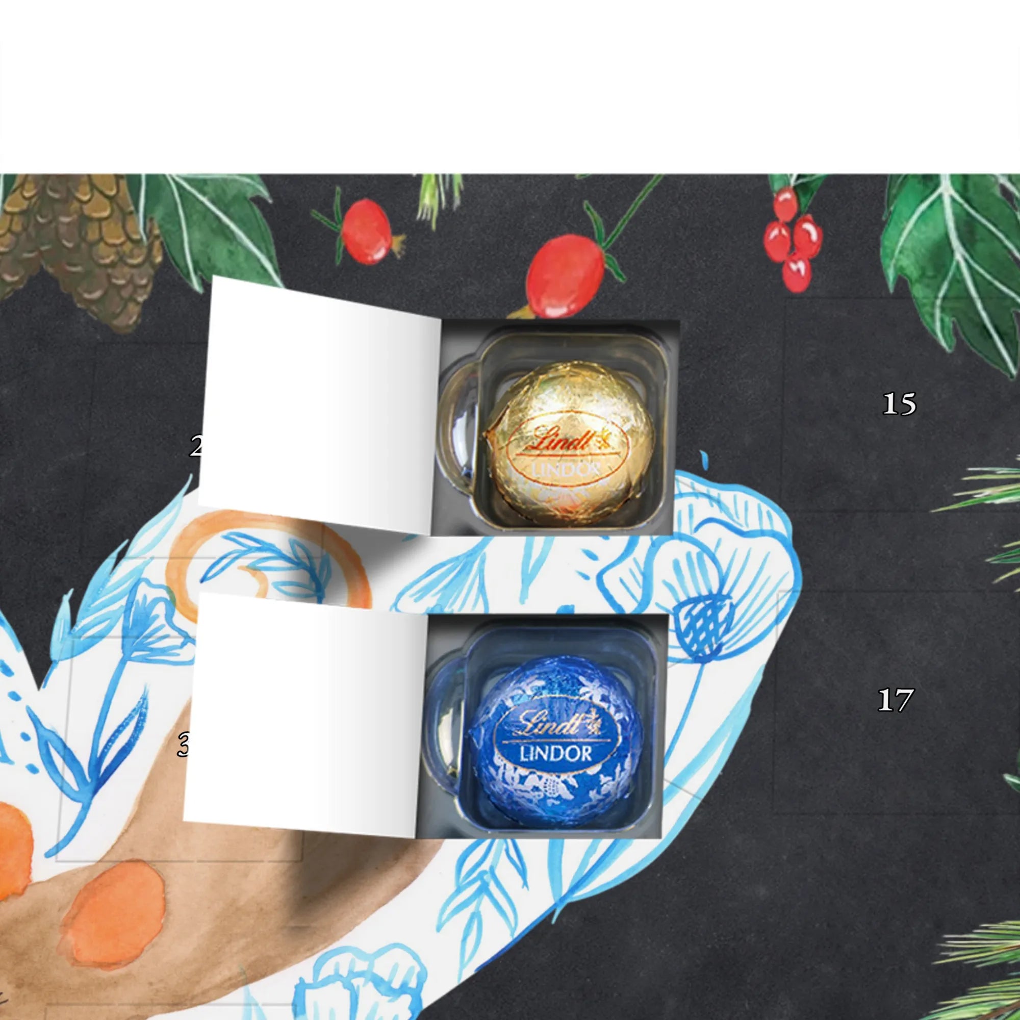 Unser liebevoller Schokoladen Adventskalender von Mr. & Mrs. Panda ist perfekt für alle, die sich eine fröhliche und süße Adventszeit wünschen. Aufwendig bedruckt mit unseren typischen Motiven & Sprüchen, nicht personalisierbar – dafür aber unglaublich hübsch anzusehen. Die brillante Druckqualität mit seidenmatter Oberflächenveredelung verleiht dem Kalender ein edles Aussehen, und die bedruckten Seitenflächen runden das Design ab. Maße: 233 mm x 178 mm x 24 mm. Besonderheit: kann aufgehängt oder aufgestellt werden, so bleibt er flexibel für deinen Deko-Stil. Gefüllt mit Lindt Lindor: 24 einzeln verpackte Markenschokoladen Kugeln in drei leckeren Sorten – Vollmilch, Feinherb und Weiße Schokolade – sorgen für tägliche Genussmomente. Zutaten: Zucker, pflanzliches Fett (Kokosnuss, Palmkern), Kakaobutter, Vollmilchpulver, Kakaomasse, Milchzucker, Magermilchpulver, Butterreinfett, Emulgator (Sojalecithin), Gerstenmalzextrakt, Aromen. Besondere Hinweise: Kann Haselnüsse und Mandeln enthalten. Ein tolles Geschenk oder eine hübsche Dekoration – unser Schokoladen Adventskalender macht die Wartezeit bis Weihnachten noch schöner!