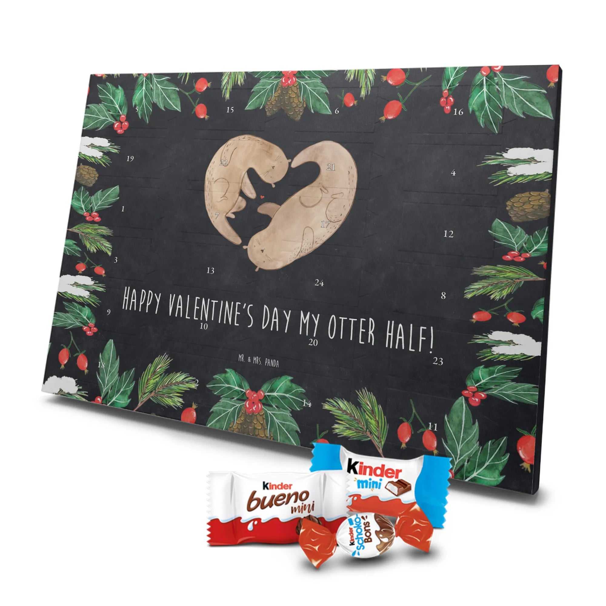 Mr. & Mrs. Panda präsentiert: Der Schoko Adventskalender "Otter Valentine" aus der Kollektion Liebe – ein zärtliches Geschenk voller süßer Überraschungen. Auf dem Motiv sind zwei Otter liebevoll gezeichnet, die zusammen ein Herz formen. Der Slogan „Happy valentine's day my otter half!“ macht den Kalender zu einem perfekten Liebesgeschenk für Valentinstag, Jahrestag oder einfach als Mitbringsel für Deinen Schatz.