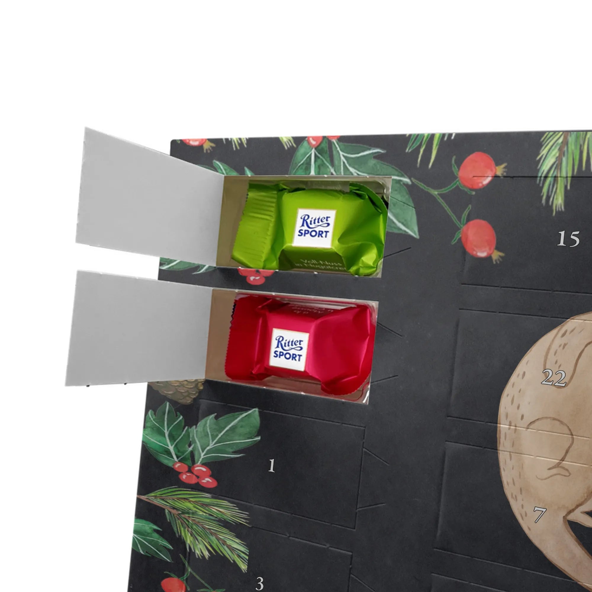 Adventskalender mit Schokolade – so schmeckt Vorfreude! Unser Mr. & Mrs. Panda Adventskalender ist liebevoll gestaltet und bedruckt mit wunderschönen Motiven & Sprüchen, die jeden Tag versüßen. Die brillante Druckqualität mit seidenmatter Oberflächenveredelung sorgt für ein edles Finish, und auch die Seitenflächen sind hübsch bedruckt. Der Kalender ist nicht personalisierbar, dafür aber vielseitig einsetzbar: Maße: 325 mm x 225 mm x 27 mm und die besondere Eigenschaft, dass du ihn aufgehängt oder aufgestellt verwenden kannst, geben dir Flexibilität bei der Dekoration. Gefüllt ist der Kalender mit Ritter Sport Schokowürfeln in beliebten Geschmacksrichtungen wie Mousse au Chocolat, Schoko Crisp, Voll-Nuss in Nougatcreme, Karamell Duo, Joghurt und Erdbeer-Joghurt. Wichtig: Es handelt sich um einen Kalender gefüllt mit Ritter Sport Schokolade, nicht um einen Kalender der Marke Ritter Sport. Ideal als Geschenk oder als Adventsdeko für dein Zuhause – kleine Schokofreuden warten hinter jedem Türchen.