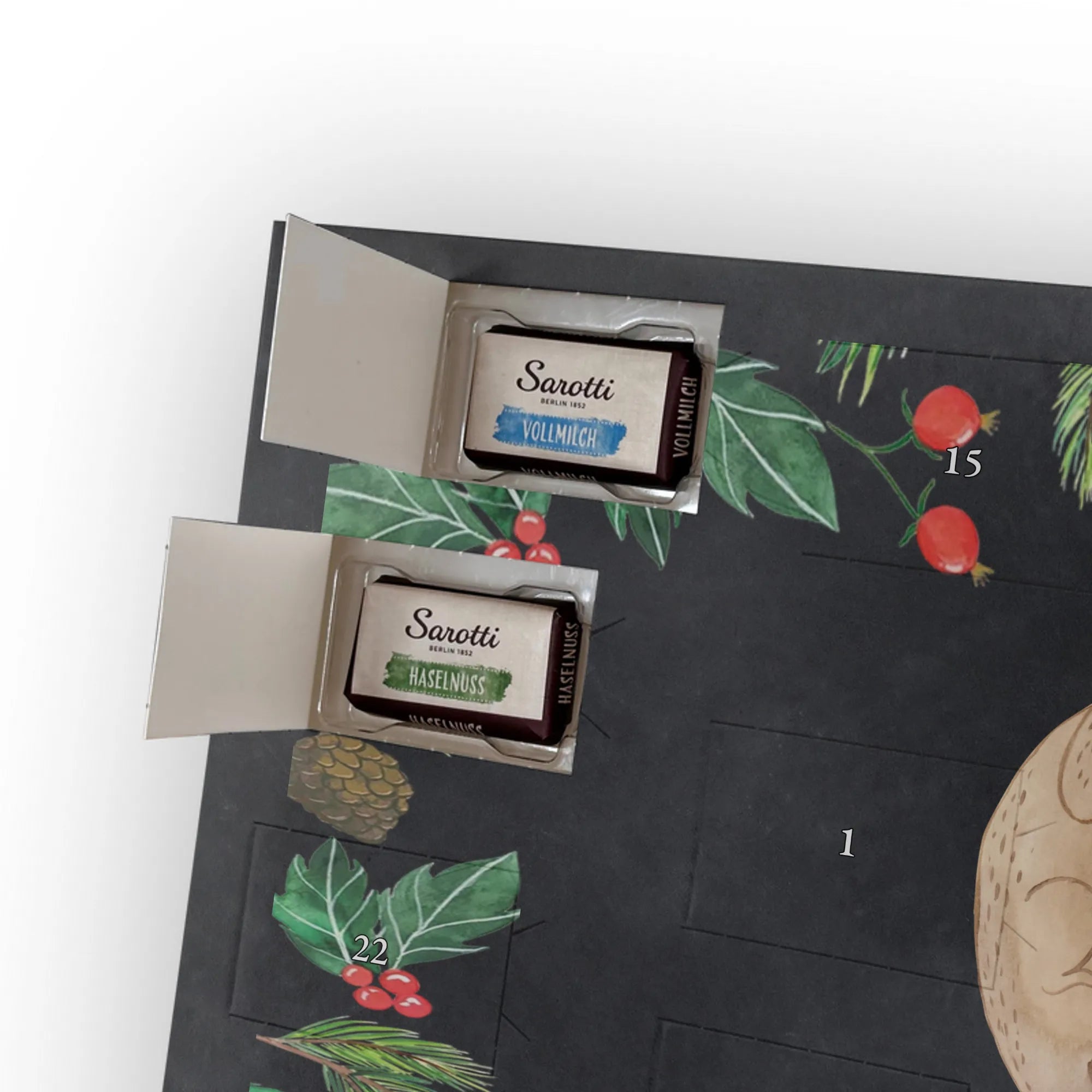 🐼 Schoko-Adventskalender: Liebevolles Design, seidenmatt, brillanter Druck – ein Hingucker.