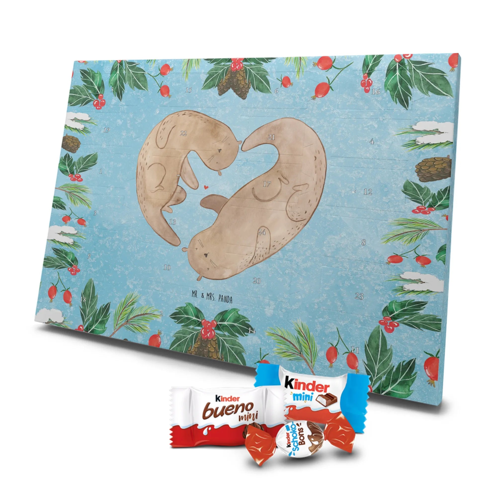 Unser Schokoladen Adventskalender aus der Liebe-Kollektion von Mr. & Mrs. Panda ist das ideale Liebesgeschenk für Freundin, Freund, Partner oder Ehepartner. Das Motiv zeigt zwei Otter, die sich an den Pfoten halten und zusammen ein Herz formen – eine liebevolle Illustration in warmen Brauntönen vor eisblauem Hintergrund, die sofort für Kuschelstimmung sorgt.