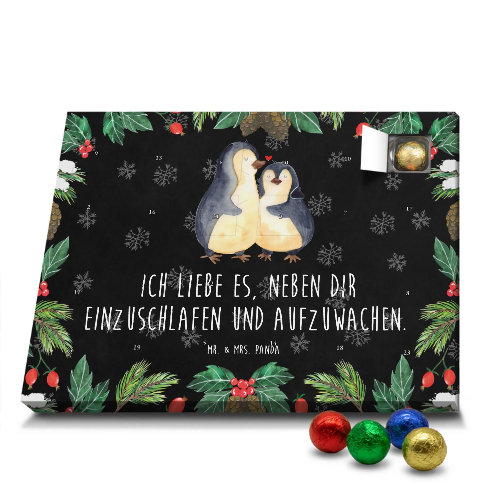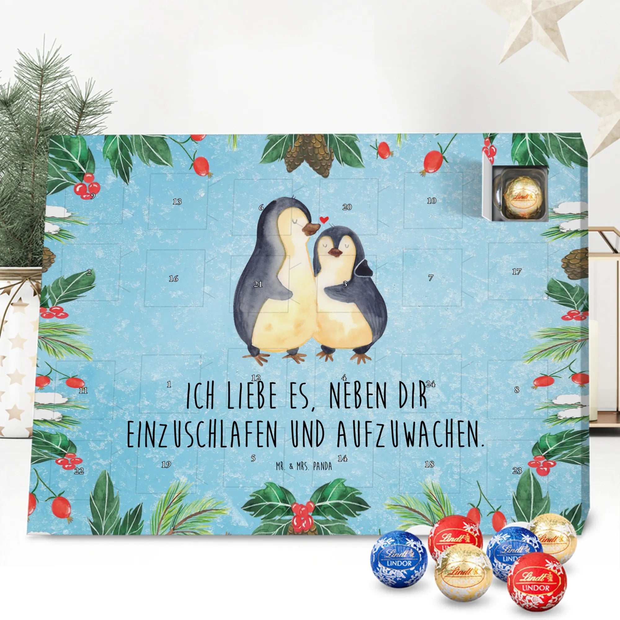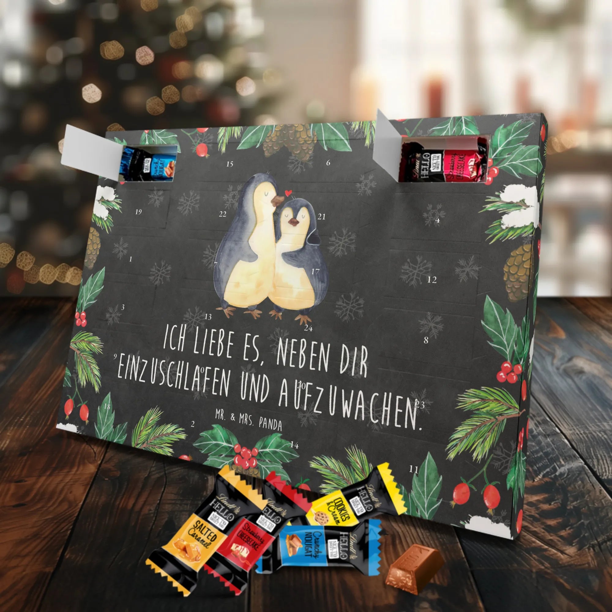 Mr. & Mrs. Panda Schoko Adventskalender „Pinguine Einschlafen“ – Ein liebevoller Adventsbegleiter aus der Liebe-Kollektion. Auf dem Motiv kuscheln zwei handgezeichnete Aquarell-Pinguine innig aneinander, darüber schwebt ein kleines rotes Herz. Der zarte Spruch „Ich liebe es, neben dir einzuschlafen und aufzuwachen.“ macht diesen Adventskalender zu einem besonders romantischen Geschenk.