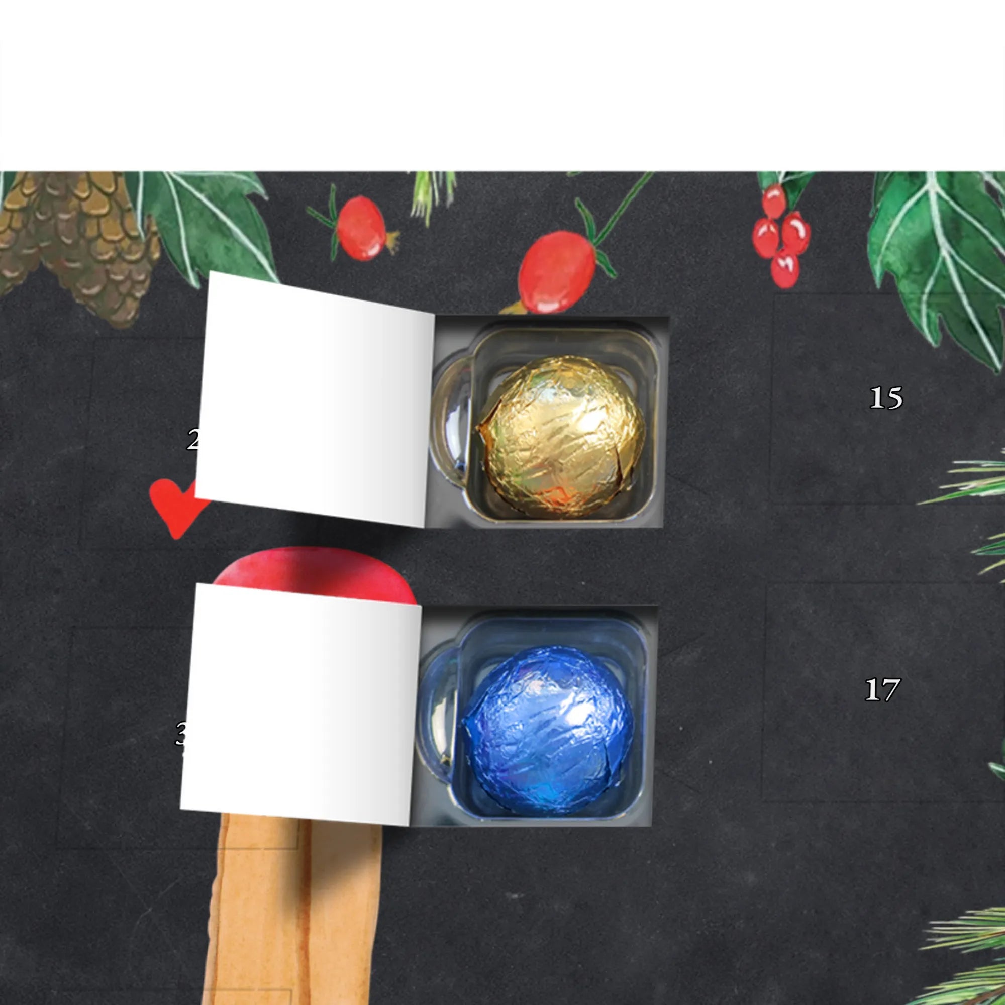 Wunderschöner Schokoladen-Adventskalender von Mr. & Mrs. Panda – süßes Design trifft hochwertige Verarbeitung. Unser Schokoladen-Adventskalender ist bedruckt mit wunderschönen Motiven & Sprüchen von Mr. & Mrs. Panda und nicht personalisierbar, dafür aber mit liebevollen Details gestaltet. Die brillante Druckqualität mit seidenmatter Oberflächenveredelung verleiht dem Kalender ein edles Finish, und auch die Seitenflächen sind bedruckt für einen rundum stimmigen Look. Maße: 233 mm x 178 mm x 24 mm. Die Konstruktion erlaubt sowohl das Aufstellen als auch das Aufhängen – Besonderheit: kann aufgehängt oder aufgestellt werden. Gefüllt mit MARKENNAMEN Schokolade und mit leckeren Schokoladenkugeln bestückt, ist jeder Dezembertag eine kleine Belohnung. Bitte lies die besonderen Hinweise: (Kann Spuren von Haselnüssen, Mandeln, Gluten und Soja enthalten!), kühl und trocken lagern. Ideal als Geschenk, Adventsdekoration oder süße Überraschung für Freunde und Familie. Mr. & Mrs. Panda wünscht dir eine gemütliche und genussvolle Adventszeit!