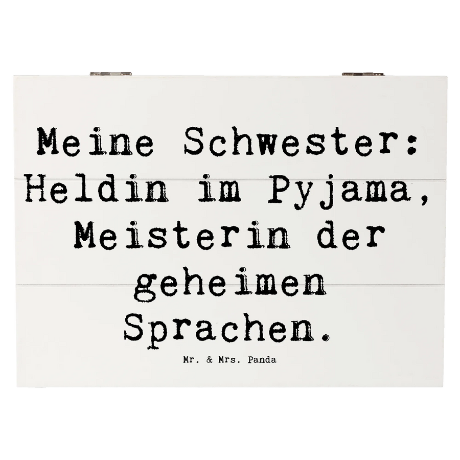 Die wunderschöne Holzkiste von Mr. & Mrs. Panda mit dem Motiv "Meine Schwester: Heldin im Pyjama, Meisterin der geheimen Sprachen" ist das perfekte Geschenk für jede Schwester!