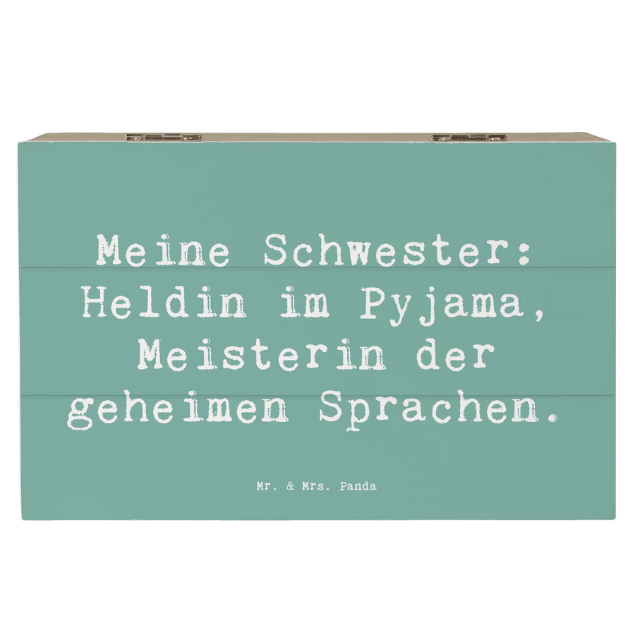 Die wunderschöne Holzkiste von Mr. & Mrs. Panda mit dem Motiv "Meine Schwester: Heldin im Pyjama, Meisterin der geheimen Sprachen" ist das perfekte Geschenk für jede Schwester!