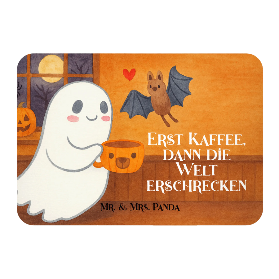 Kaffee und Kuschelgefühl in einem Bild: Dieses Motiv zeigt ein fröhliches Gespenst mit einer Tasse, die selbst wie ein winziges Gespenst lächelt. Die Szene ist so gestaltet, dass sie sofort Gemütlichkeit ausstrahlt — sanfte Farben, liebevolle Details und eine kleine Fledermaus, die vertrauensvoll neben dem Gespenst schwebt. Ein kleines rotes Herz über der Fledermaus macht die Verbindung zueinander spürbar und lässt das Bild noch wärmer wirken. Für alle, die Kaffee nicht nur trinken, sondern in kleinen Ritualen genießen, ist dieses Motiv ein zauberhafter Begleiter: Es erinnert dich daran, dass ein Moment mit deiner Lieblingstasse etwas Magisches haben kann. Ob auf Textilien, Tassen oder als Wandbild — dieses Motiv schenkt dir täglich ein Lächeln und passt perfekt zu gemütlichen Morgen und entspannten Nachmittagen.