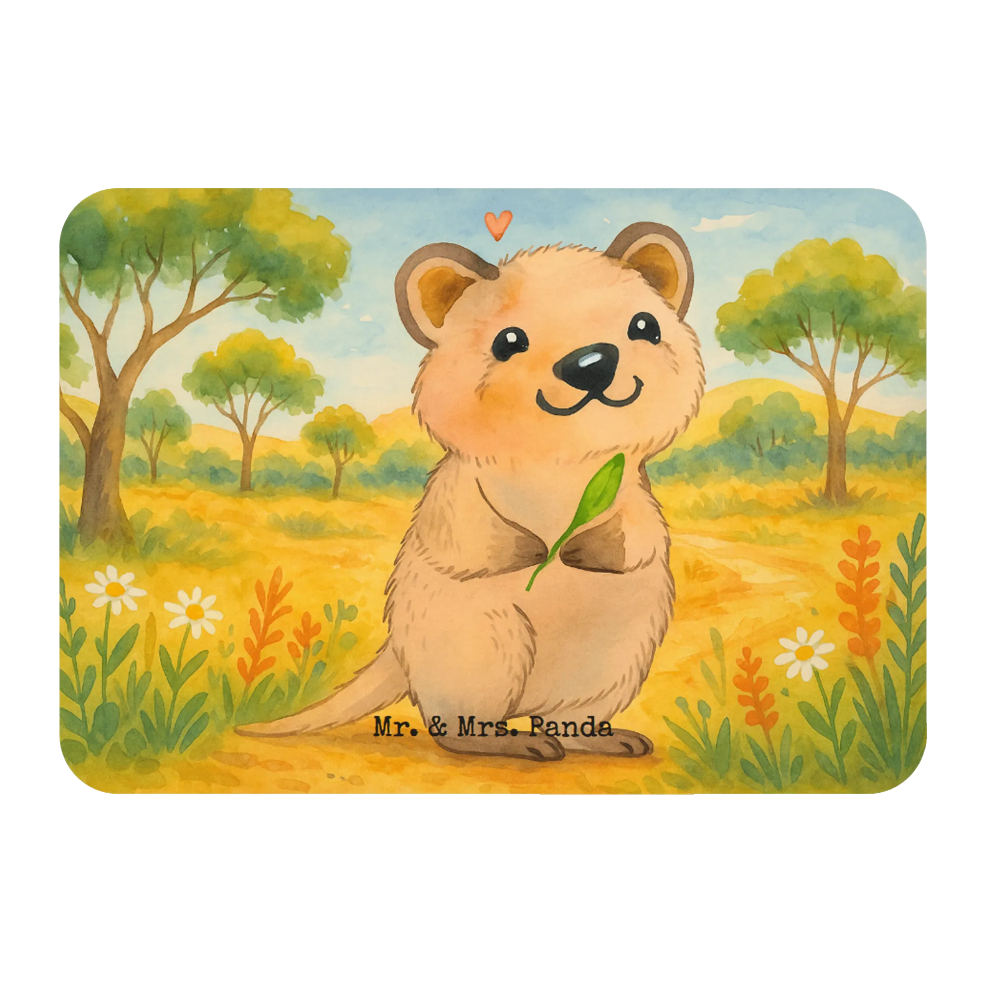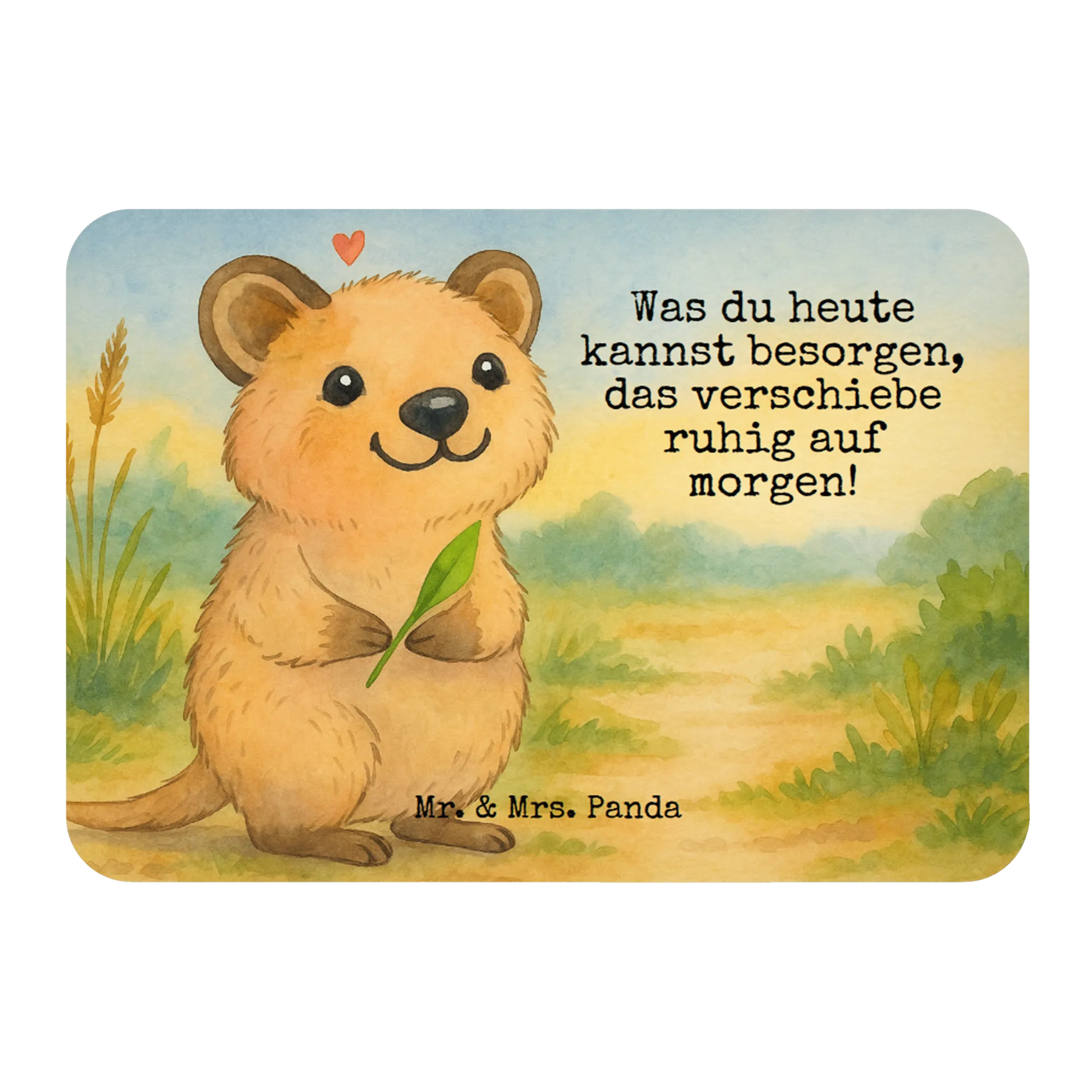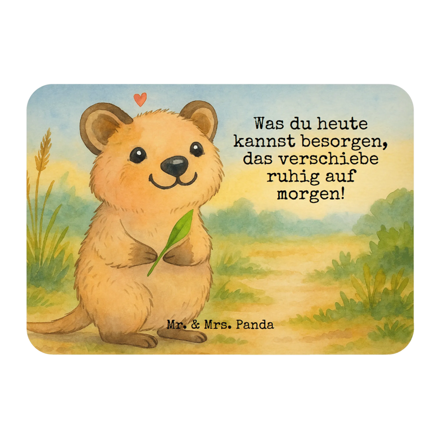 Stellen Sie sich ein Quokka vor, das freudestrahlend aufrecht steht und sich mit einem grünen Blatt beschäftigt. Dieses entzückende Wesen schenkt uns ein sanftes Lächeln, welches durch ein sanftes, rosa Herz über seinem Kopf noch verstärkt wird. Sein freundliches Antlitz erinnert uns daran, dass manchmal die kleinen Freuden und die Verspieltheit im Leben mehr zählen als eine ständige Besorgnis um unsere To-do-Liste. 'Was du heute kannst besorgen, das verschiebe ruhig auf morgen!' mag wie ein lustiger Spruch klingen, doch in diesem liebevoll gezeichneten Motiv findet sich eine tiefere Botschaft. Es geht darum, sich Pausen zu gönnen, den Moment zu genießen und sich selbst nicht zu überfordern. In der wunderbaren Darstellung des Quokkas durch Mr. & Mrs. Panda wird das Gefühl vermittelt, dass alles zu seiner Zeit kommt und dass es in Ordnung ist, sich selbst auch mal eine Auszeit zu gönnen.