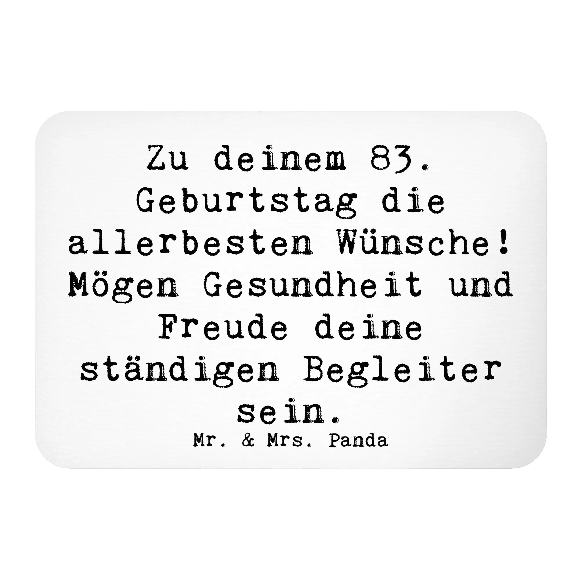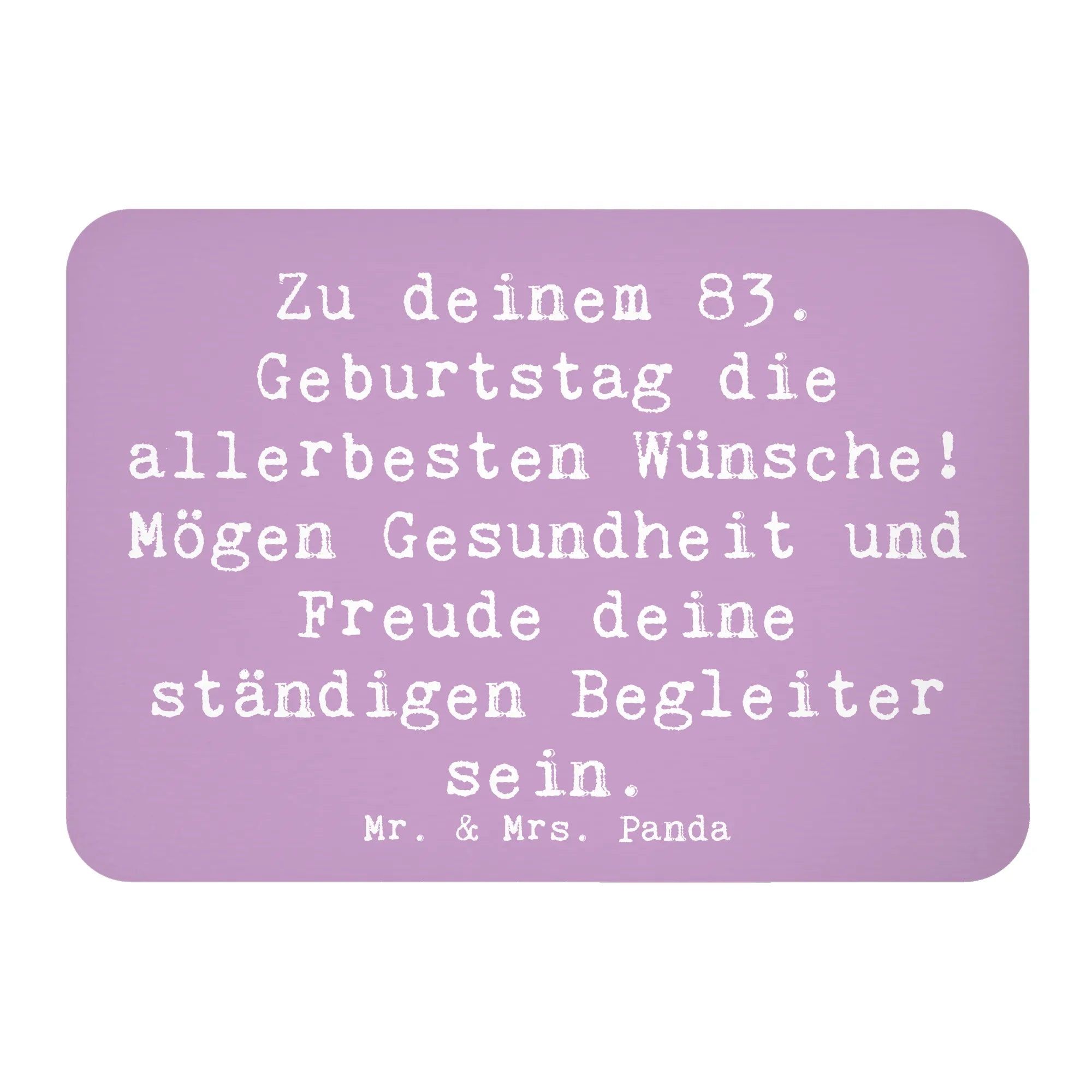 Der Kühlschrankmagnet "Zu deinem 83. Geburtstag die allerbesten Wünsche! Mögen Gesundheit und Freude deine ständigen Begleiter sein." von Mr. & Mrs. Panda ist das perfekte Geschenk für all jene, die diesen besonderen Tag im Leben gebührend feiern möchten. Mit einem liebevollen, handgezeichneten Design und einem herzlichen Spruch ist dieser Magnet nicht nur eine fröhliche Kühlschrankdekoration, sondern auch ein praktisches Utensil für deinen Alltag. Lassen Sie sich von der Lebensfreude anstecken, die dieser Magnet ausstrahlt!