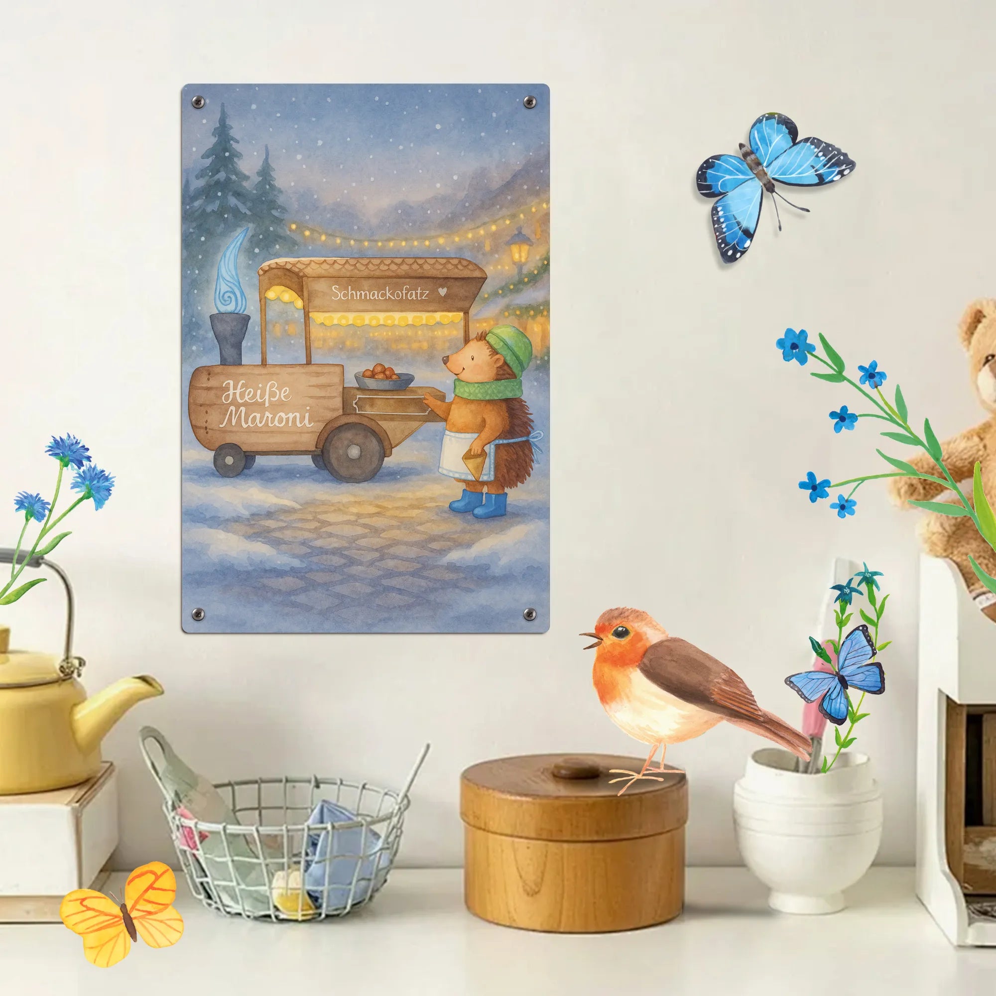 Wenn du den Weihnachtsmarkt besuchst, achte auf unseren kleinen Igel, der an seinem Stand die köstlichsten Maronen verkauft. Während sein Stand von leuchtenden Lichtern umgeben ist, versprüht er Freude und lädt alle ein, sich eine Tüte mit frisch gerösteten Kastanien zu gönnen. Der herrliche Duft der Maronen zieht die Blicke auf sich und weckt in jedem von uns Kindheitserinnerungen. Es sind nicht nur die Maronen, die hier gelebt werden, es ist eine Atmosphäre, die uns einlädt, innezuhalten und die kleinen Freuden des Lebens zu genießen. Der Igel ist stets gut gelaunt und unterhält sich mit seinen Gästen, während er die köstlichen Maronen serviert. Ein Füllhorn an guten Momenten, die dich bei jedem Biss begleiten!