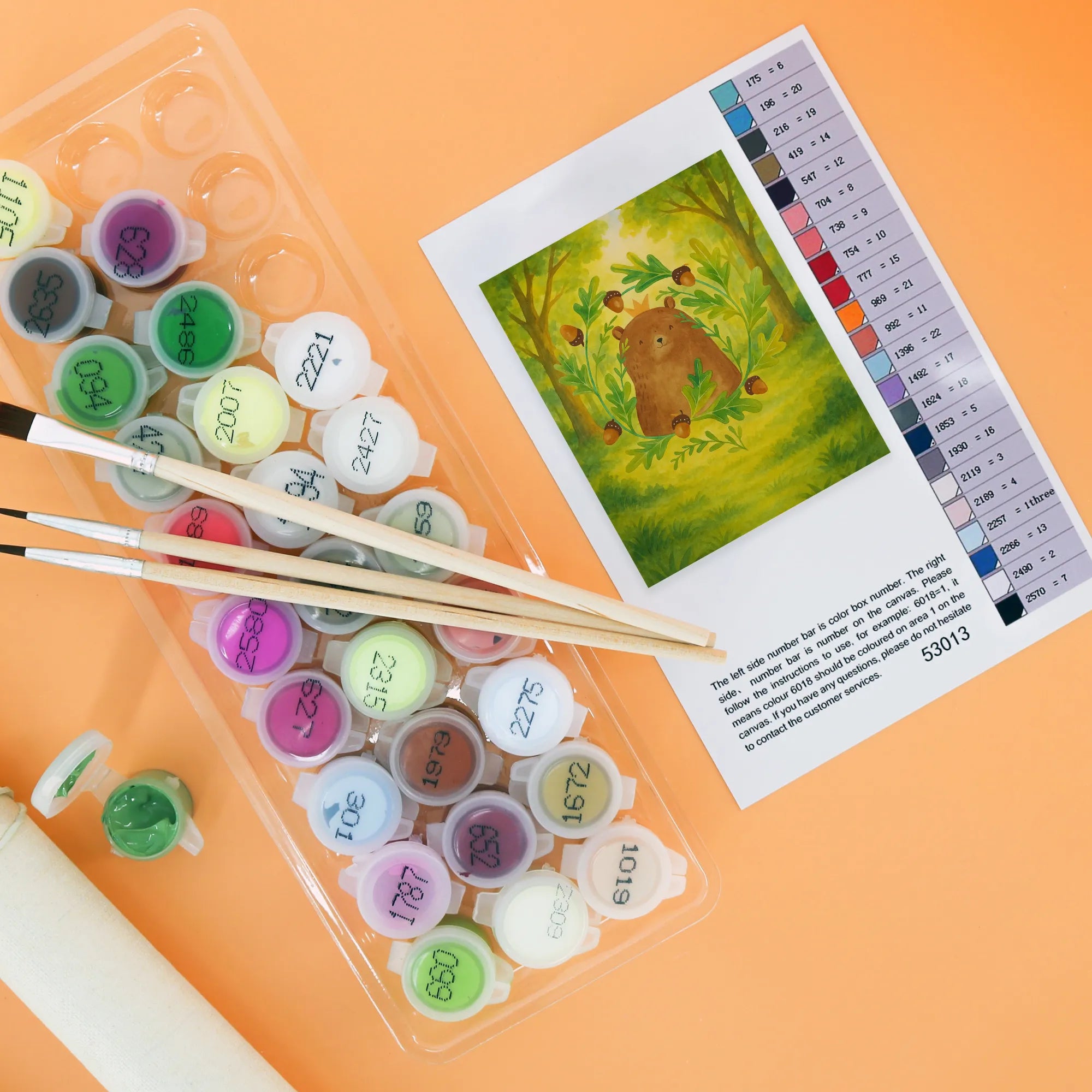 Inhalt des Sets: Das DIY Set enthält eine vorgedruckte Leinwand (mit Rahmenoption), abgestimmte Farben und drei formstabile Pinsel sowie eine verständliche Malanleitung. Die 24 Farben sind ideal für ein stimmiges Ergebnis, das lebendig und harmonisch wirkt.