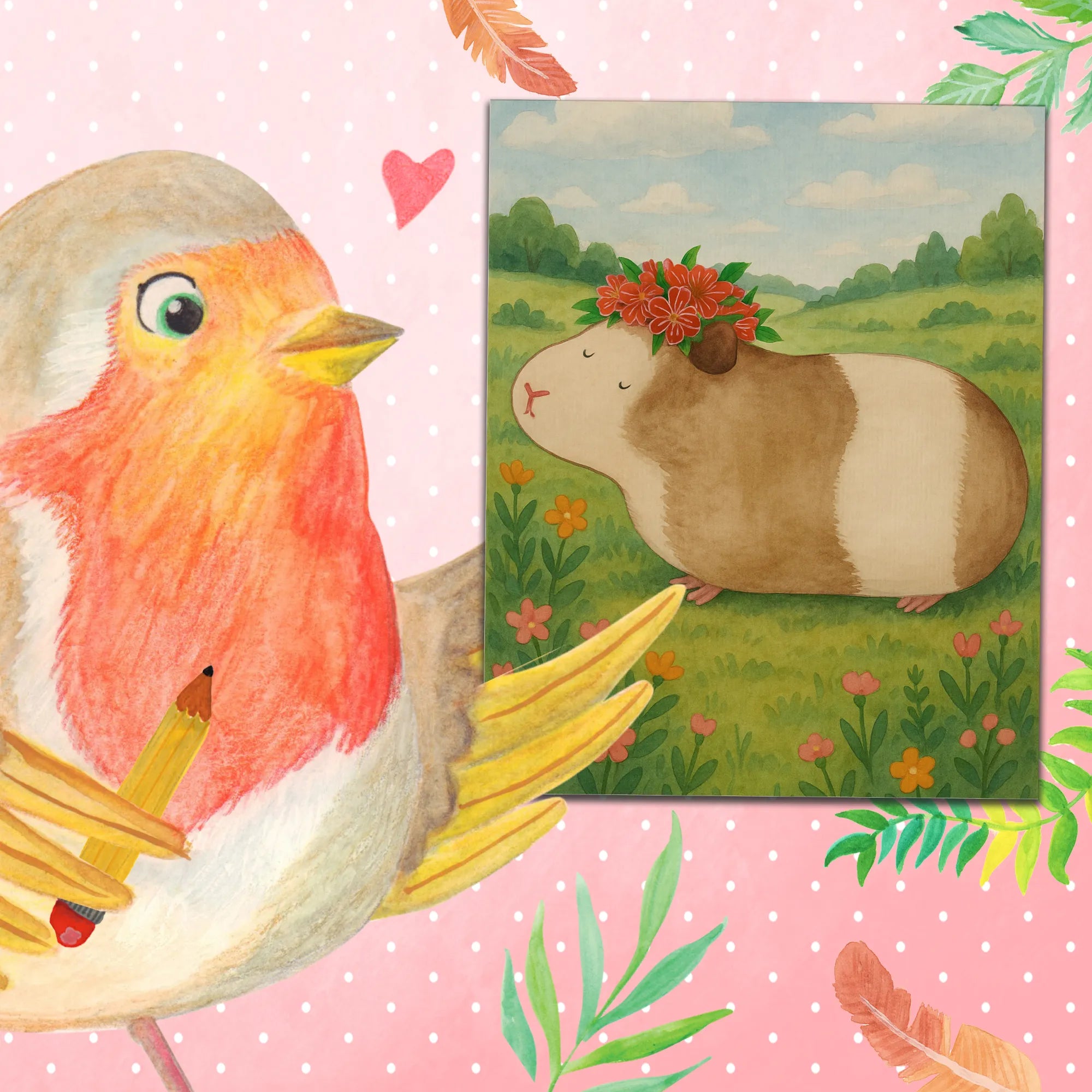 In einem bunten, magischen Wunderland lebt ein Meerschweinchen, das alle mit seiner Weisheit und seinem Charme überrascht. Dieses besondere Meerie hat die Gabe, das Leben auf eine Art zu betrachten, die uns oft fehlt. Es inspiriert dazu, das Gewöhnliche zu schätzen und das Verborgene zu erkennen. Mit jedem Schritt lädt es uns ein, die kleinen Wunder um uns herum zu entdecken und das Leben in vollen Zügen zu genießen. Seine süße Art erinnert uns daran, dass jeder Tag die Möglichkeit bietet, etwas Neues zu lernen und zu wachsen. Es lehrt uns, dass Weisheit nicht immer aus großen Erfahrungen kommt, sondern oft aus den einfachsten Dingen – einem Lächeln, einer Umarmung oder dem Duft frischer Blumen. Lass uns inspirieren lassen von diesem kleinen Blumenkind, das uns zeigt, wie wir mit Freude und Motivation durch das Leben gehen können!