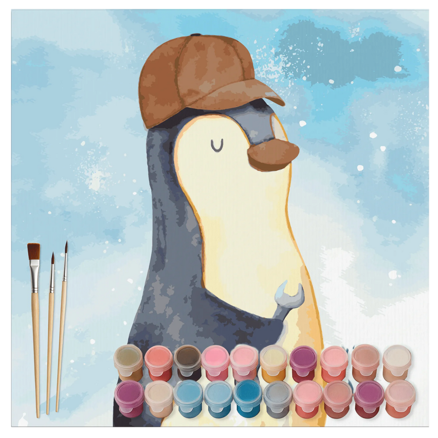 Auf der hübschen Leinwand ist ein fröhlicher Pinguin zu sehen, der mit einem Schraubenschlüssel in der Flipperflosse zeigt, dass er bereit ist, alle Herausforderungen anzunehmen. Mit diesem Set tauchst du in die Welt der Farben ein und kannst dein eigenes Meisterwerk schaffen.