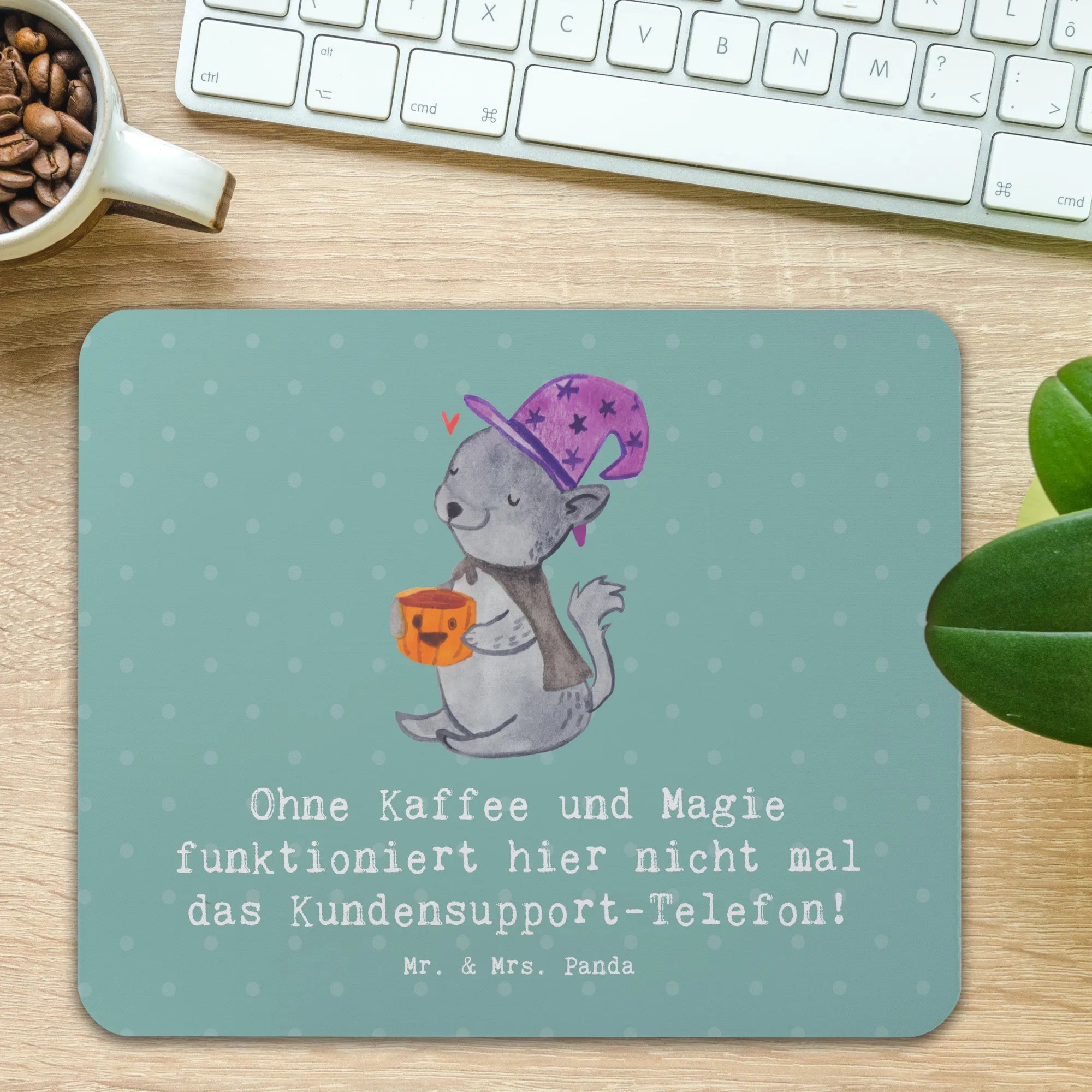 Doch das ist noch nicht alles! Der witzige Spruch "Ohne Kaffee und Magie funktioniert hier nicht mal das Kundensupport-Telefon!" sorgt für gute Laune und ein Schmunzeln in stressigen Momenten. Es ist ein kleines Stück Motivation, das den Arbeitsalltag aufhellt und den perfekten Gesprächseinstieg für die Kundensupporterinnen darstellt.