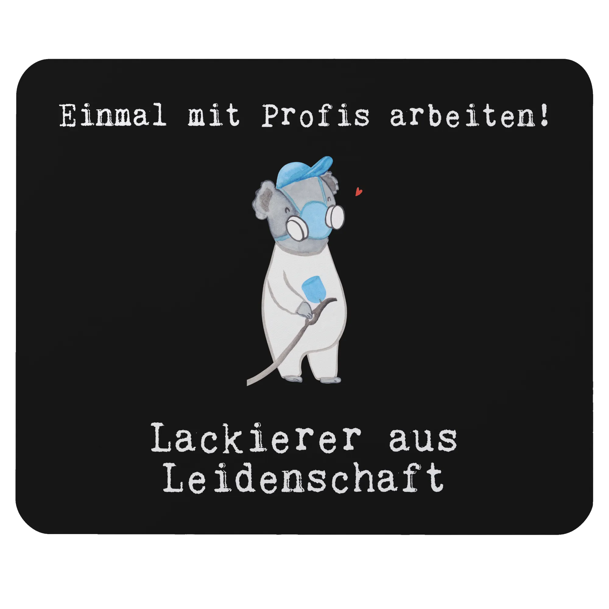 Der süße Koala in einem Blaumann, mit Atemschutzmaske und Spritzpistole, sorgt für das gewisse Etwas und bringt ein Lächeln in jeden Arbeitstag. Das Motiv wird von einem witzigen Spruch umrahmt: 'Lackierer aus Leidenschaft'.