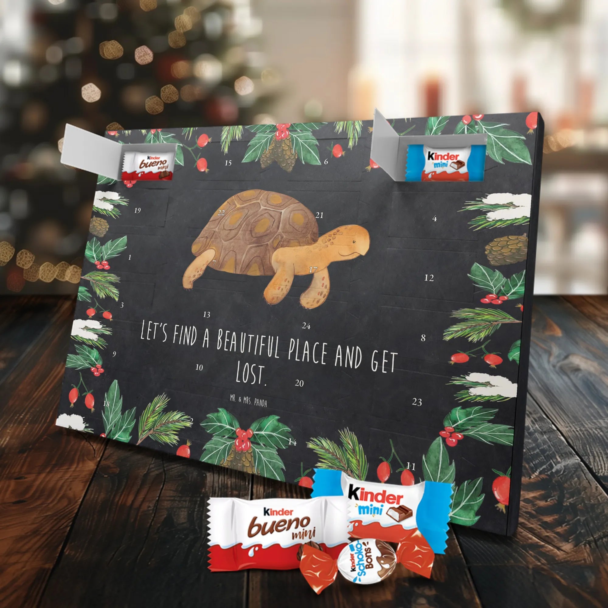 Unser Schokoladen Adventskalender von Mr. & Mrs. Panda bringt Charme und süße Überraschungen in deine Adventszeit. Liebevoll bedruckt mit wunderschönen Motiven & Sprüchen von Mr. & Mrs. Panda, ist dieser Kalender nicht personalisierbar, dafür aber mit hochwertiger Verarbeitung und stimmigem Design. Die brillante Druckqualität mit seidenmatter Oberflächenveredelung verleiht jedem Motiv eine edle Optik, und die bedruckten Seitenflächen runden das Gesamtbild ab. Maße: 355 mm x 245 mm x 11 mm. Eine praktische Besonderheit: kann aufgehängt oder aufgestellt werden – so passt er perfekt in jede Deko. Gefüllt mit Markenname Schokolade: Adventskalender gefüllt mit kinder® Schokolade. Inhalt: kinder® Schoko-Bons, kinder® Bueno mini und kinder® Schokolade mini. Mit 24 kleinen Leckereien hinter den Türchen ist dieser Kalender ideal für Kinder und alle Naschkatzen. Er eignet sich wunderbar als Adventsgeschenk oder als liebevolle Aufmerksamkeit für Kollegen und Freunde. Gönn dir oder anderen eine süße Adventszeit mit diesem bezaubernden Schokoladen Adventskalender!
