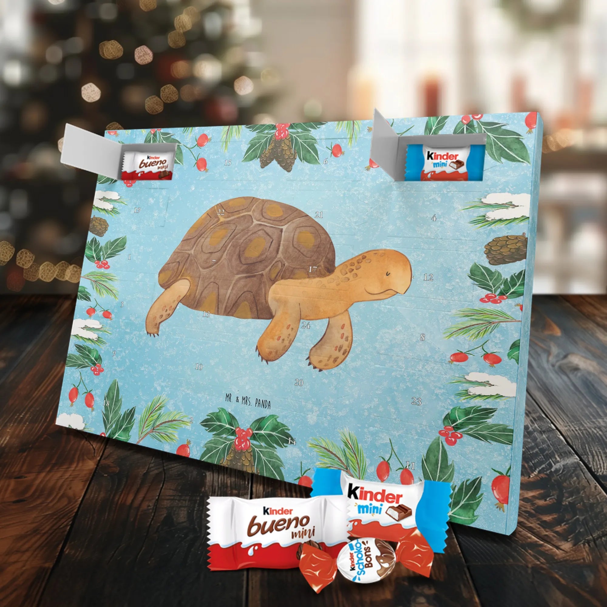 Wunderschöner Schoko Adventskalender von Mr. & Mrs. Panda – perfekt, wenn du die Vorweihnachtszeit mit einem liebevoll gestalteten Kalender versüßen möchtest. Unser Kalender ist bedruckt mit wunderschönen Motiven & Sprüchen von Mr. & Mrs. Panda und eignet sich hervorragend als Geschenk für Freunde, Familie oder einfach für dich selbst. Er ist nicht personalisierbar, dafür aber mit viel Liebe zum Detail gestaltet. Die brillante Druckqualität mit seidenmatter Oberflächenveredelung sorgt für edles Aussehen, und die bedruckten Seitenflächen geben dem Kalender einen wertigen Gesamteindruck. Maße: 355 mm x 245 mm x 11 mm. Besonderheit: kann aufgehängt oder aufgestellt werden – so findest du immer den perfekten Platz bei dir zuhause. Gefüllt mit Markenname Schokolade: Adventskalender gefüllt mit kinder® Schokolade. Inhalt: kinder® Schoko-Bons, kinder® Bueno mini und kinder® Schokolade mini. Der Kalender bietet 24 Türchen mit kleinen Überraschungen, die Kinderherzen höherschlagen lassen und Erwachsene schmunzeln. Er ist robust verarbeitet und ideal für den täglichen Genuss in der Adventszeit. Ob dekorativ auf der Kommode oder an der Wand aufgehängt – er bringt Freude und süße Momente in die Vorweihnachtszeit. Bestelle jetzt und mach dir oder deinen Lieben die Adventszeit ein bisschen süßer!