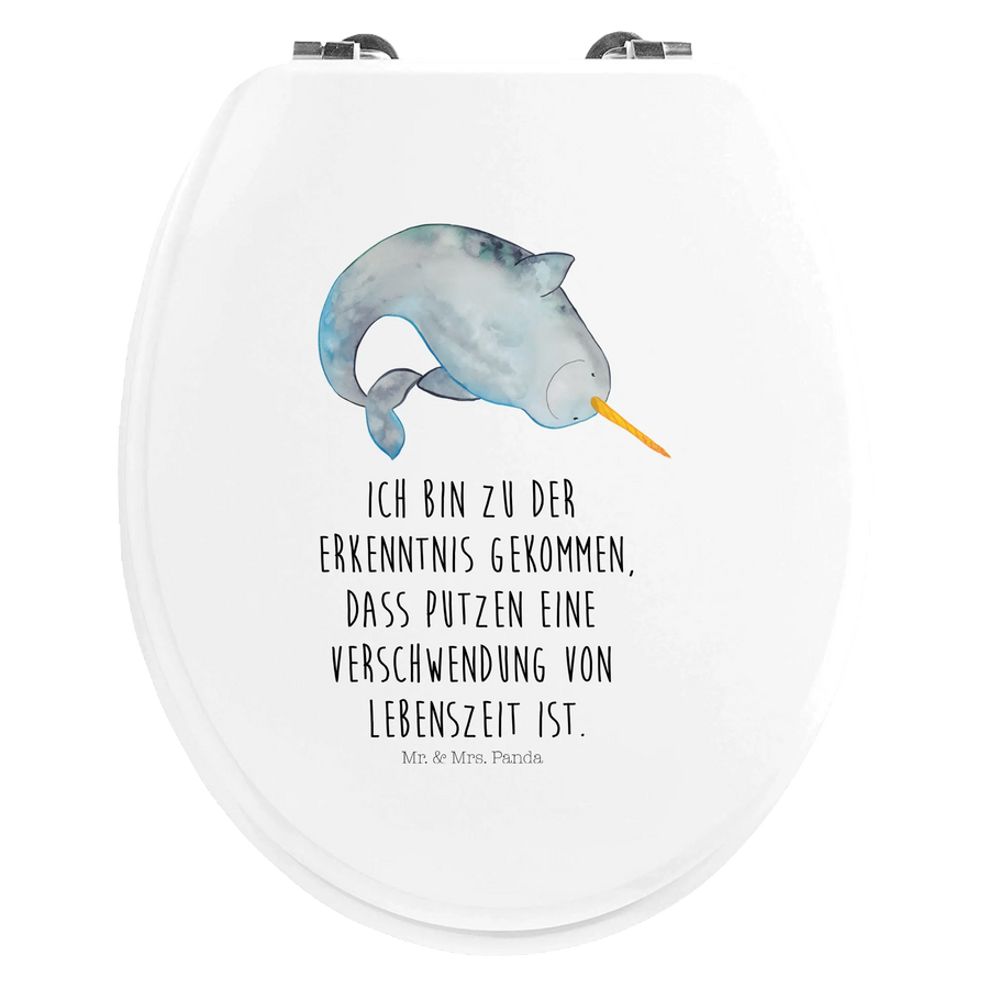 Bring das Meer ins Bad: Unser Motiv WC Sitz Narwal von Mr. & Mrs. Panda aus der liebevollen Meerestiere-Kollektion macht jedes Badezimmer sofort freundlicher. Der sanft gezeichnete Narwal in Blau- und Grautönen mit dem charakteristischen gelb-orangen Stoßzahn wirkt fröhlich und beruhigend zugleich. Ergänzt wird das Motiv durch den witzigen Spruch: „Ich bin zu der Erkenntnis gekommen, dass Putzen eine Verschwendung von Lebenszeit ist.“ – ein echter Stimmungsmacher!