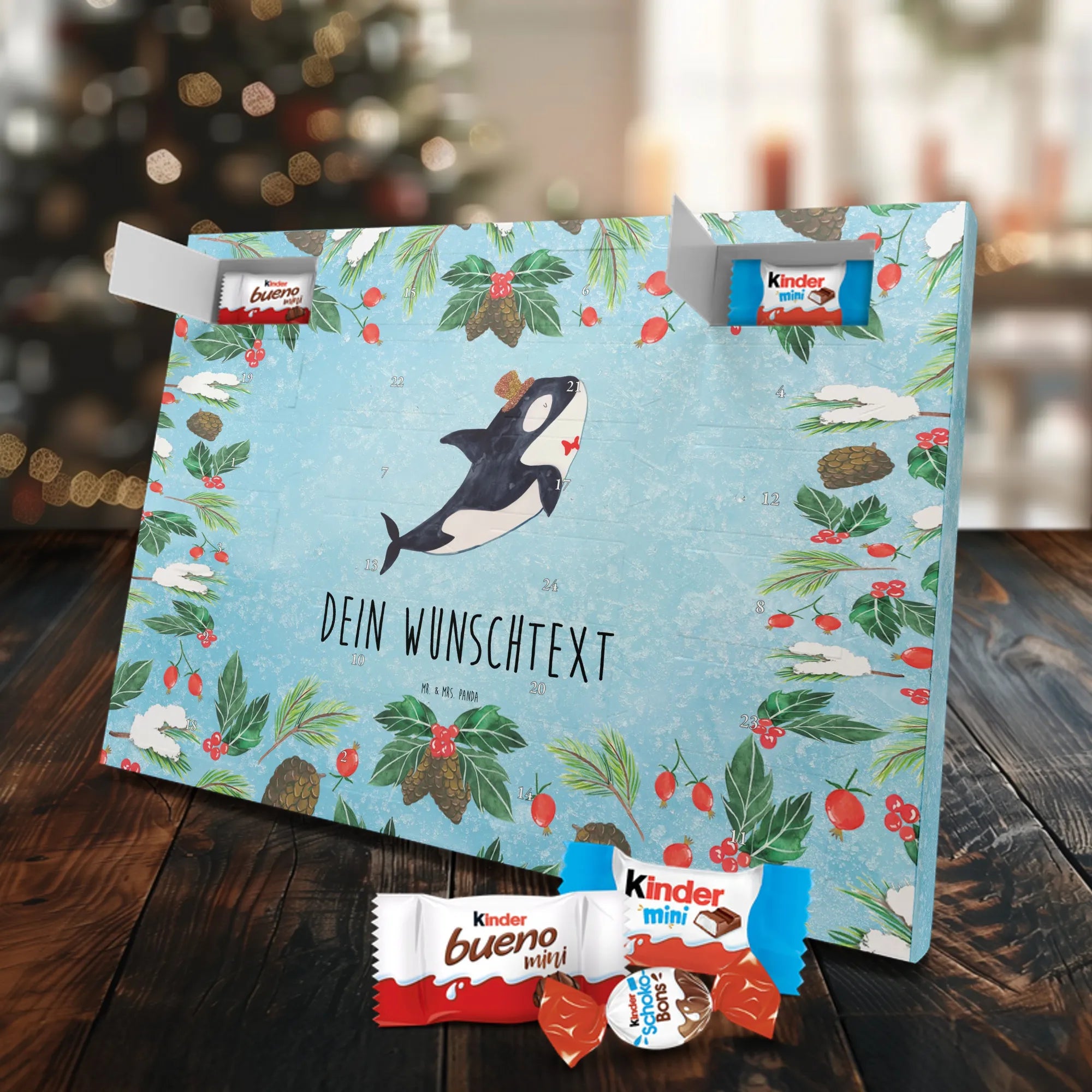 Feier die Vorfreude mit einem persönlichen Hingucker: unser Personalisierter Schoko Adventskalender von Mr. & Mrs. Panda. Dieser Kalender ist liebevoll mit wunderschönen Motiven & Sprüchen bedruckt und kann mit deinem Wunschnamen oder Wunschtext individualisiert werden – perfekt für eine persönliche Überraschung jeden Adventstag. Die brillante Druckqualität und die seidenmatte Oberflächenveredelung geben dem Kalender einen edlen Look, und die bedruckten Seitenflächen machen ihn rundum dekorativ. Besonders praktisch: der Kalender kann aufgehängt oder aufgestellt werden, je nachdem, wie du ihn präsentieren möchtest. Maße: 355 mm x 245 mm x 11 mm – ein ideales Format für dekorative Platzierung und genügend Raum für leckere Türchenüberraschungen. Gefüllt mit kinder® Schokolade: Adventskalender gefüllt mit kinder® Schokolade; Inhalt: kinder® Schoko-Bons, kinder® Bueno mini und kinder® Schokolade mini. Ob als Geschenk für Kinder, Partner oder beste Freunde – mit Mr. & Mrs. Panda verschenkst du nicht nur Süßes, sondern echte Vorfreude und liebevolle Gestaltung.