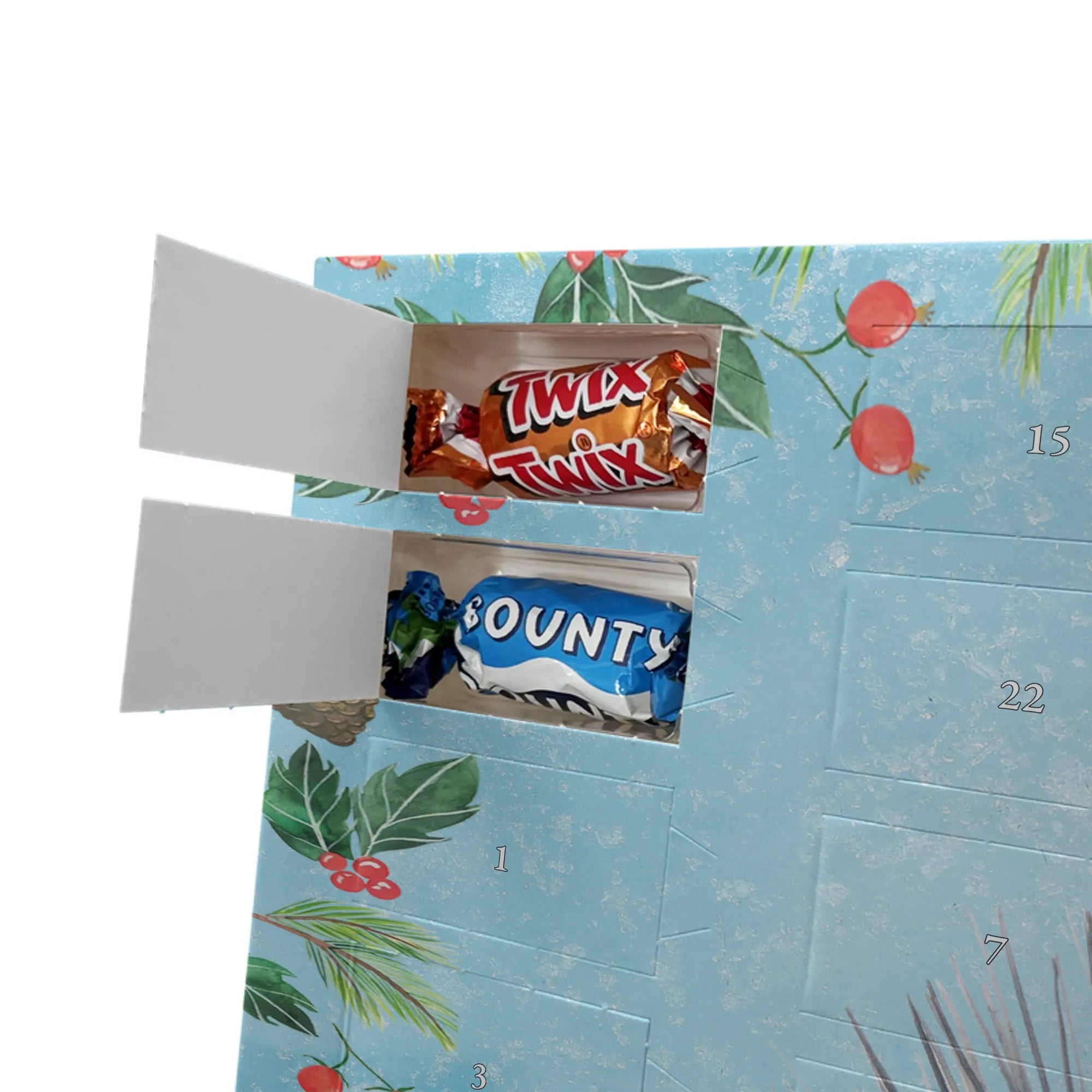 Unser Celebrations Adventskalender von Mr. & Mrs. Panda ist die süße Art, die Tage bis Weihnachten zu zählen. Liebevoll gestaltete Motive und herzliche Sprüche machen jeden Öffnungsmoment besonders. Die brillante Druckqualität zusammen mit einer seidenmatten Oberflächenveredelung sorgt für strahlende Farben und eine angenehme Haptik; auch die Seitenflächen sind bedruckt, damit alles rundum hübsch aussieht. Der Kalender ist nicht personalisierbar. Innen erwarten dich 24 hochwertige Celebrations-Füllungen in acht verschiedenen Sorten: Maltesers, Mars, Snickers, Twix, Milky Way, Bounty, Galaxy und Galaxy Caramel — abwechslungsreicher Genuss für jeden Tag. Als Extra kannst du den Kalender entweder einfach hinstellen oder an die Wand hängen. Maße: 325 mm x 225 mm x 27 mm. Ein ideales Geschenk für alle, die Freude an schönen Details und kleinen Süßigkeiten haben.