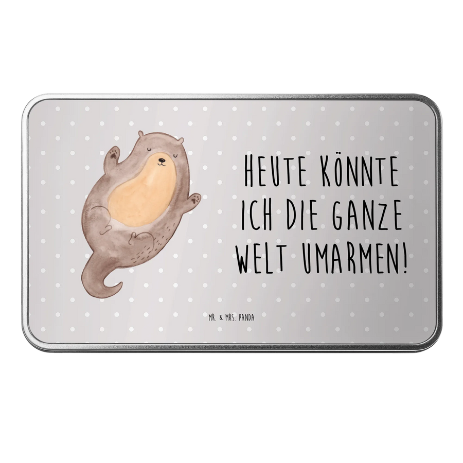 Entdecke die wunderschöne Metalldose rechteckig mit dem niedlichen Motiv 'Otter Umarmen' aus der Otter-Kollektion von Mr. & Mrs. Panda. Diese liebevoll gestaltete Dose zeigt einen fröhlichen Otter, der auf dem Rücken schwimmt und seine Arme weit ausbreitet, um die Welt zu umarmen. Der dazugehörige Spruch 'Heute könnte ich die ganze Welt umarmen!' strahlt pure Lebensfreude und Positivität aus, was sie zum perfekten Geschenk für viele Anlässe macht.