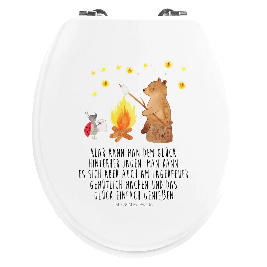 Entdecke den bezaubernden Motiv WC Sitz "Bär & Marienkäfer Lagerfeuer" von Mr. & Mrs. Panda – der perfekte Begleiter für dein Badezimmer! Dieser Toilettendeckel ist nicht nur ein funktionales Element, sondern auch ein liebevoll gestaltetes Accessoire, das Lebensfreude und Wärme in dein Zuhause bringt. Auf ihm sitzt ein fröhlicher Bär, der gemütlich an einem Lagerfeuer mit einem Marienkäfer plaudert, während die Sterne am nächtlichen Himmel funkeln. Mit dem Slogan "Klar kann man dem Glück hinterher jagen. Man kann es sich aber auch am Lagerfeuer gemütlich machen und das Glück einfach genießen." vermittelt dieser WC-Sitz eine Botschaft der Entspannung und des Genießens, die jedem Besucher ein Lächeln ins Gesicht zaubert.
