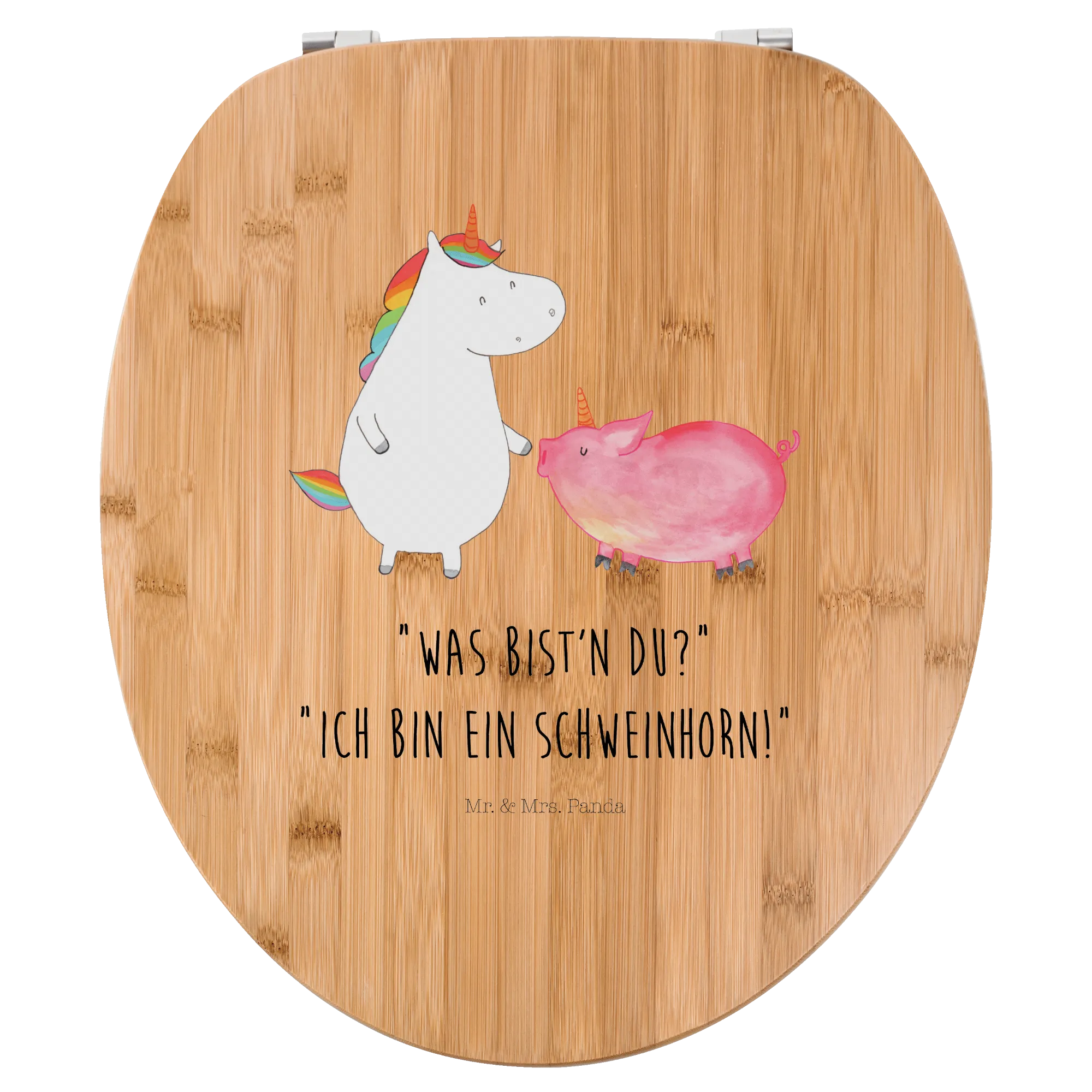 Unser Toilettendeckel zeigt ein süßes Schweinchen mit Einhorn auf dem Kopf, das ein Einhorn anschaut – und dazu den frechen Spruch: „Was bist'n du? / Ich bin ein Schweinhorn.“ Ein Motiv, das sofort für ein Lächeln sorgt und das Badezimmer liebevoll aufpeppt.