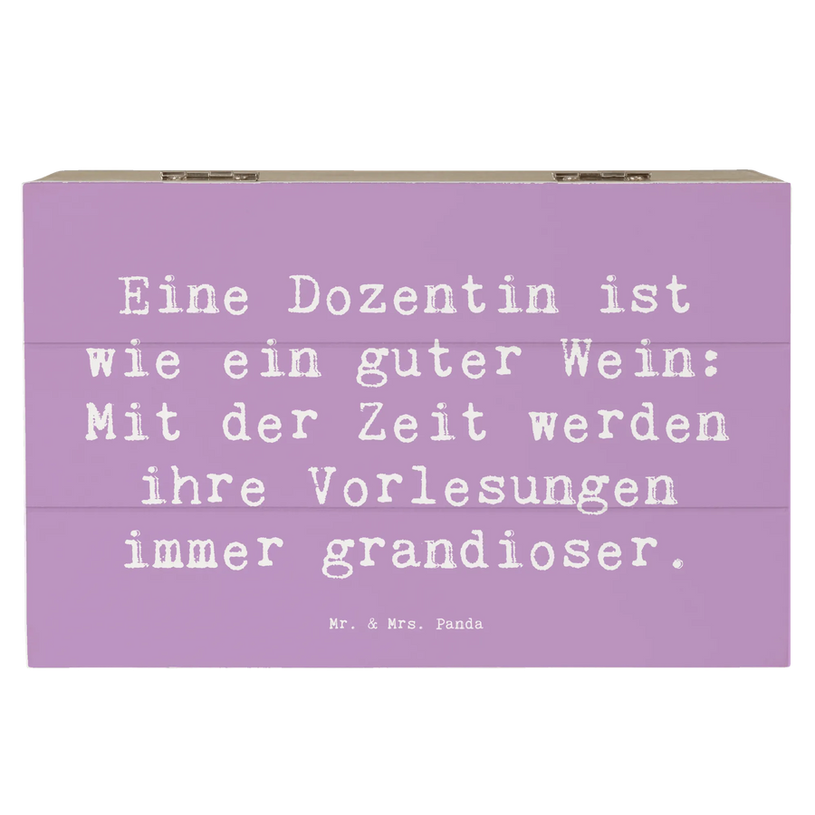 Entdecke unsere bezaubernde Holzkiste mit dem Motto "Eine Dozentin ist wie ein guter Wein: Mit der Zeit werden ihre Vorlesungen immer grandioser." von Mr. & Mrs. Panda! Diese wunderschöne Holzkiste ist der perfekte Aufbewahrungsort für all deine Schätze. Ob persönliche Erinnerungen, besondere Geschenke oder kleine Dekorationen - diese Kiste bietet nicht nur Platz, sondern auch einen charmanten Anblick.