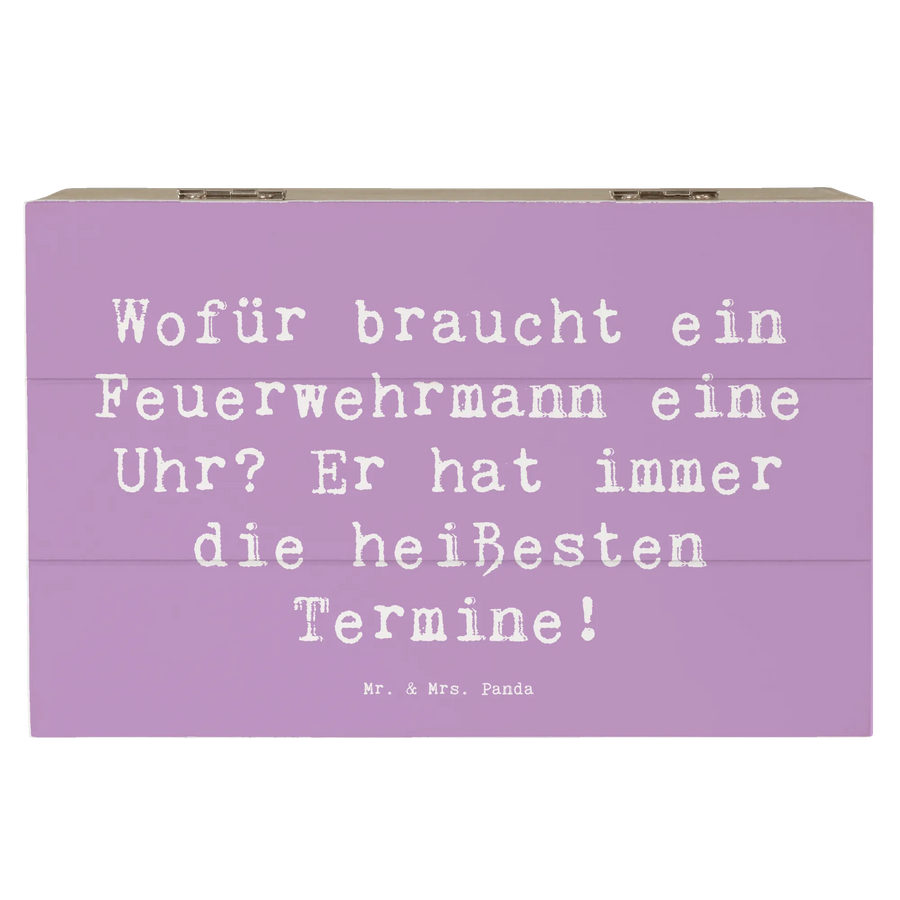 Unsere wundervolle Holzkiste Feuerwehrmann von Mr. & Mrs. Panda ist das perfekte Geschenk für alle, die sich für diesen mutigen Beruf begeistern! Mit dem liebevollen Spruch "Wofür braucht ein Feuerwehrmann eine Uhr? Er hat immer die heißesten Termine!" macht diese Schatzkiste nicht nur optisch etwas her, sondern bringt auch eine humorvolle Note mit sich.