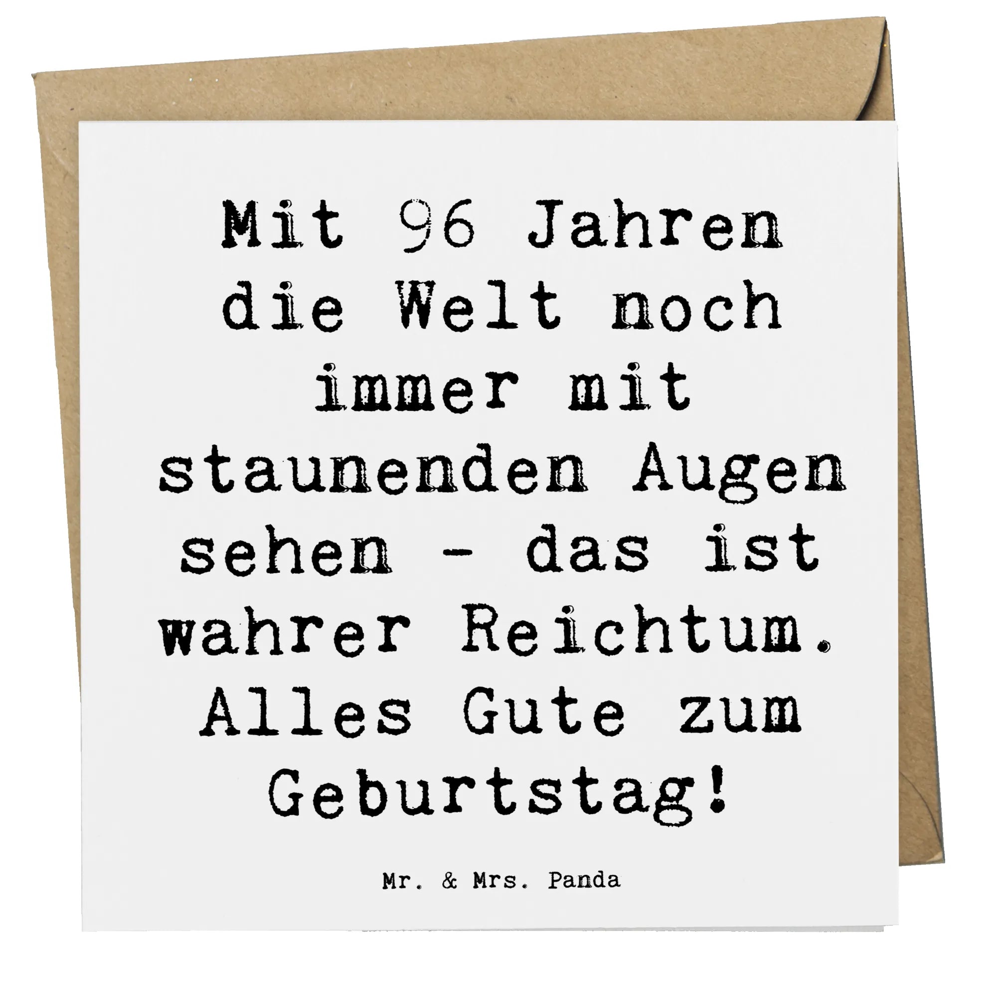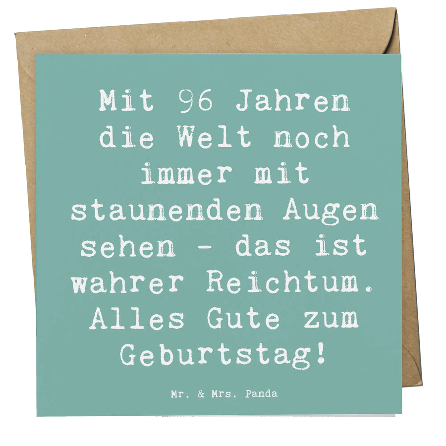 Die Deluxe Karte zum 96. Geburtstag von Mr. & Mrs. Panda ist die perfekte Wahl, um einem lieben Menschen zu gratulieren. Mit einem zauberhaften Spruch "Mit 96 Jahren die Welt noch immer mit staunenden Augen sehen - das ist wahrer Reichtum. Alles Gute zum Geburtstag!" sorgt diese Karte für Freude und ein Lächeln beim Beschenkten.